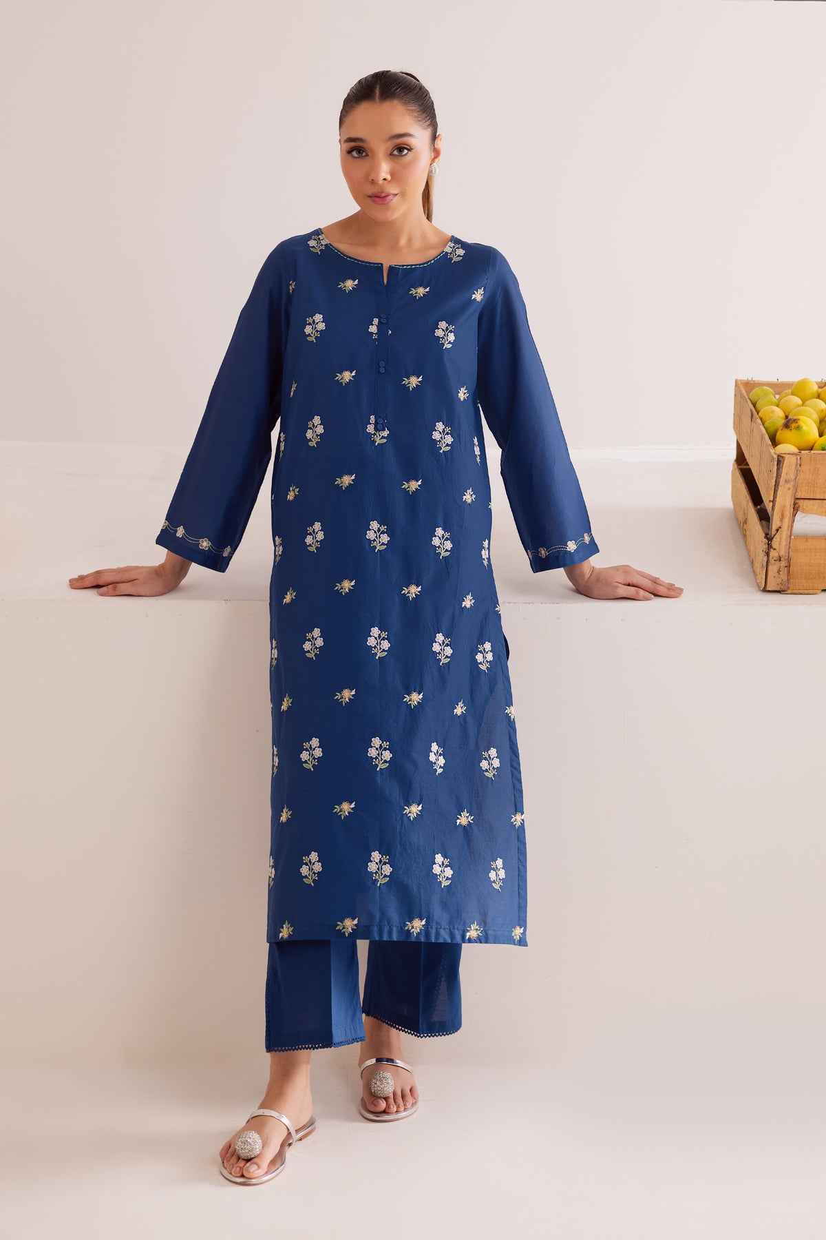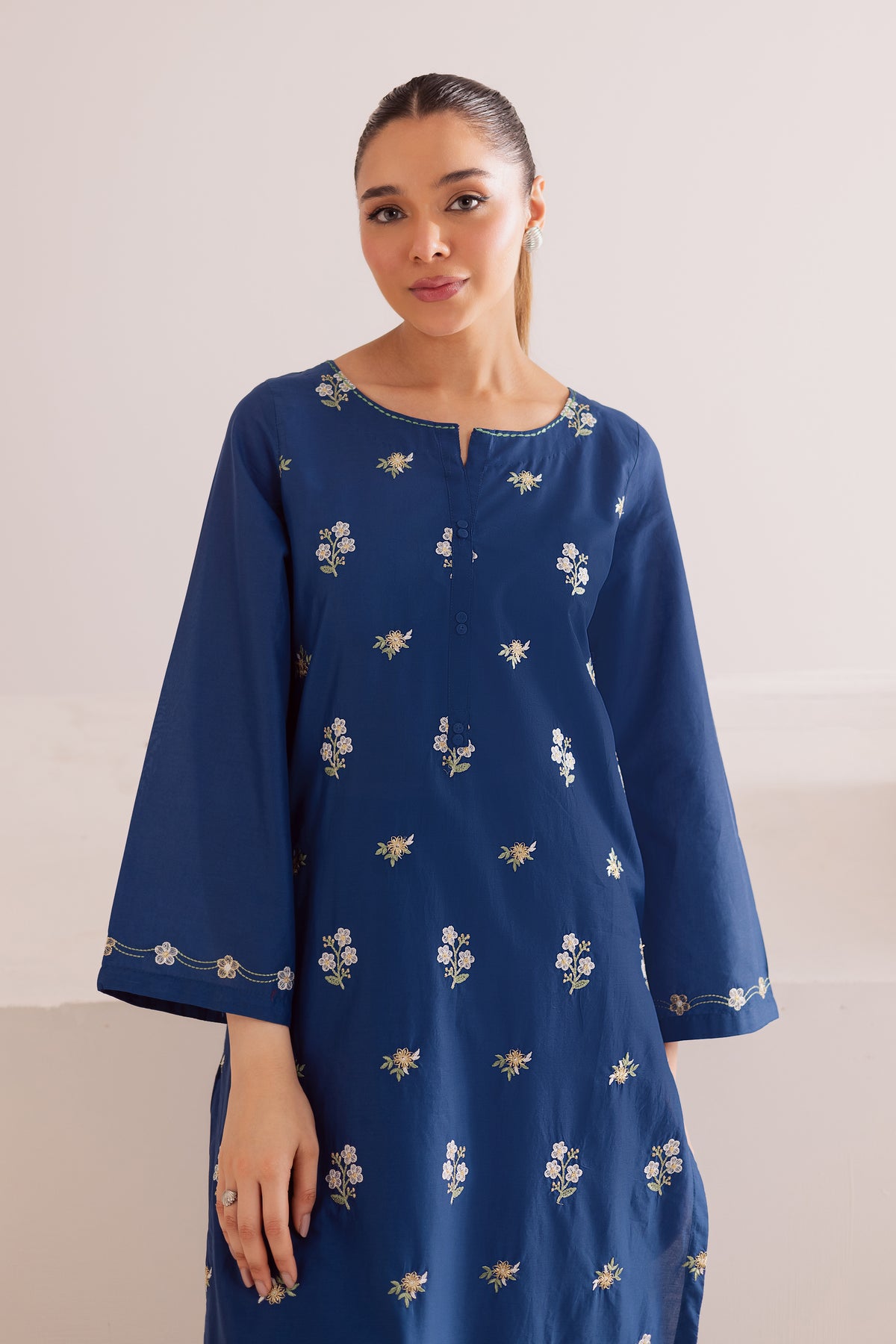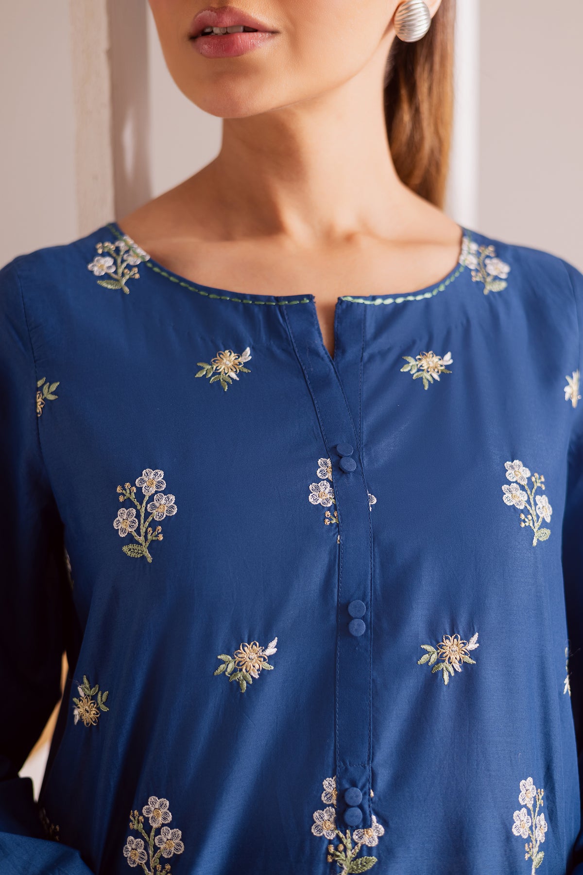 This royal blue pima lawn co-ord set brings effortless charm to your wardrobe with its striking color and elegant detailing. The shirt features a graceful spread of floral embroidery across the front, adding a refreshing pop of texture and sophistication. Finished with intricate embroidery on the sleeve hems, the look is both polished and contemporary.