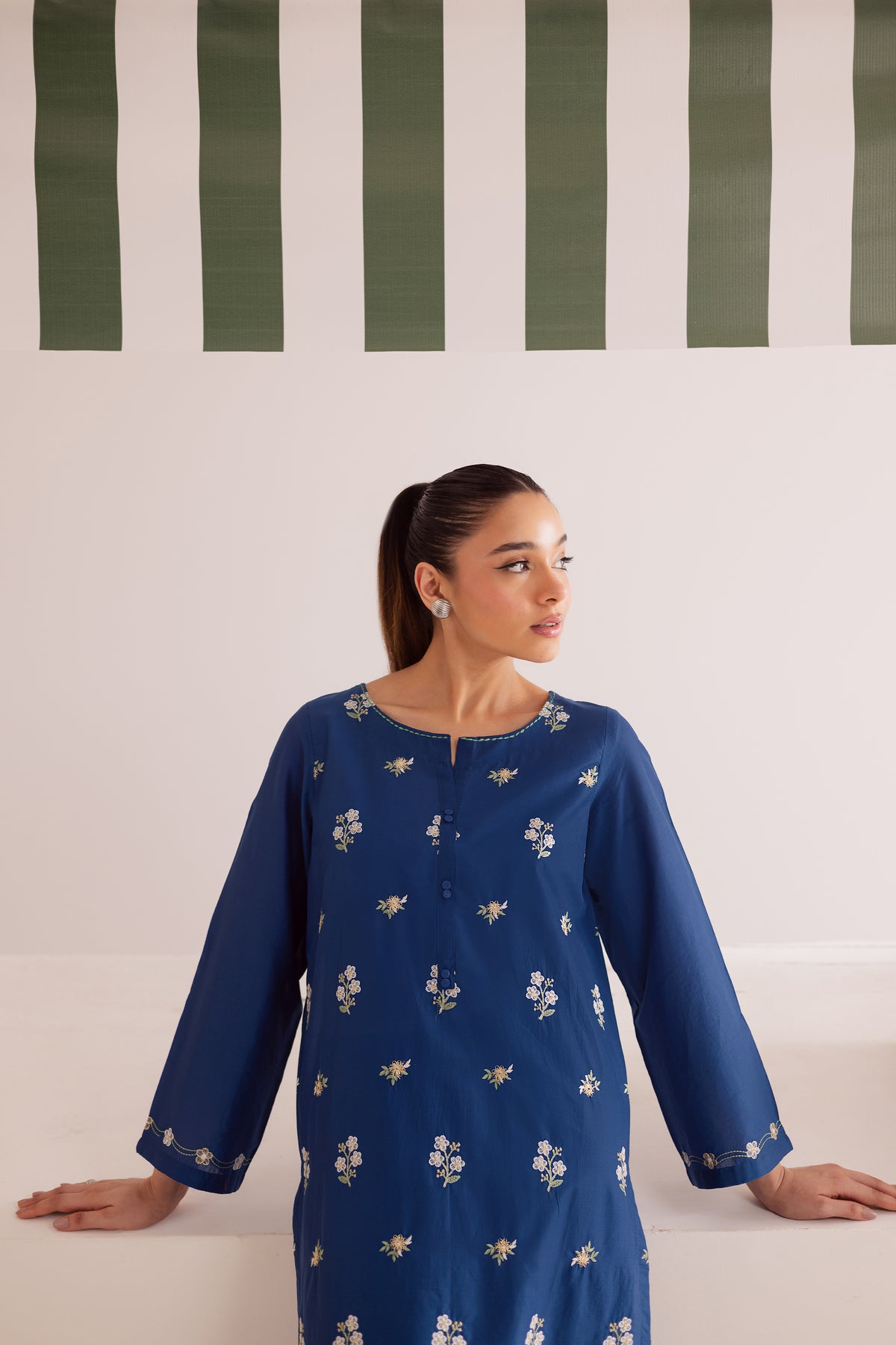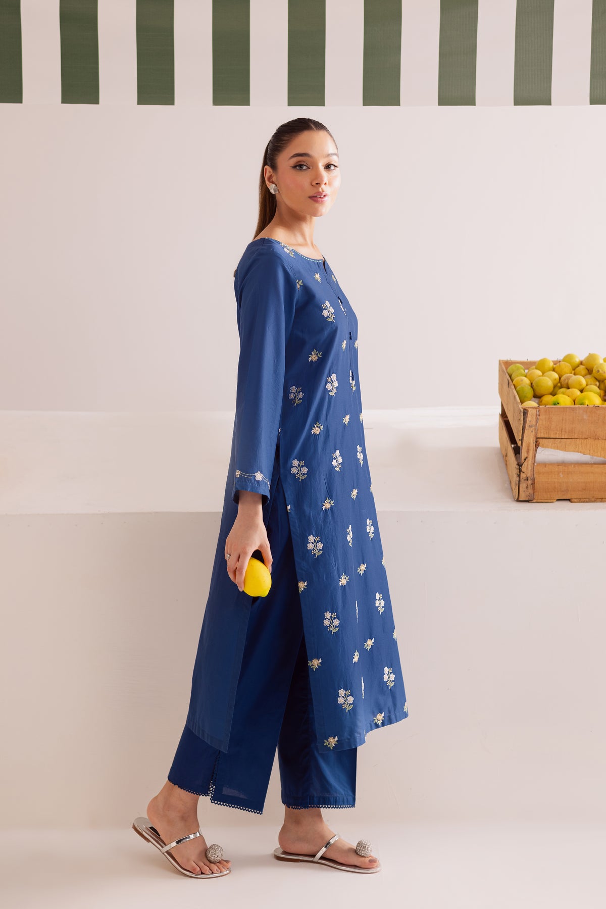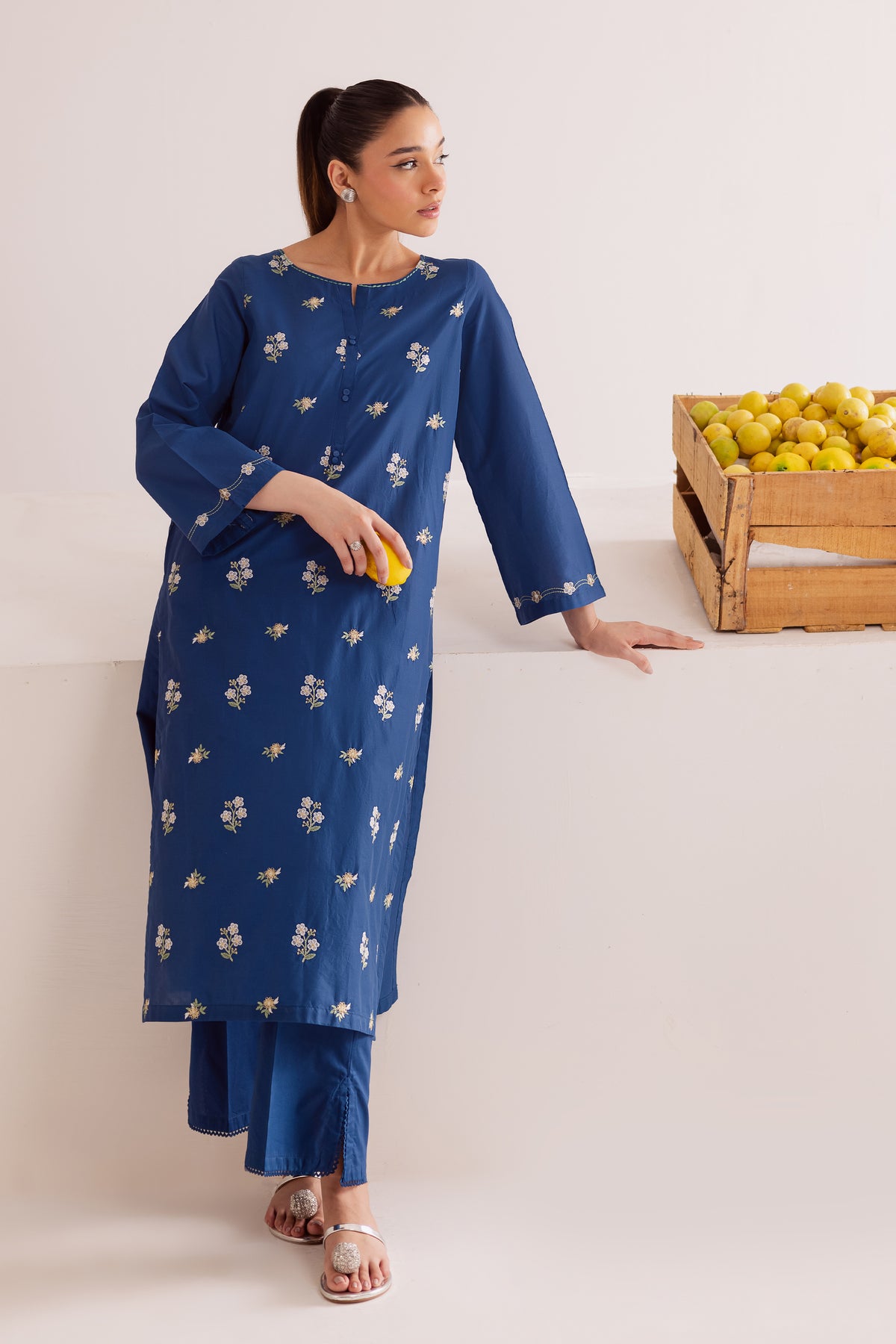 This royal blue pima lawn co-ord set brings effortless charm to your wardrobe with its striking color and elegant detailing. The shirt features a graceful spread of floral embroidery across the front, adding a refreshing pop of texture and sophistication. Finished with intricate embroidery on the sleeve hems, the look is both polished and contemporary.