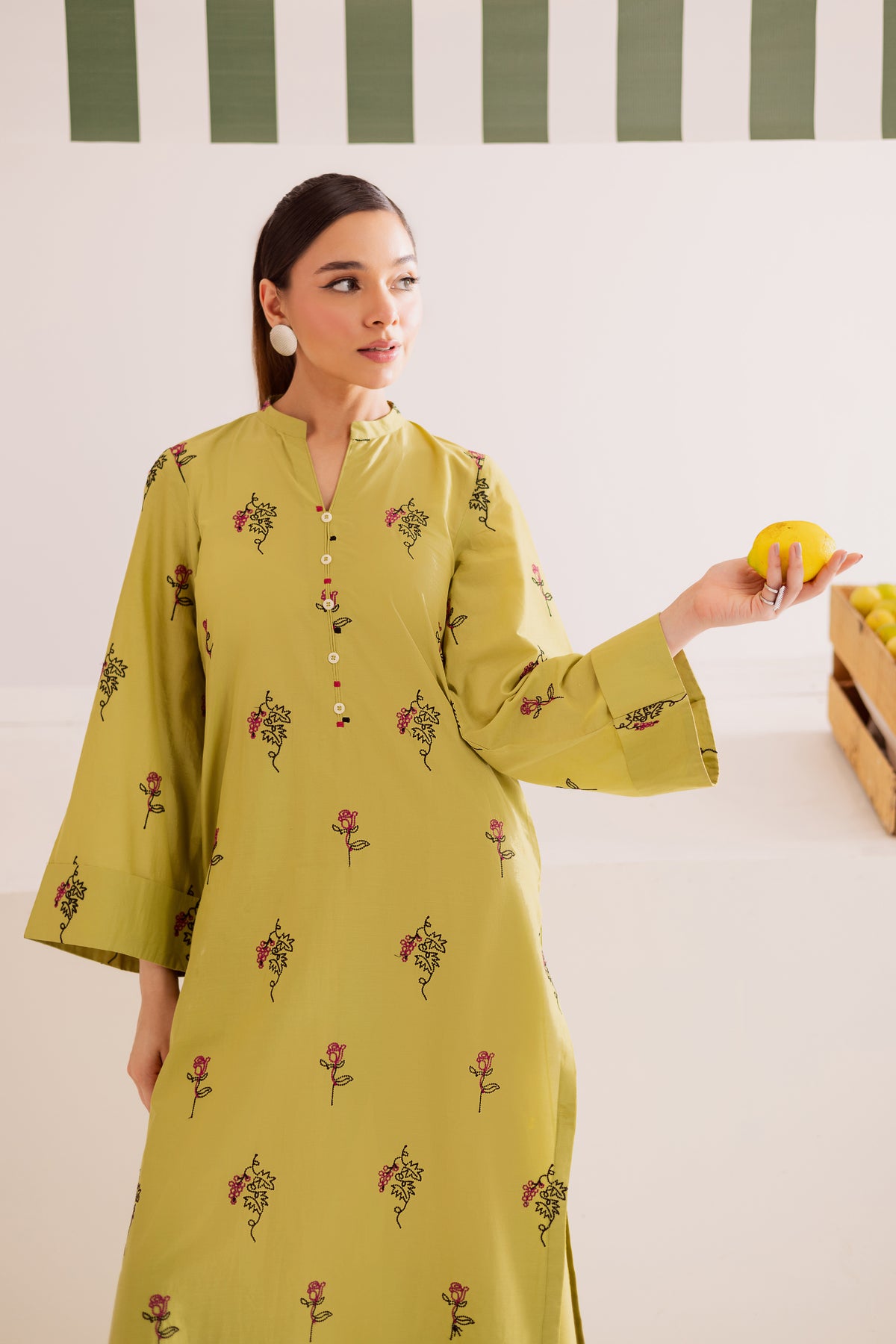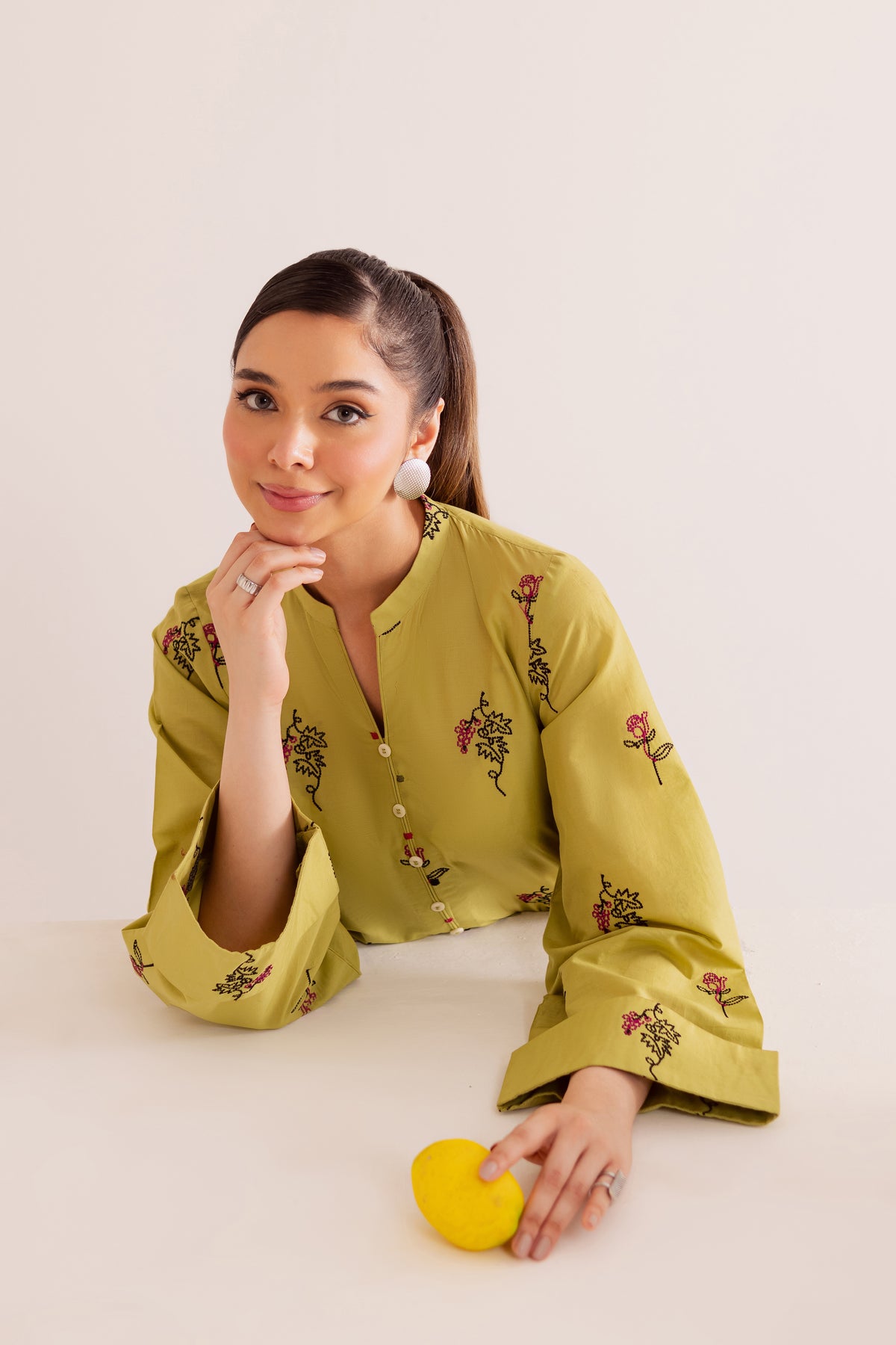 The moss green pima lawn co-ord set features a sophisticated shirt adorned with contemporary grape embroidery in delicate dotted stitch. Button and thread detailing on the neckline placket add a refined accent, elevating the clean silhouette with subtle charm.