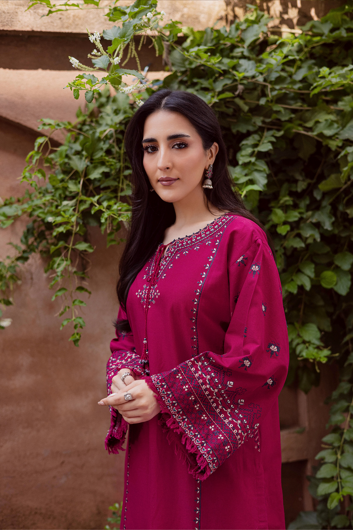 Step out in style with the Crossword two-piece khaddar set, featuring a drop shoulder paneled khaddar shirt adorned with intricate cross-stitch embroidery. The sleeves are finished with delicate fringes, while thread-embellished tassels accent the neckline, adding a playful yet elegant touch.