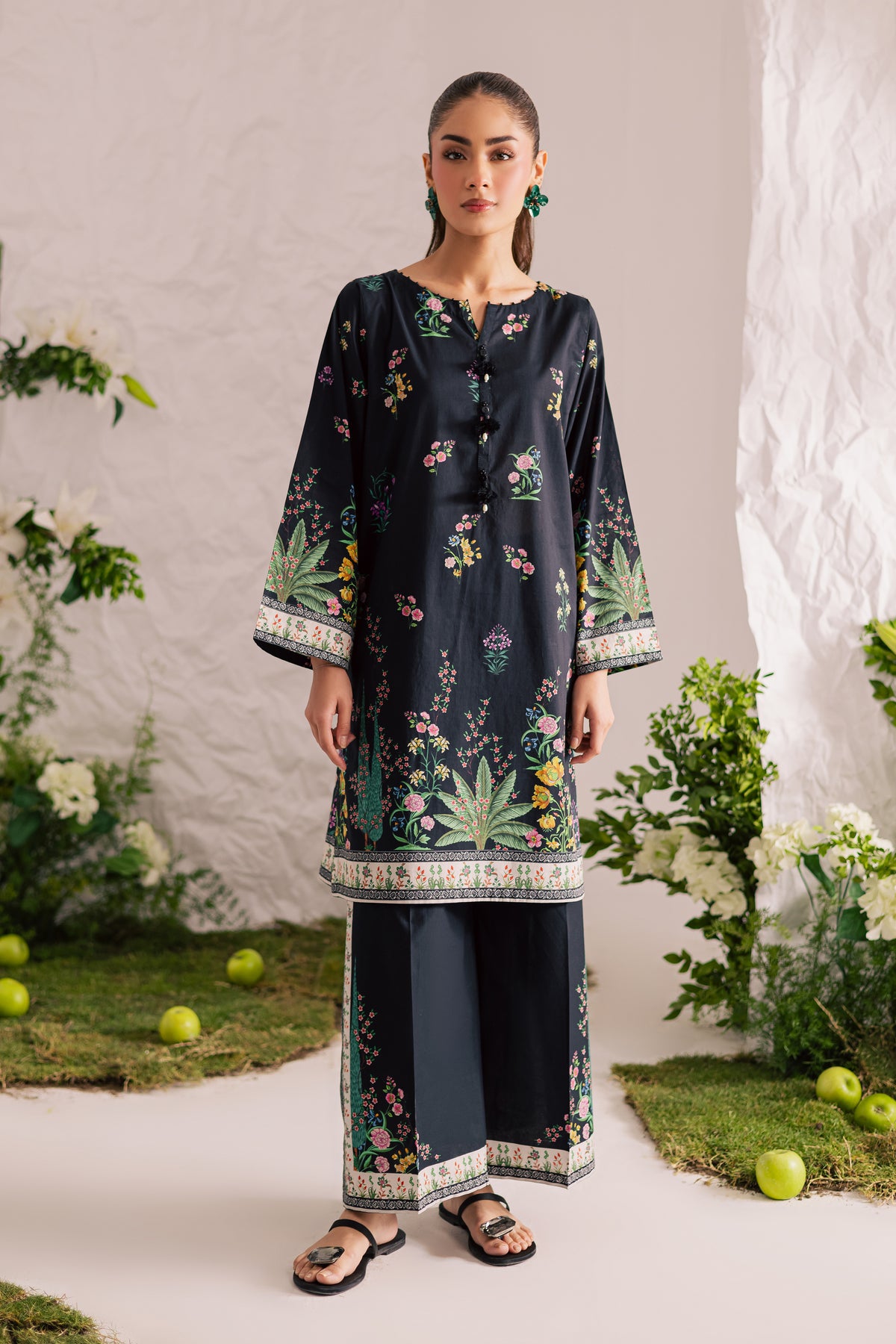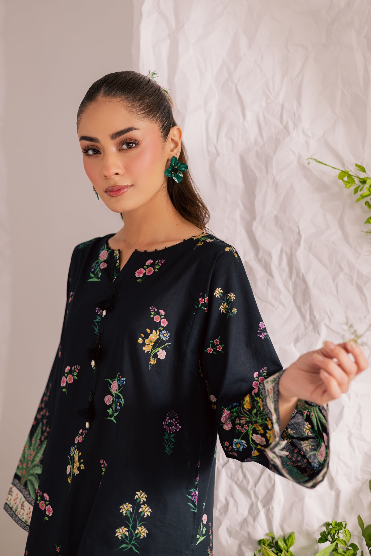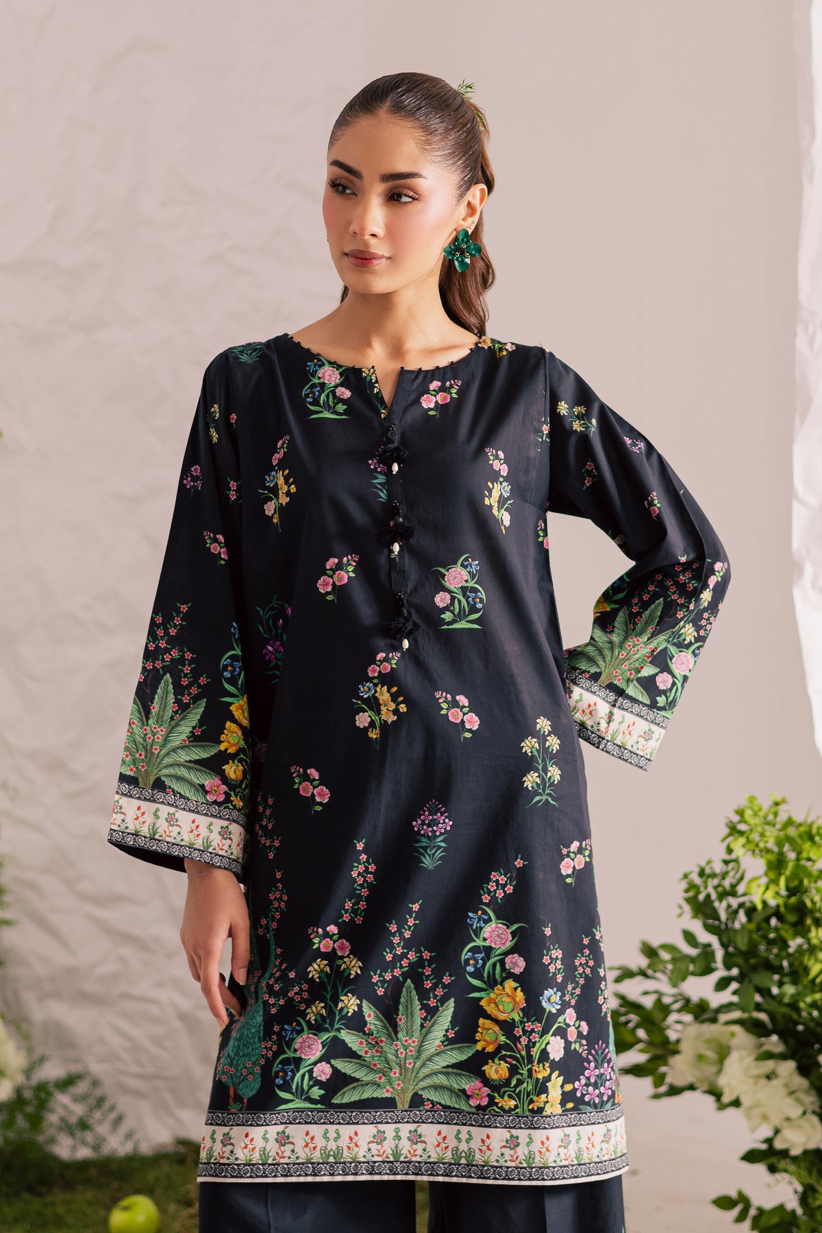 This mid-length black lawn printed shirt features a round neckline with a V-slit, elegantly finished with a collage of black beads that adds a touch of subtle glam to the design. The intricate detailing enhances the overall sophistication of the look.
