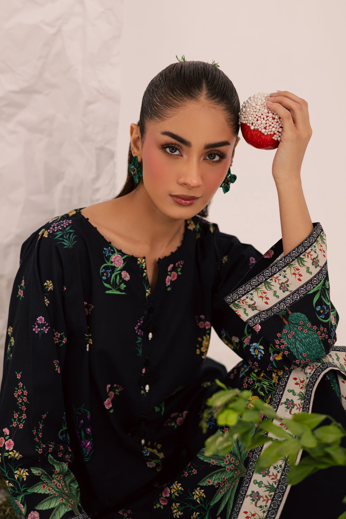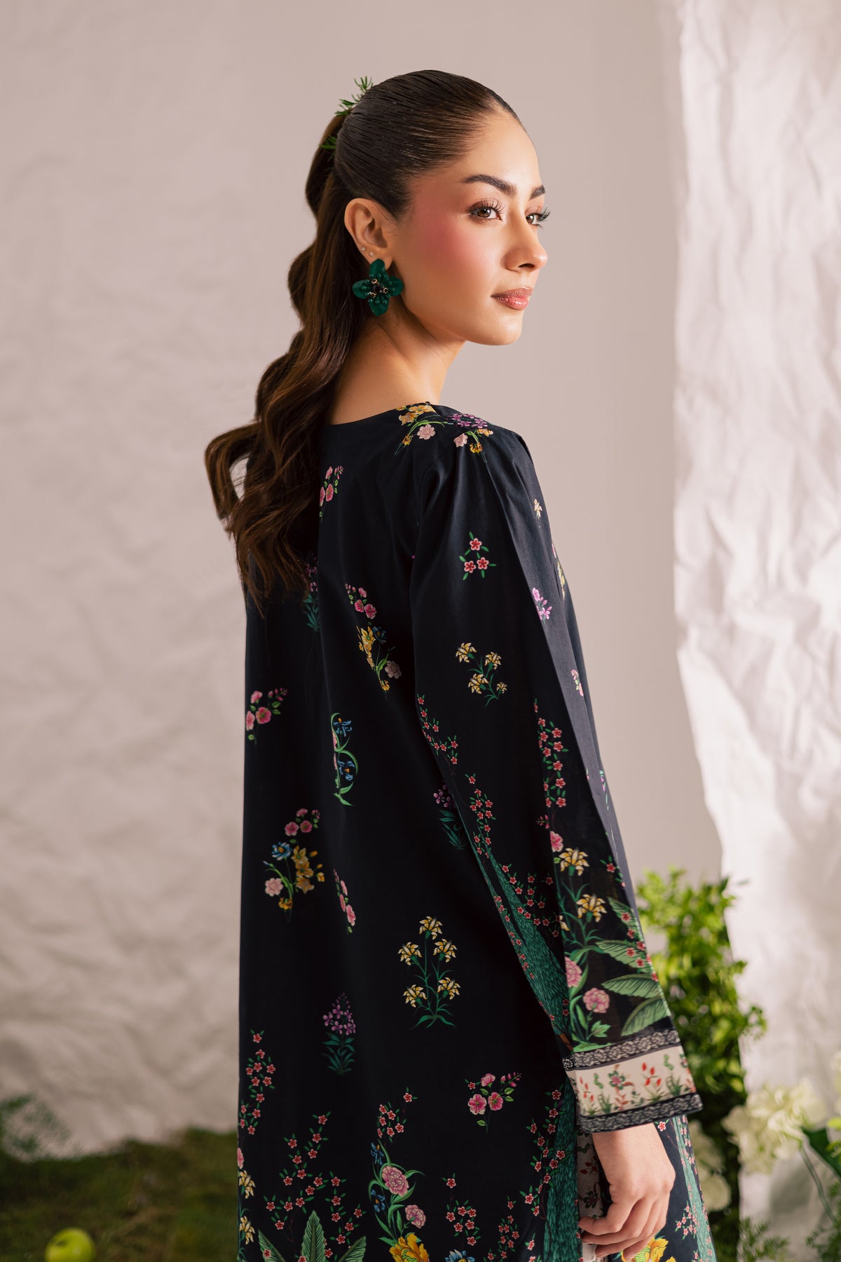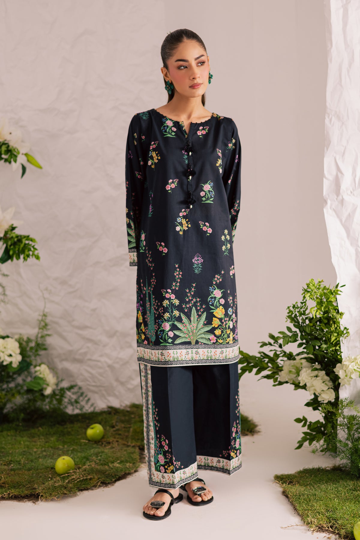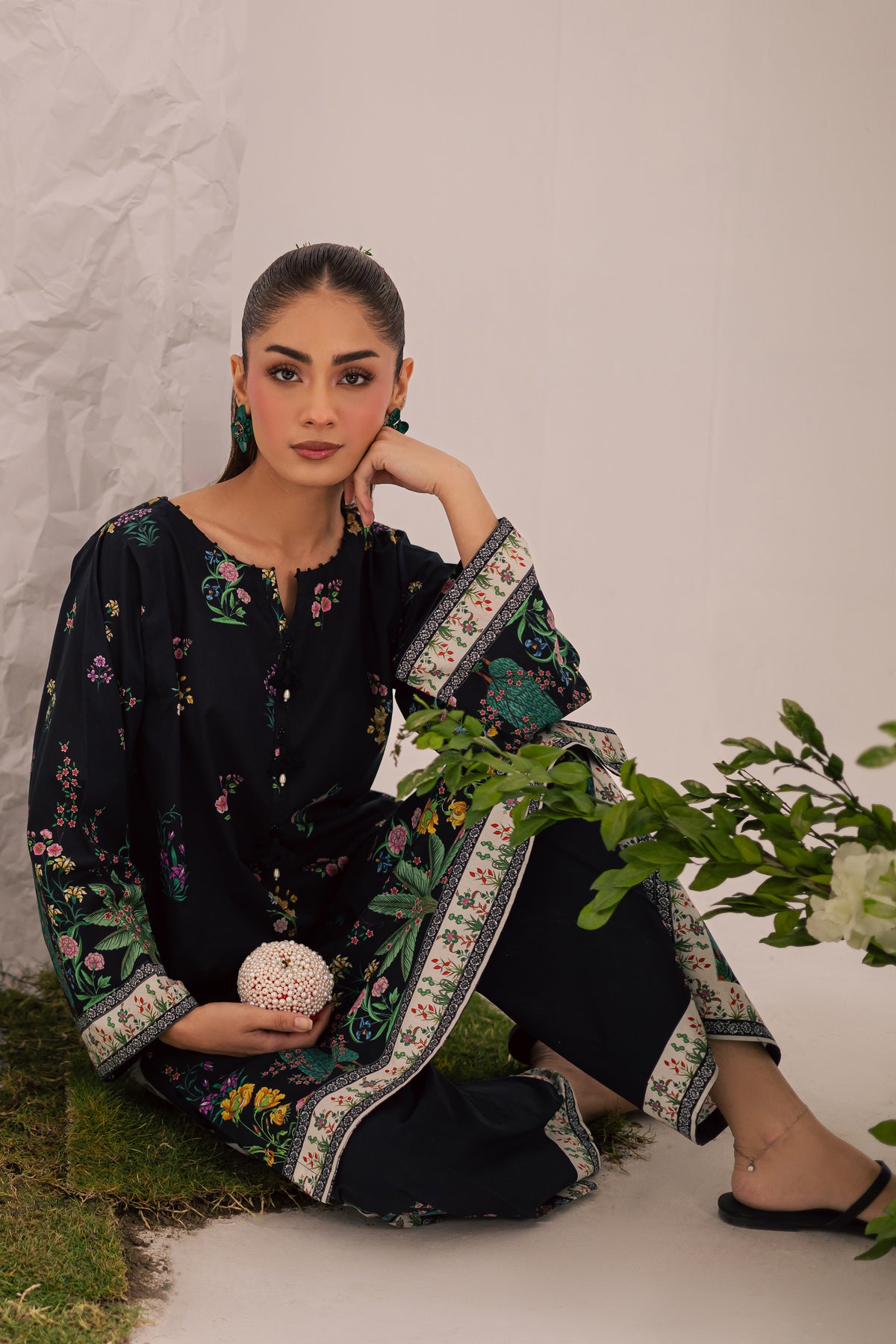 This mid-length black lawn printed shirt features a round neckline with a V-slit, elegantly finished with a collage of black beads that adds a touch of subtle glam to the design. The intricate detailing enhances the overall sophistication of the look.