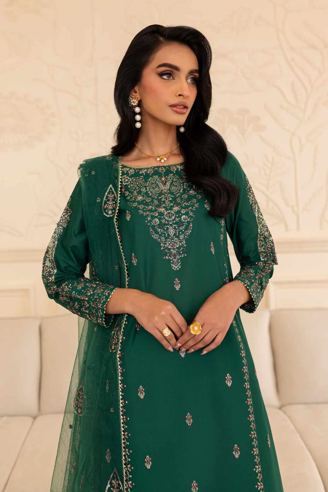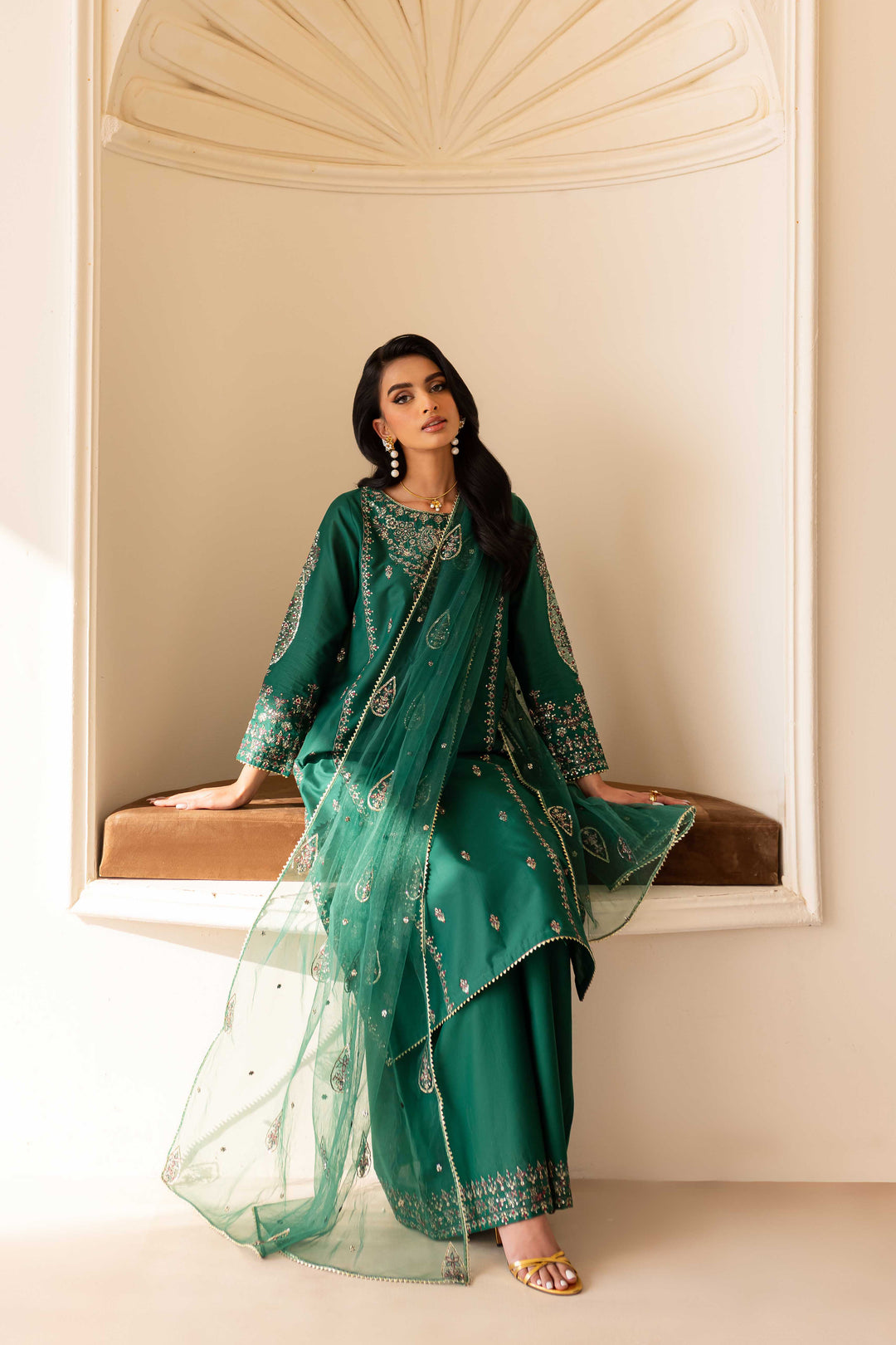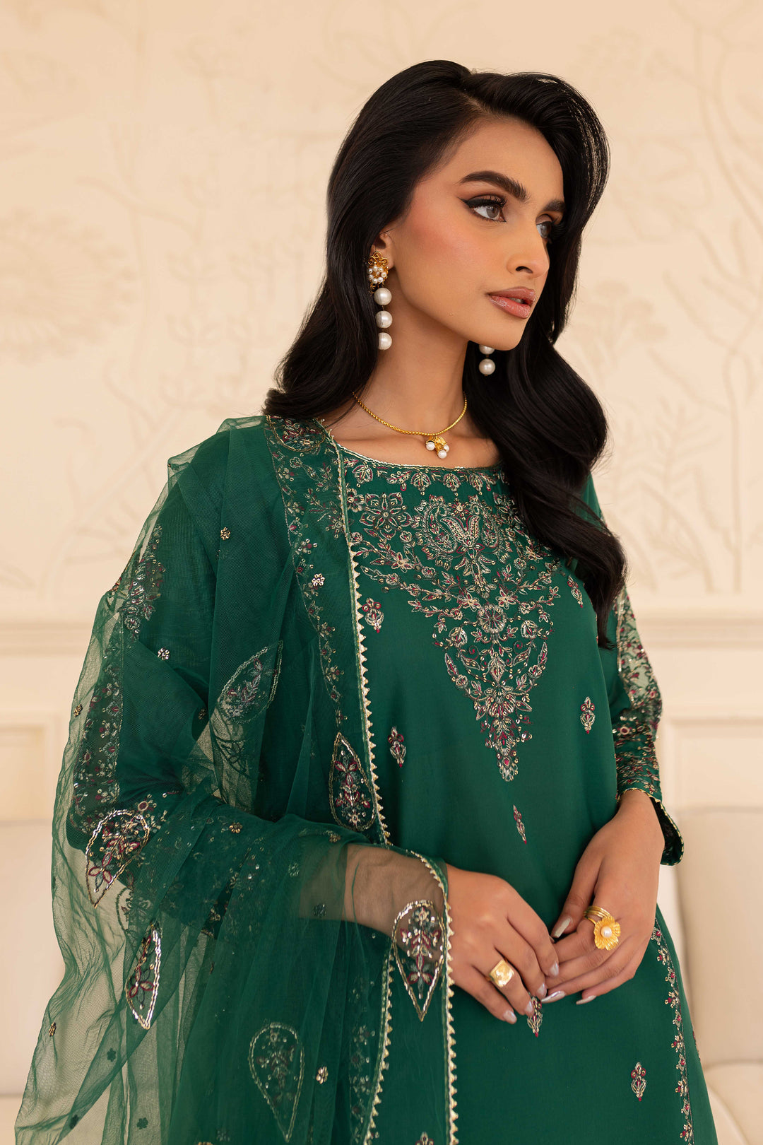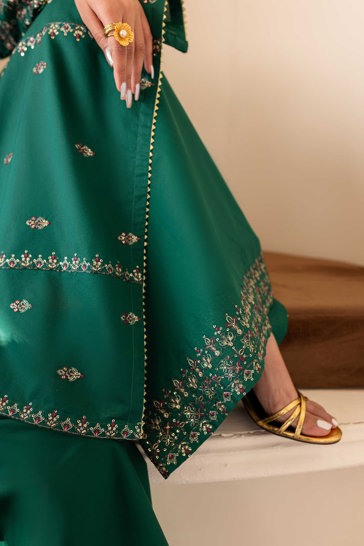 This green pima lawn shirt is fully embroidered paneled shirt is meticulously crafted with intricate details, offering a refined and elegant look. It is finished with fancy lace, adding a delicate and sophisticated touch that enhances the overall beauty of the shirt.
