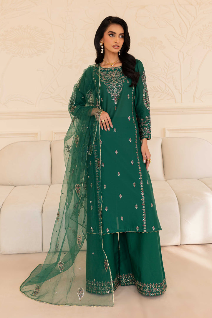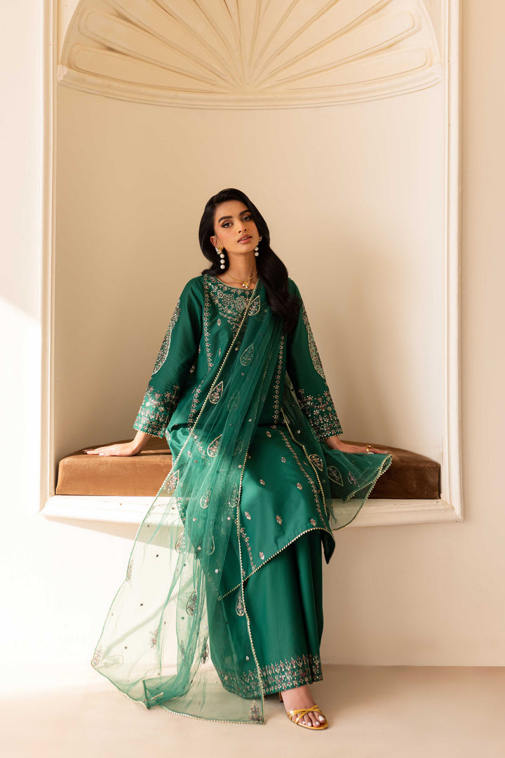 The outfit is completed with an embroidered net dupatta, offering an airy, ethereal quality. The delicate embroidery on the dupatta adds texture and depth, creating a seamless, graceful finish to this elegant ensemble.