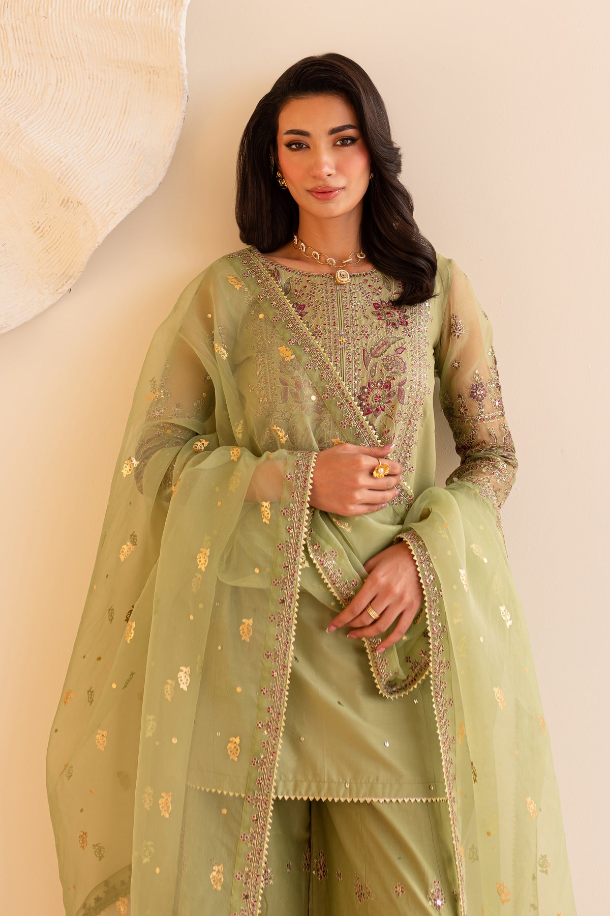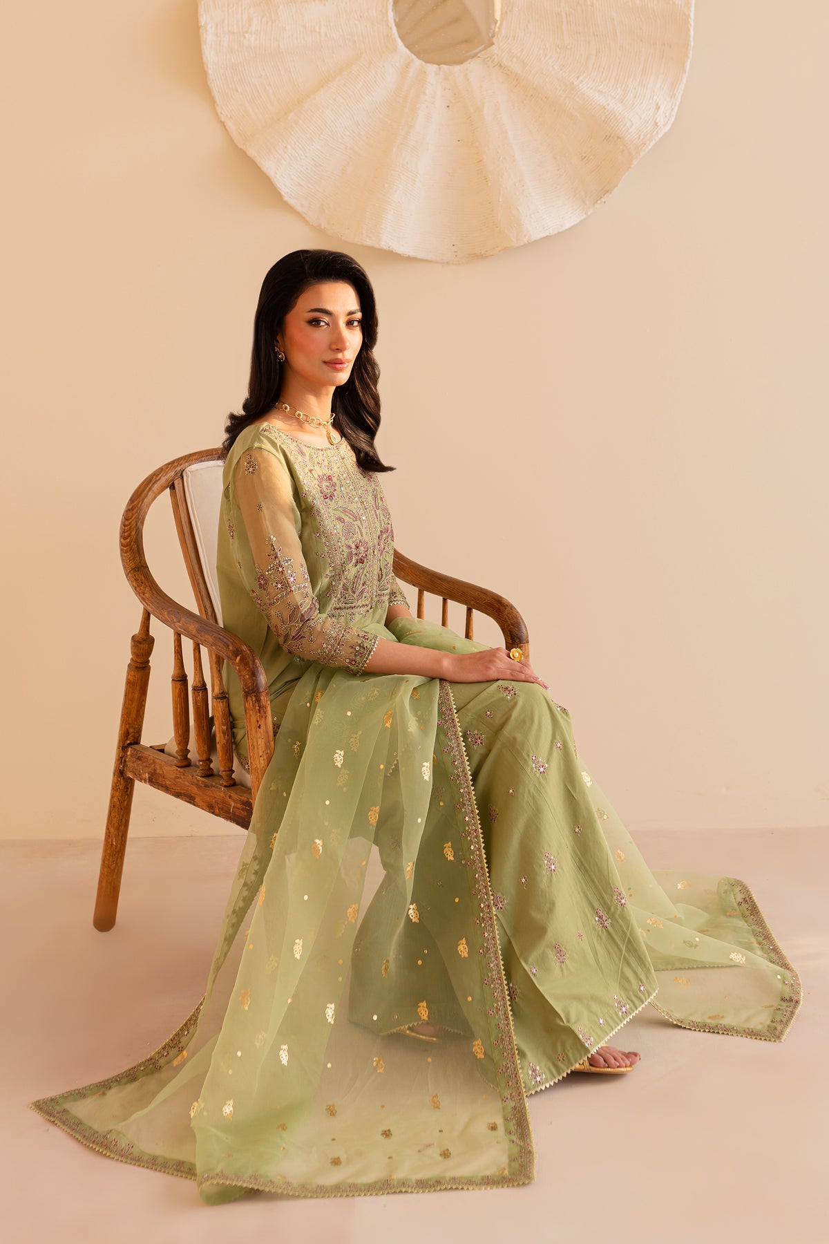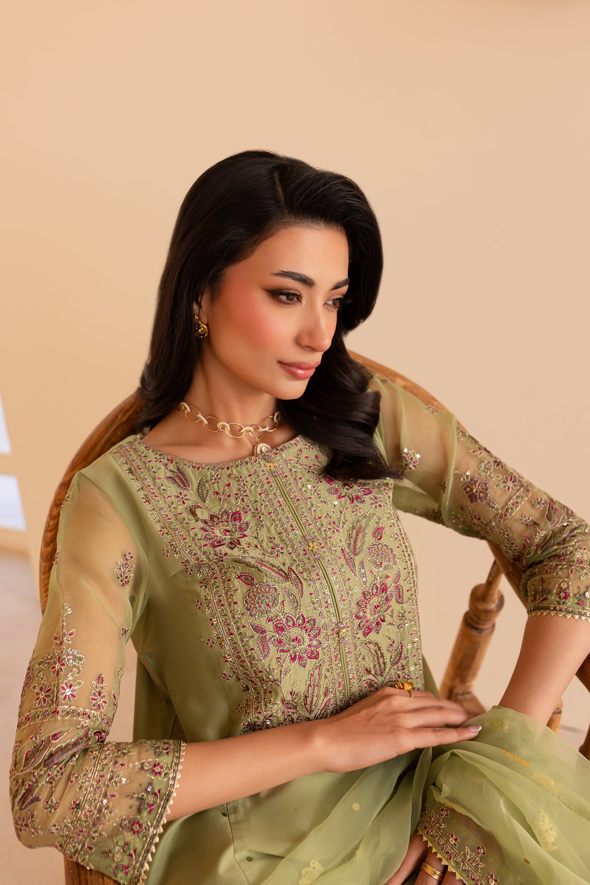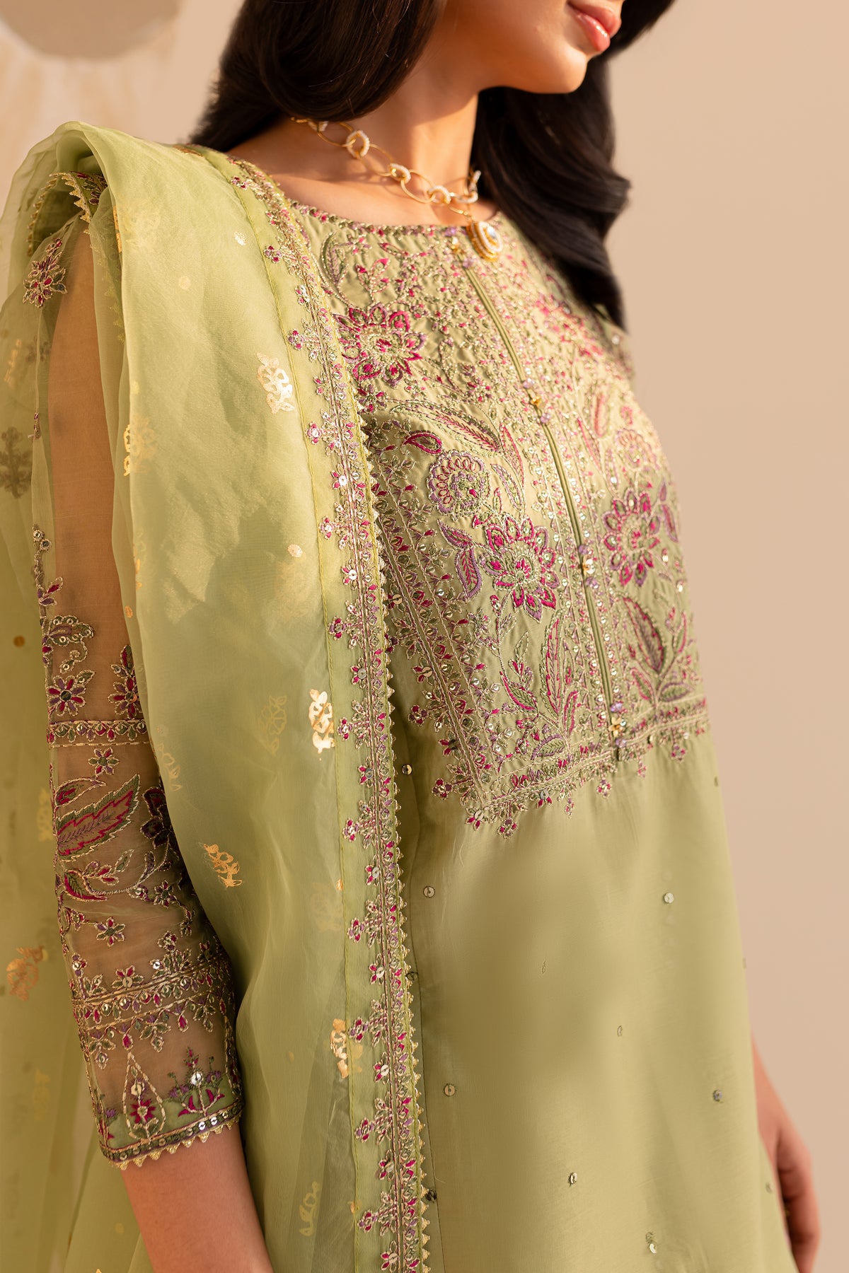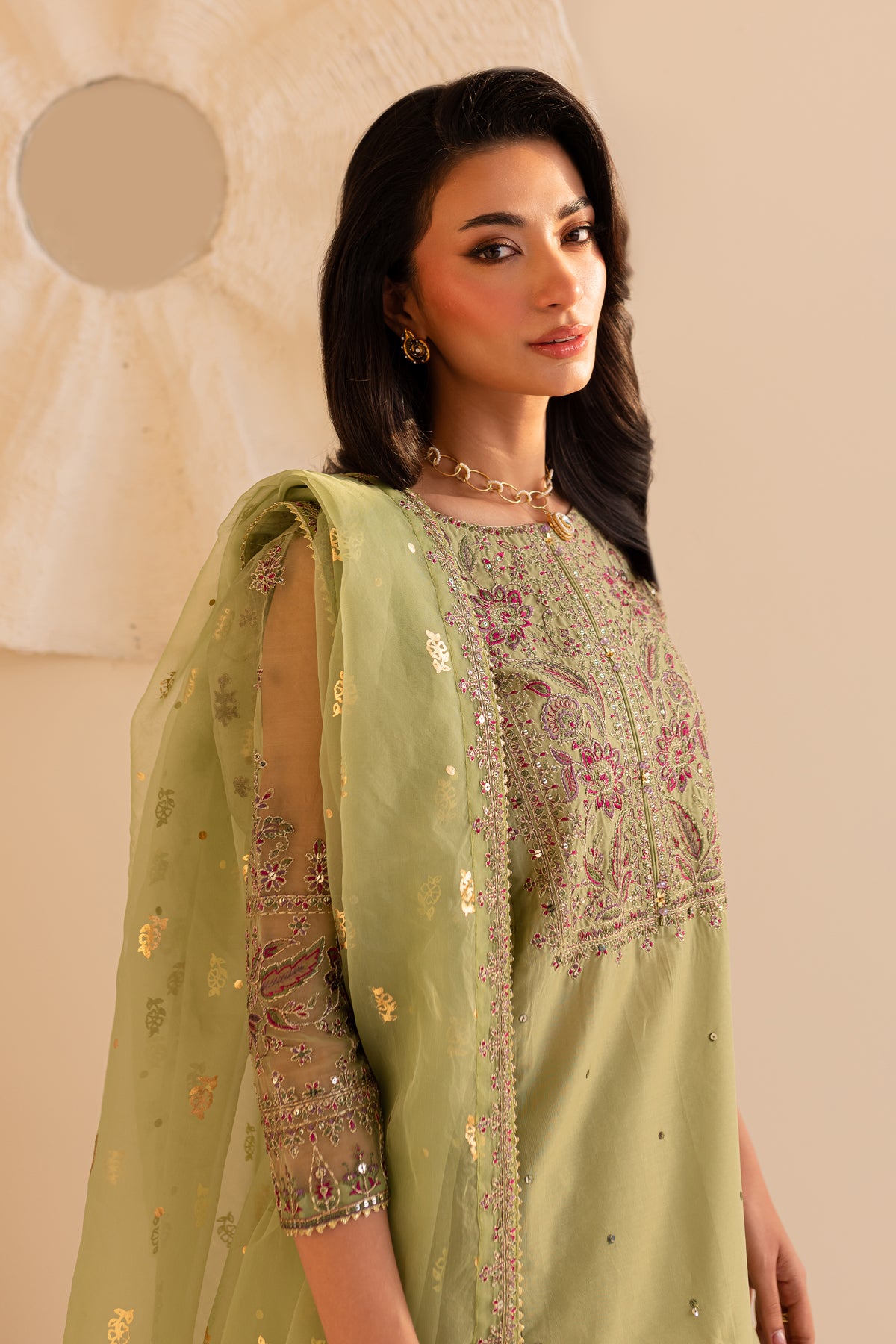 The 3-piece dress in green yellow shade features a short paneled pima lawn shirt with an intricate neckline, beautifully complemented by organza embroidered borders and contrasting embroidered work. The organza sleeves are adorned with tilla work on the sleeves adding that ethereal touch to the shirt. The shirt is further embellished with tilla laces and crystal collages, adding sparkle and opulence to the design.