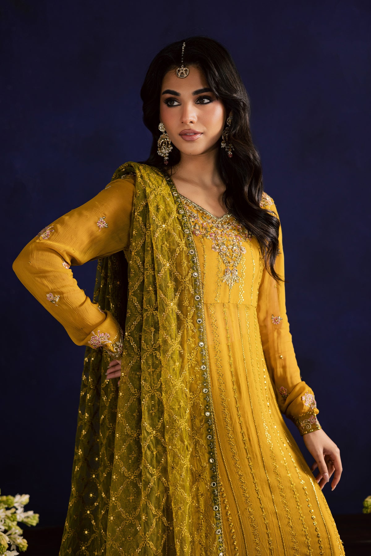 The look is completed with a contrast embroidered net dupatta, finished with organza borders on all four sides and subtle lace detailing, tying the entire ensemble together with effortless sophistication.