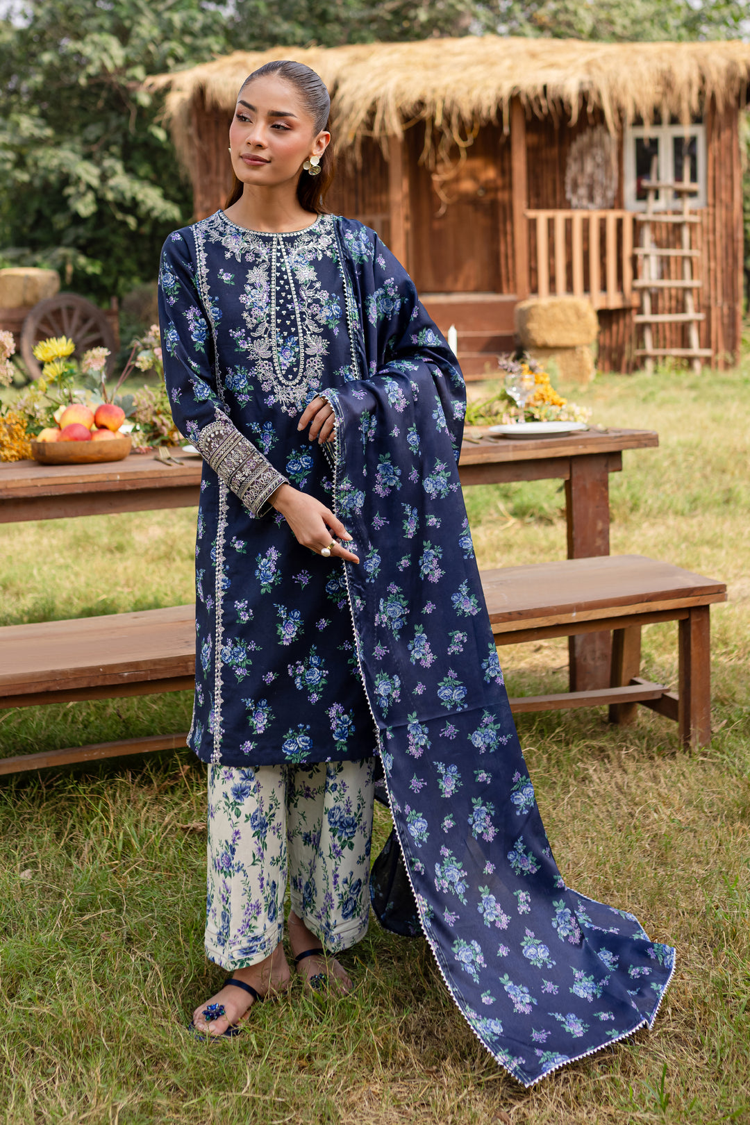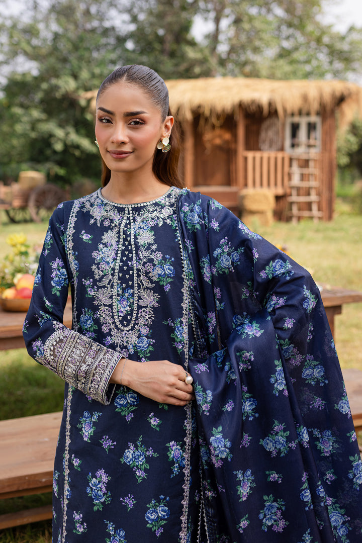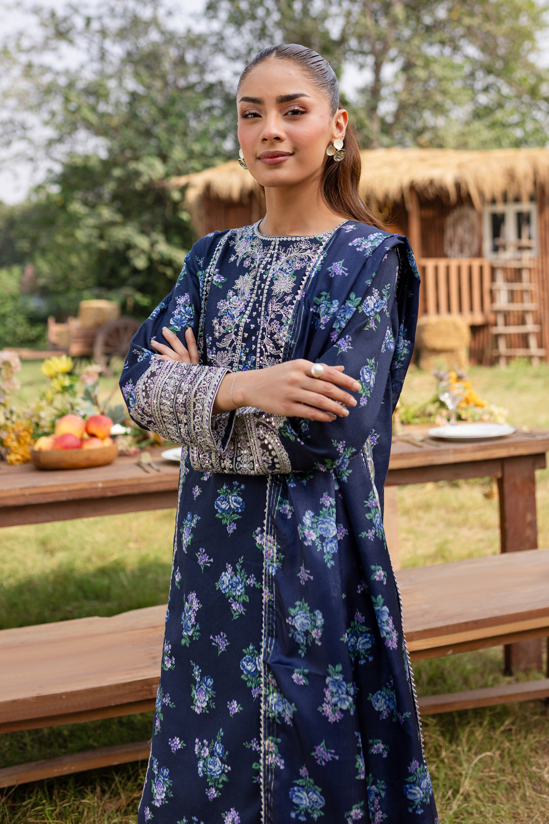 This elegant blue ensemble features a panelled khaddar shirt with delicate lace details that add refinement to the hem and neckline. The fitted sleeves are also finished with lace, lending a sophisticated touch to the design.