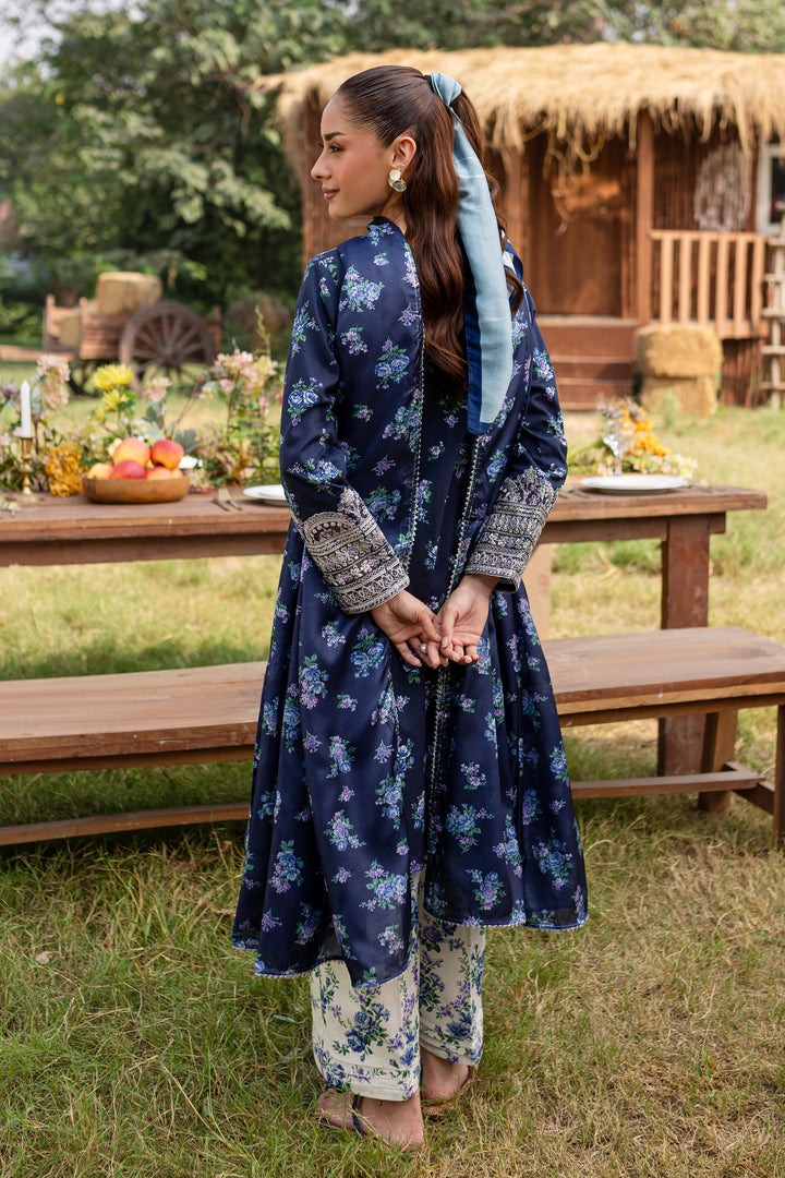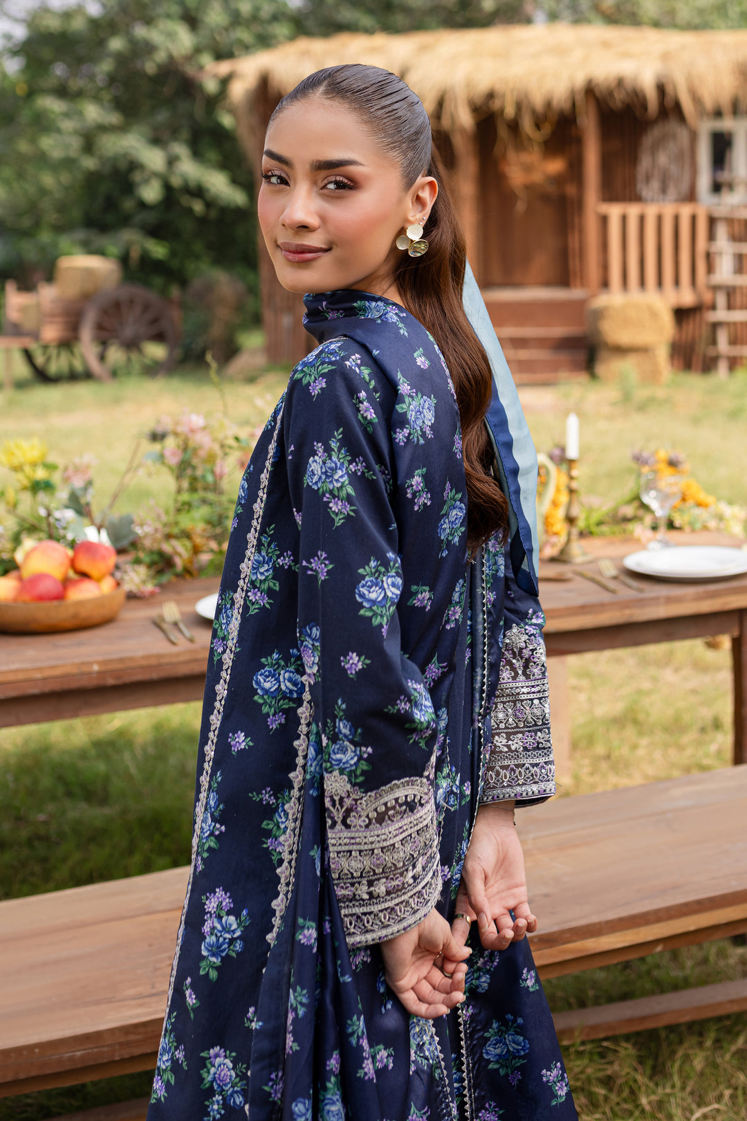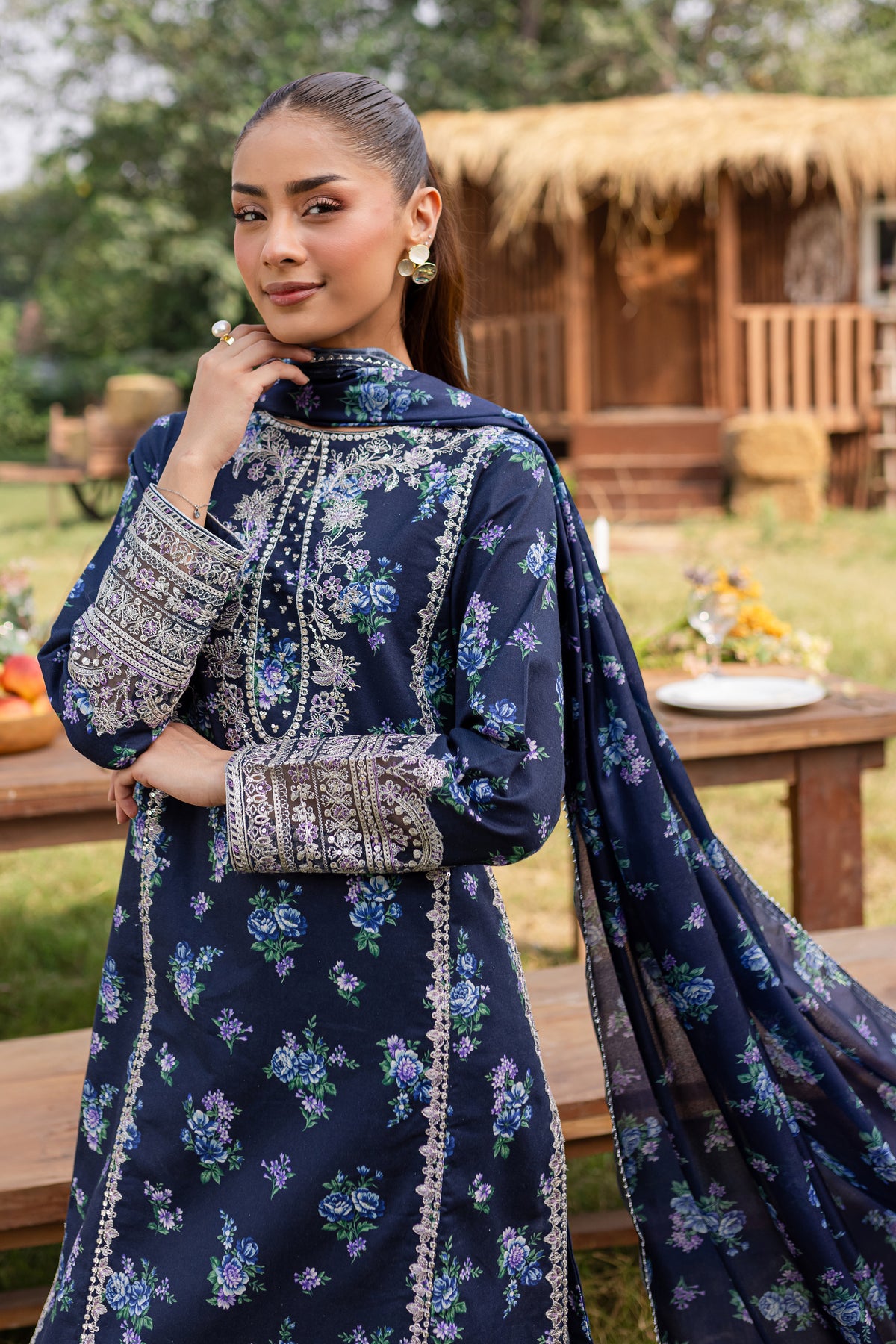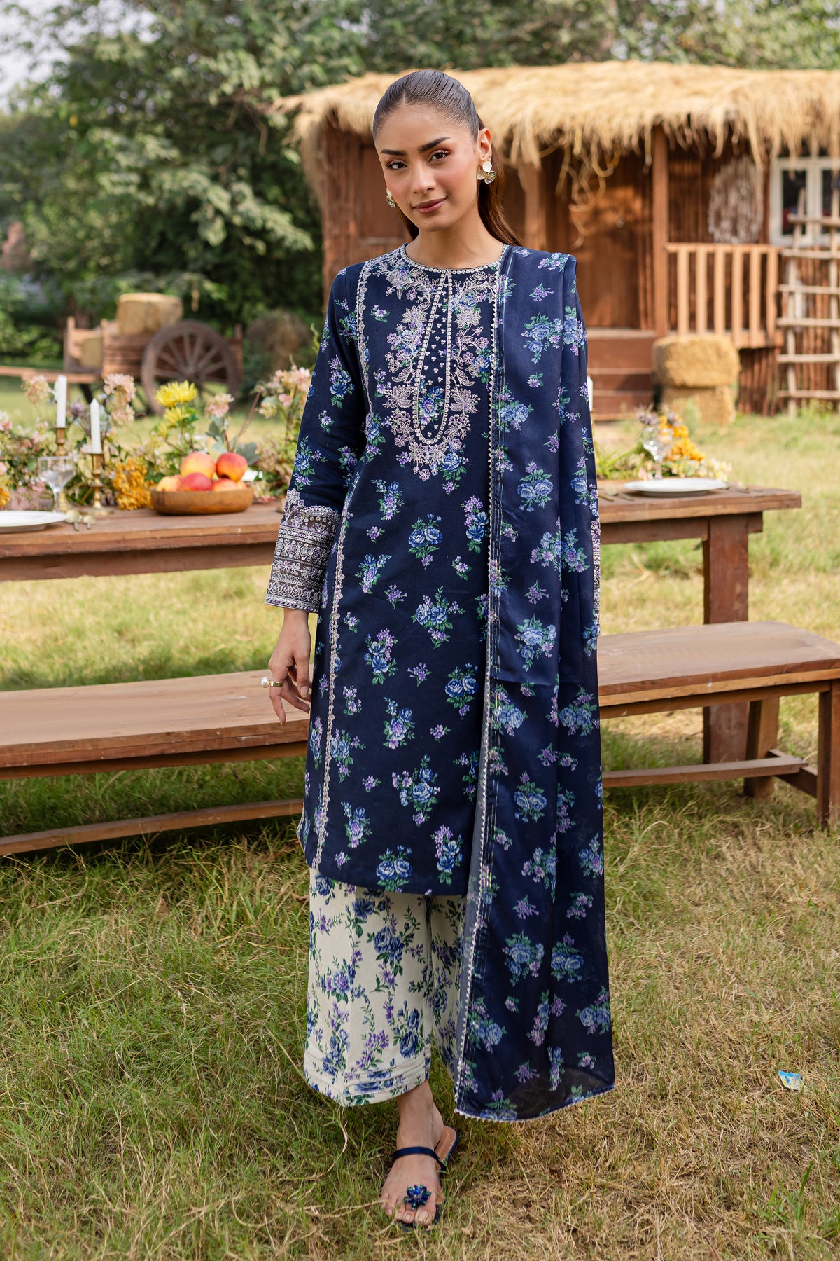 This elegant blue ensemble features a panelled khaddar shirt with delicate lace details that add refinement to the hem and neckline. The fitted sleeves are also finished with lace, lending a sophisticated touch to the design.