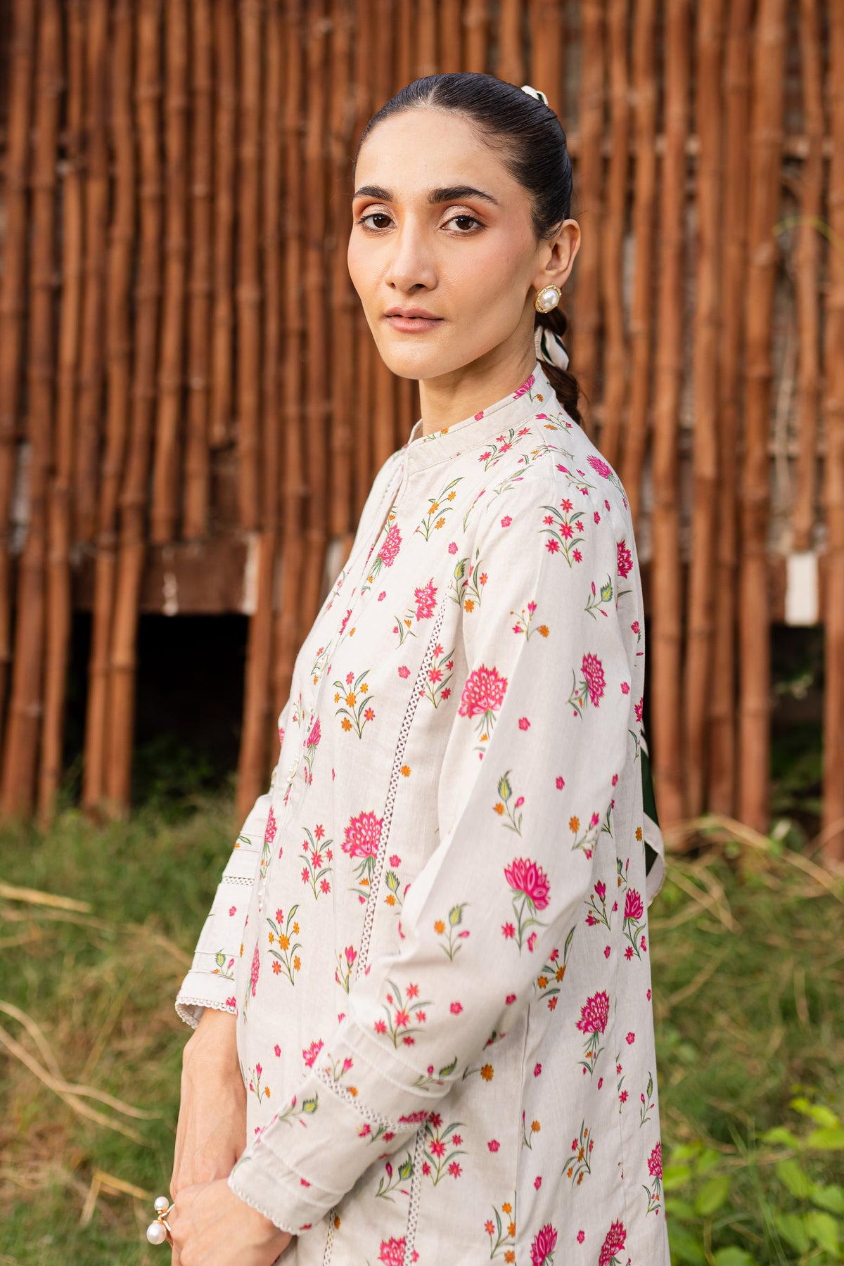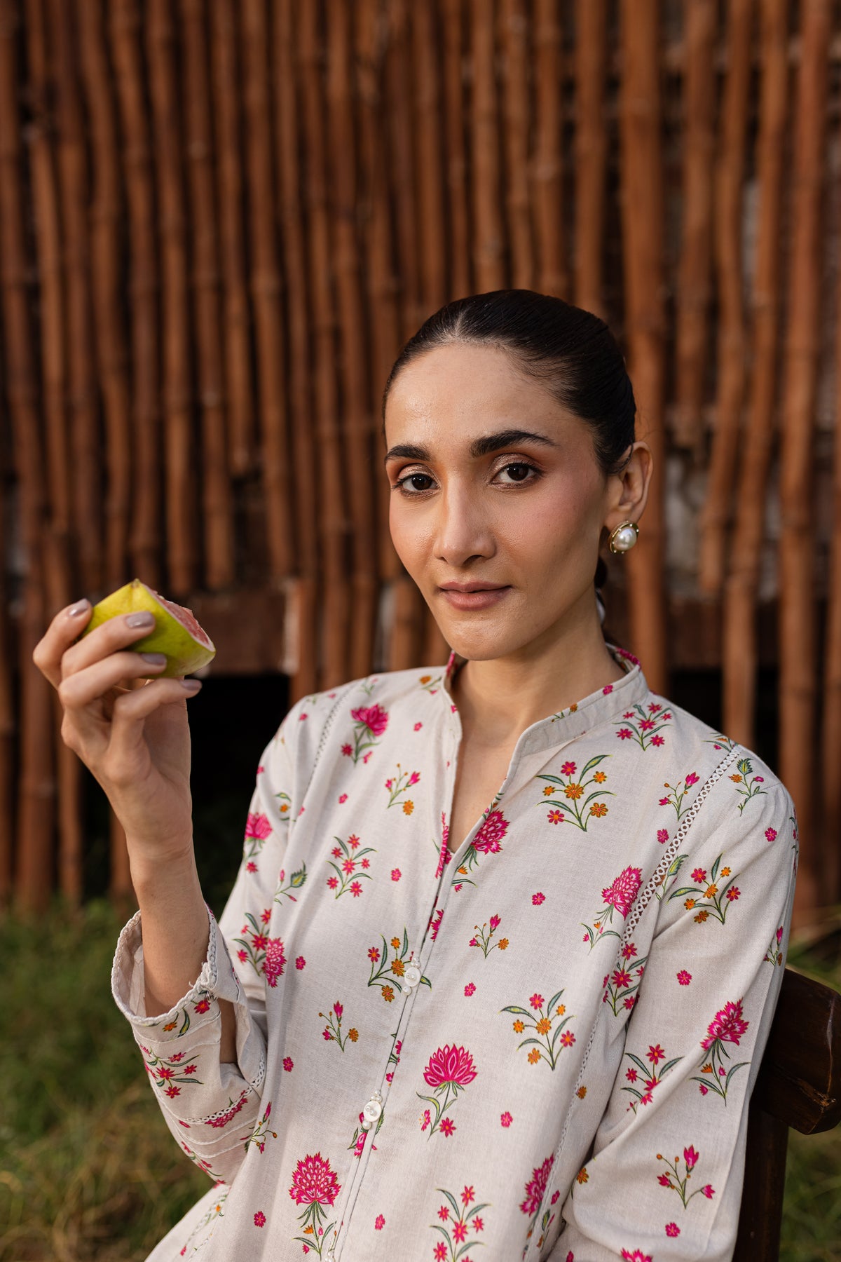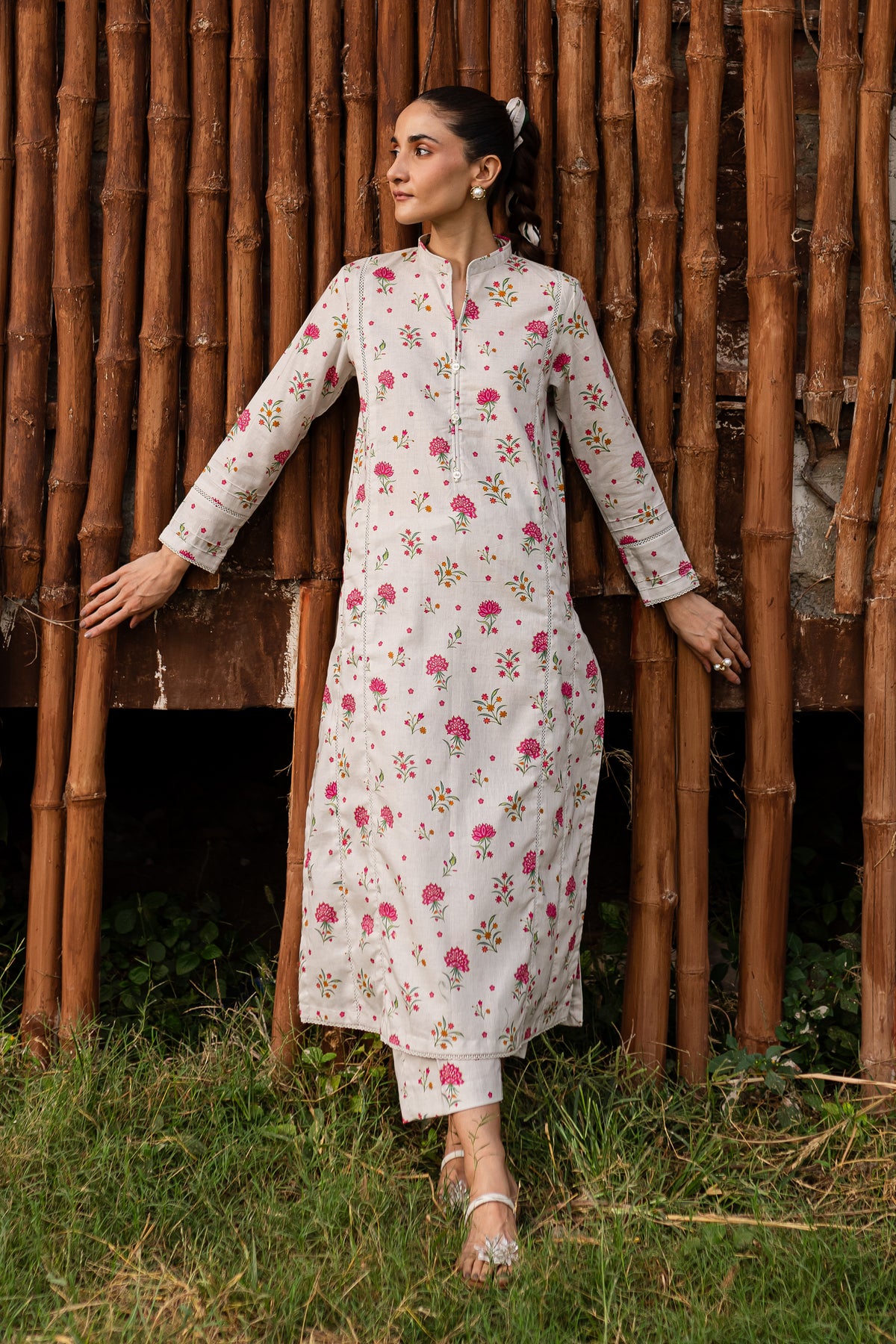 Sophisticated and versatile, this grey khaddar two-piece features a printed five panel shirt with a classic ban collar and elegant piping. A button collage enhances the neckline while the hem is finished with lace for added refinement. The fitted sleeves are carefully tailored with subtle manipulation at the hem for a structured look.