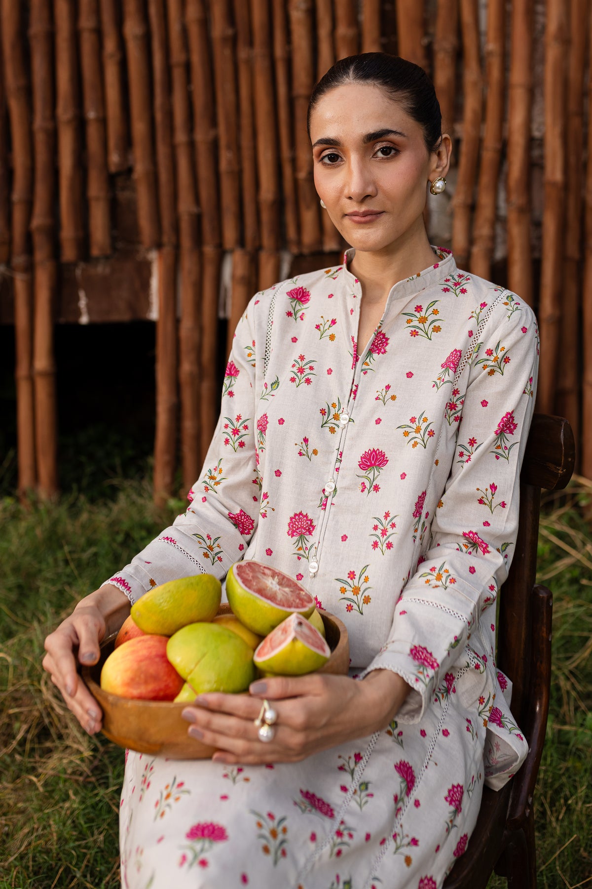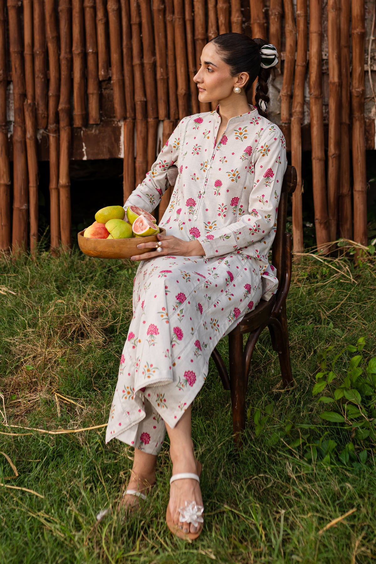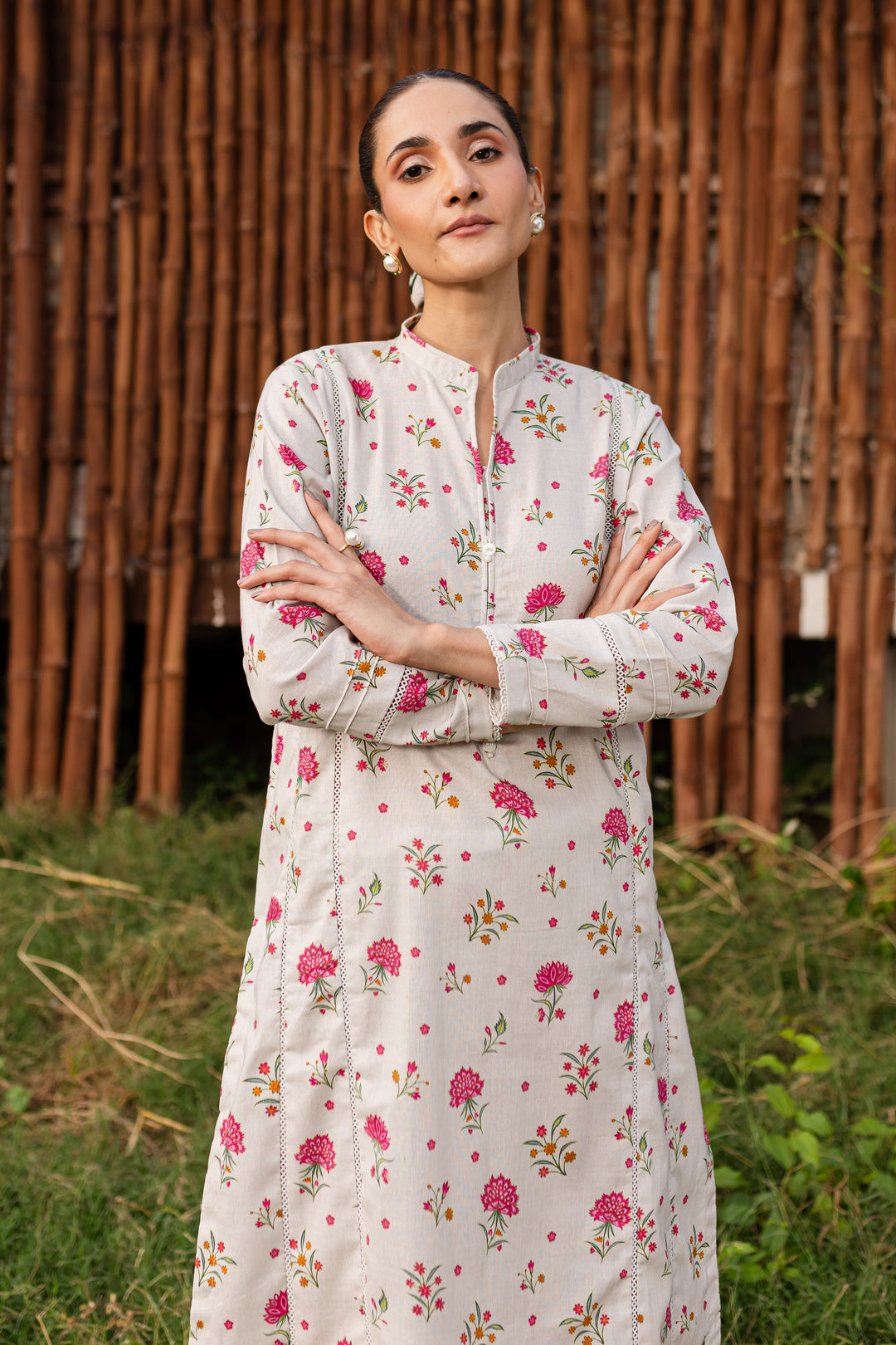 Sophisticated and versatile, this grey khaddar two-piece features a printed five panel shirt with a classic ban collar and elegant piping. A button collage enhances the neckline while the hem is finished with lace for added refinement. The fitted sleeves are carefully tailored with subtle manipulation at the hem for a structured look.