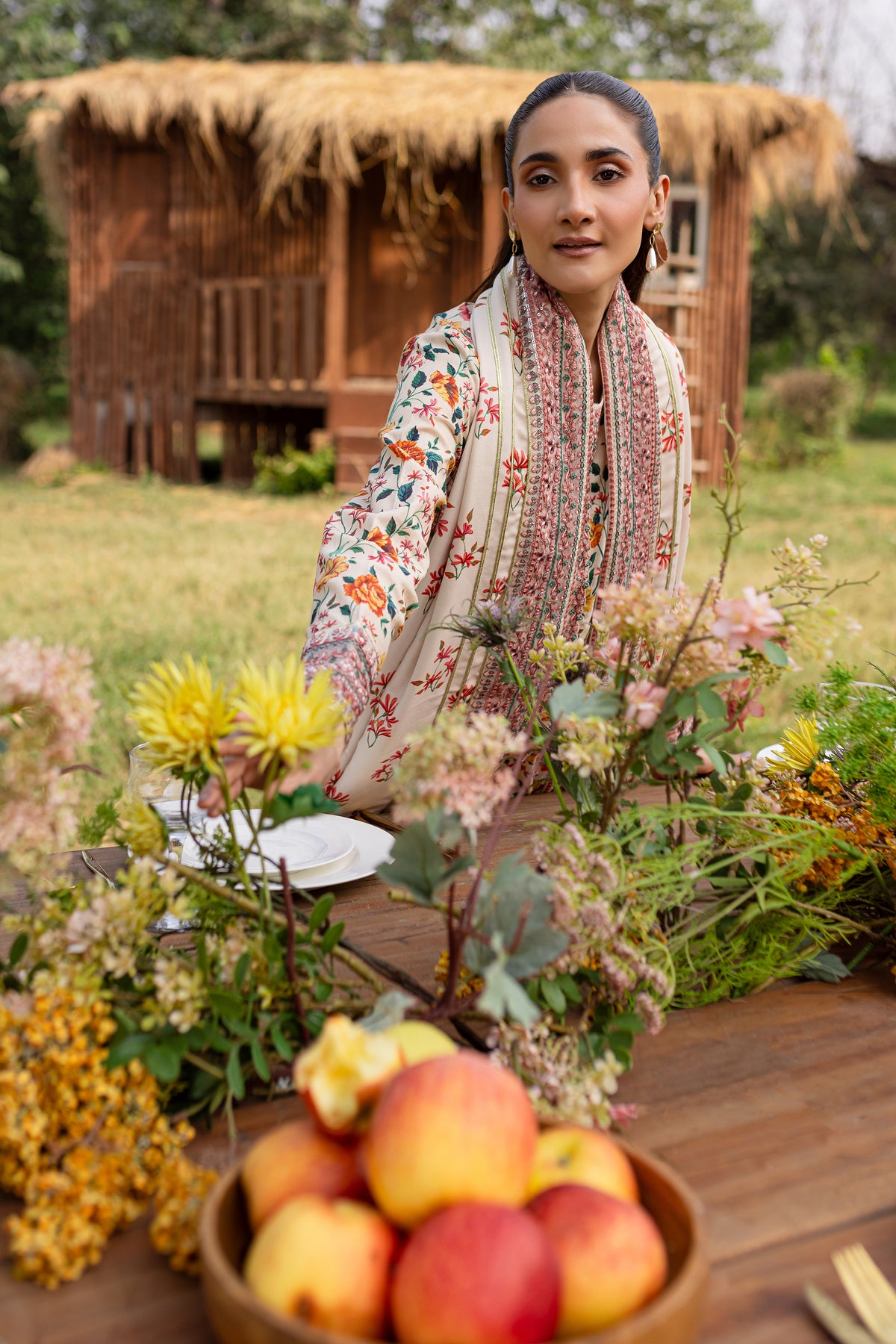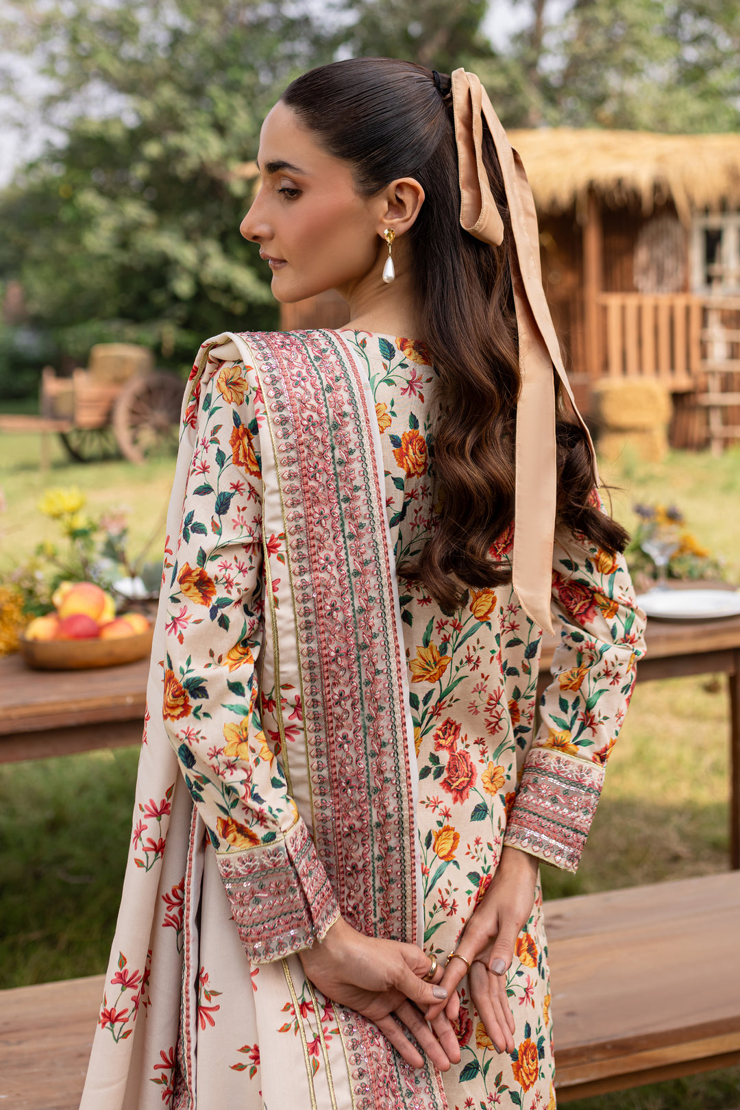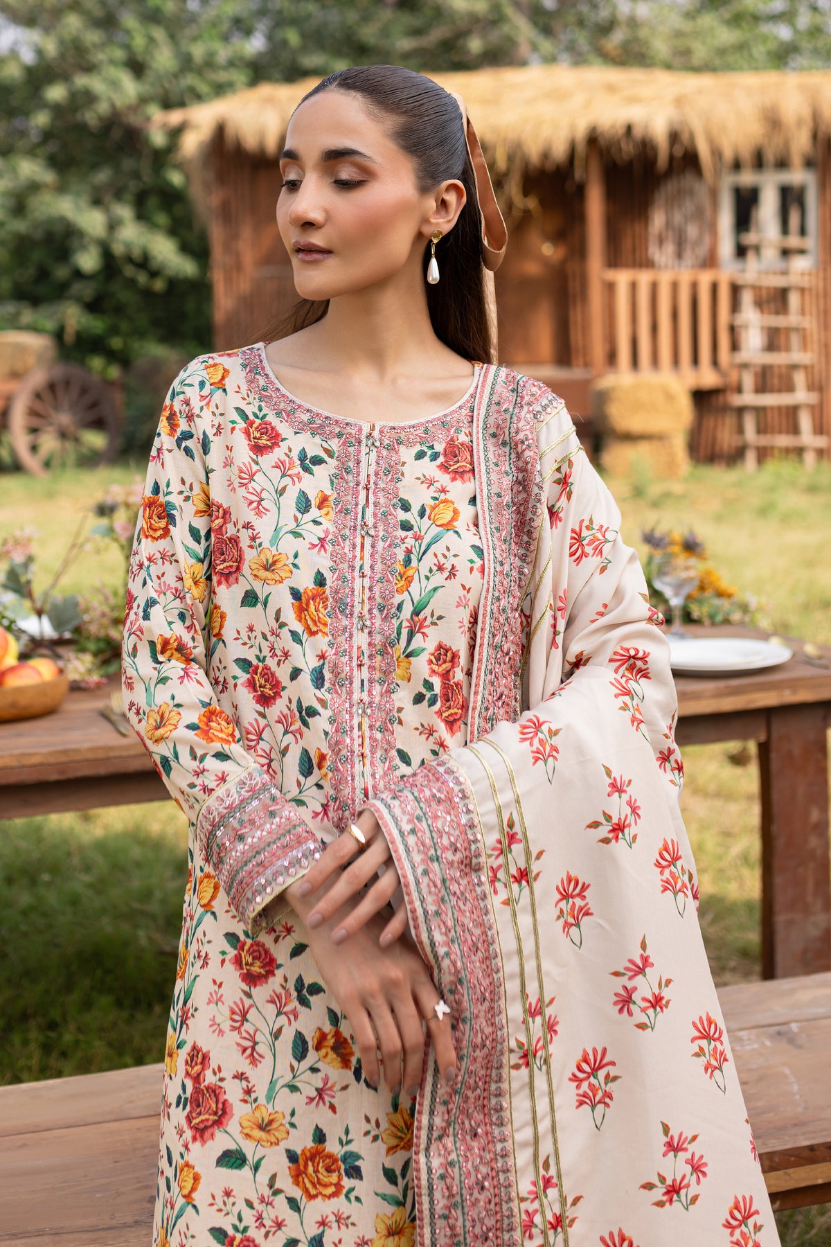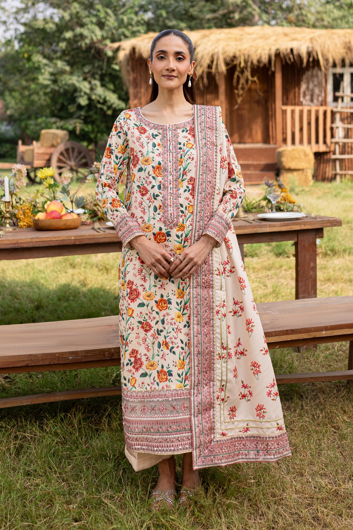 This beige three-piece set combines elegance with tradition. The printed khaddar shirt features embroidered organza patches on the sleeves and hem, finished with dori laces for a refined touch. An embroidered neckline adds sophistication, while a printed shawl with embroidery along the borders, further embellished with dori laces, complements the look. A simple dyed trouser completes the ensemble, making this outfit a refined choice for formal events.
