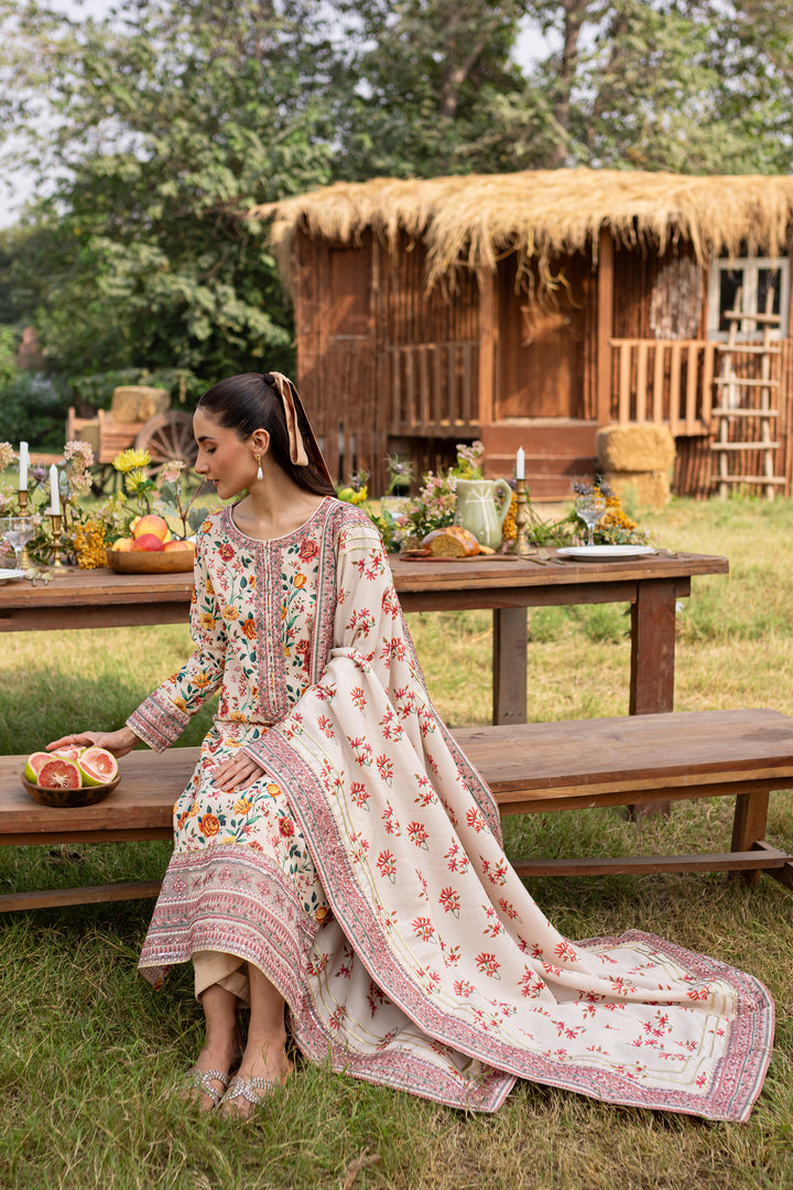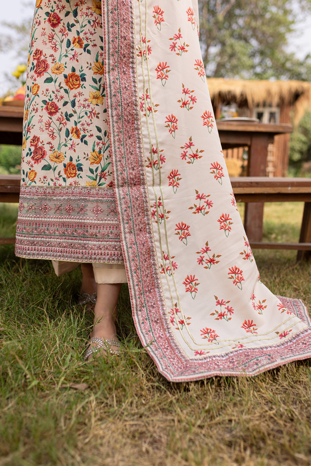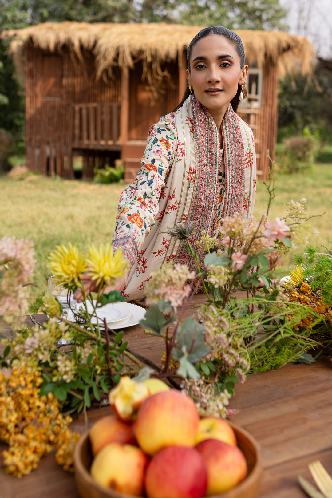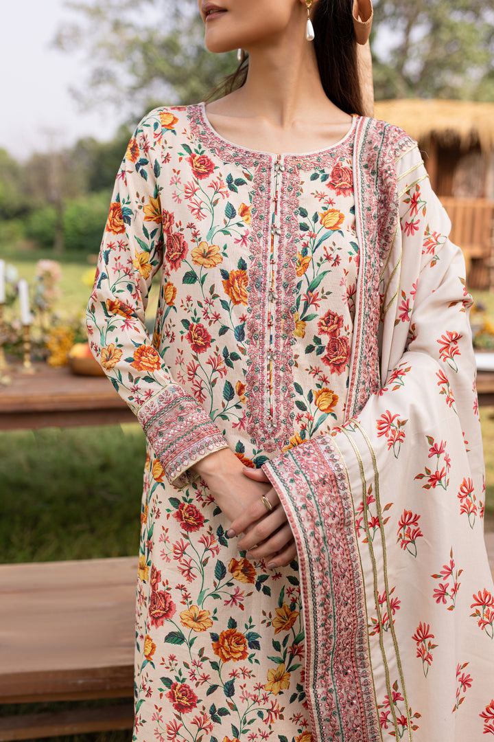 This beige three-piece set combines elegance with tradition. The printed khaddar shirt features embroidered organza patches on the sleeves and hem, finished with dori laces for a refined touch. An embroidered neckline adds sophistication, while a printed shawl with embroidery along the borders, further embellished with dori laces, complements the look. A simple dyed trouser completes the ensemble, making this outfit a refined choice for formal events.