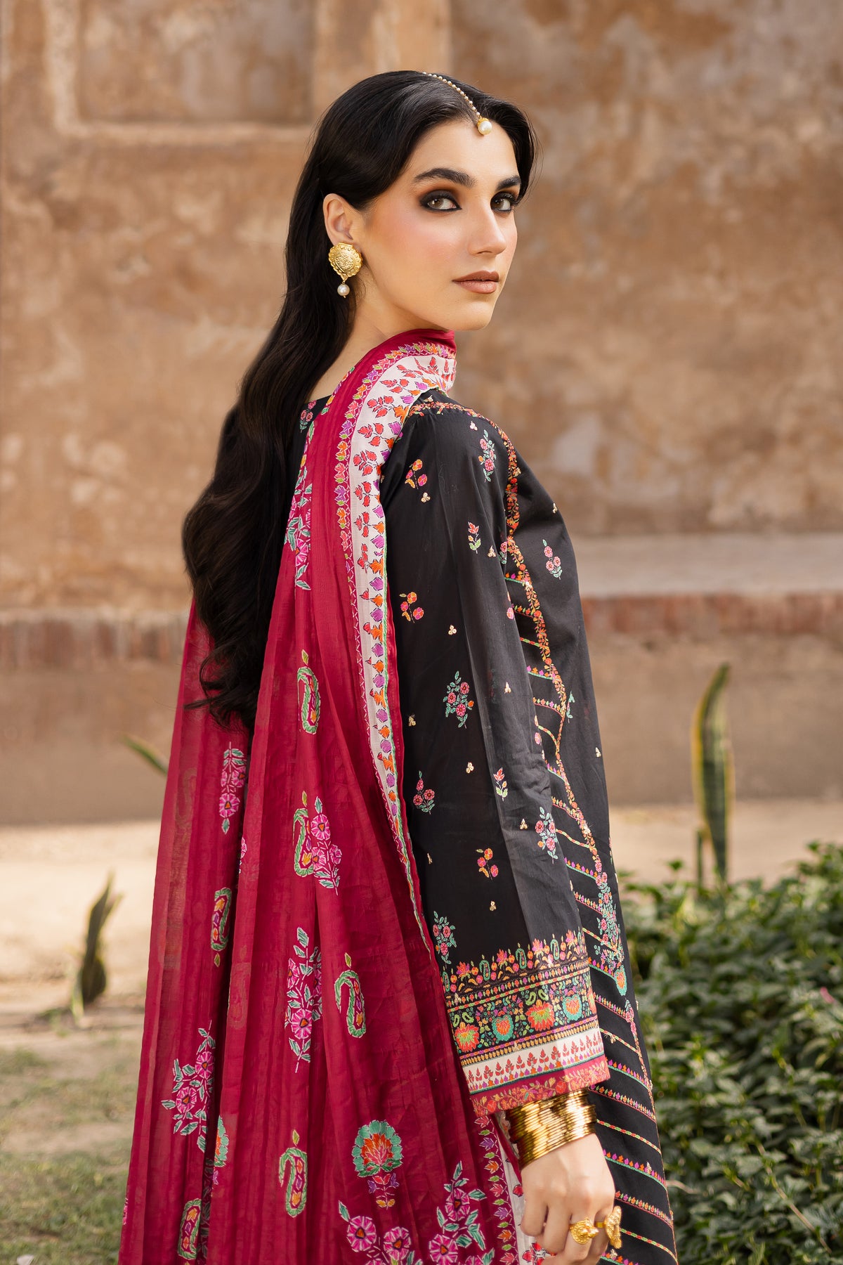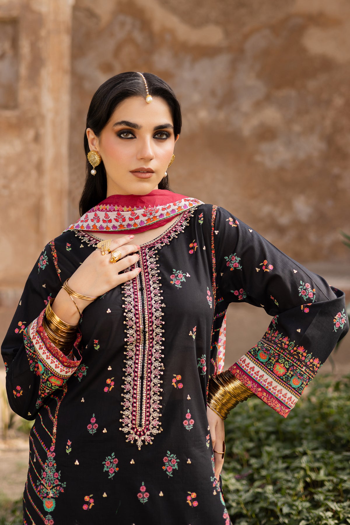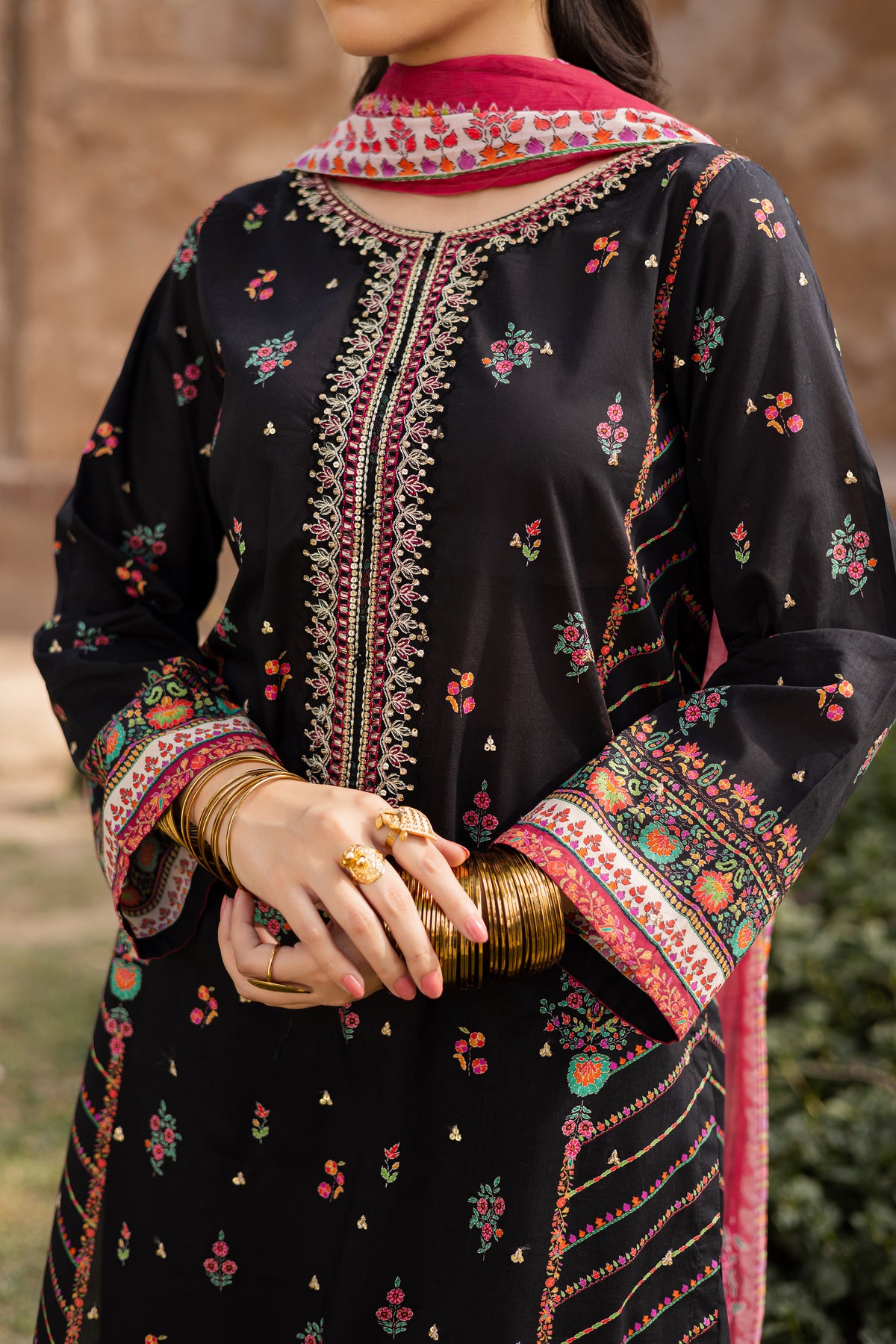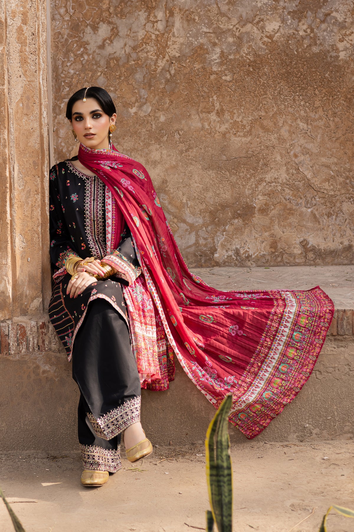 This mid-length black printed lawn shirt, features an elegantly embroidered neckline complemented by a delicate sequin spread on the front, creating a subtle shimmer that enhances the overall sophistication of the look.