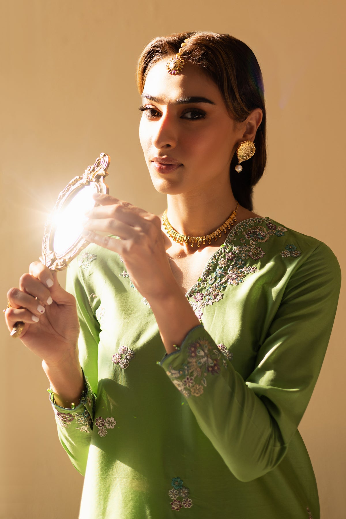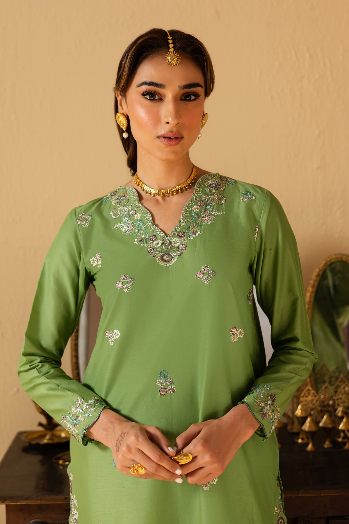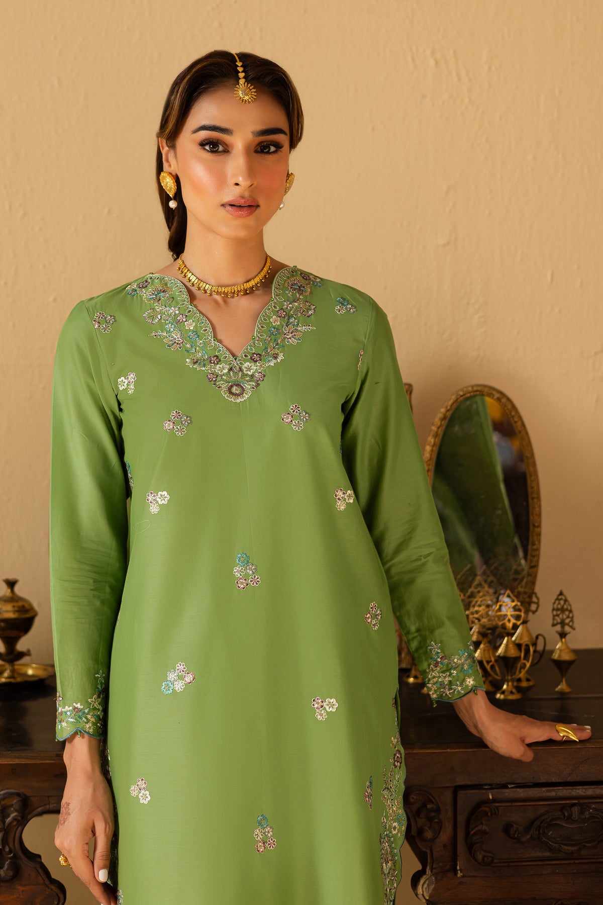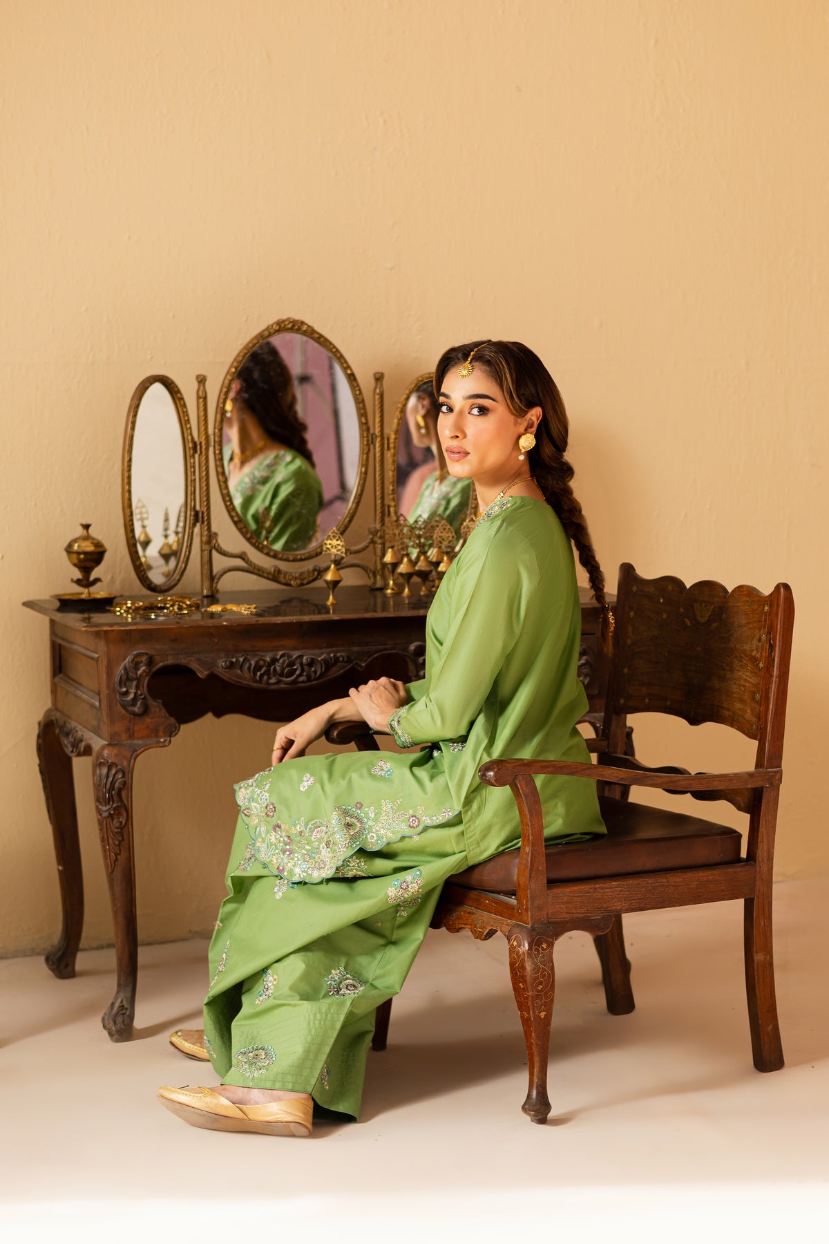 Dilara is a sophisticated 2-piece outfit featuring truf green pima lawn embroidered shirt with a composed round hem, beautifully finished with intricate kaviya detailing on both the hem and sleeves. The fine craftsmanship adds texture and a hint of traditional artistry to the contemporary silhouette.