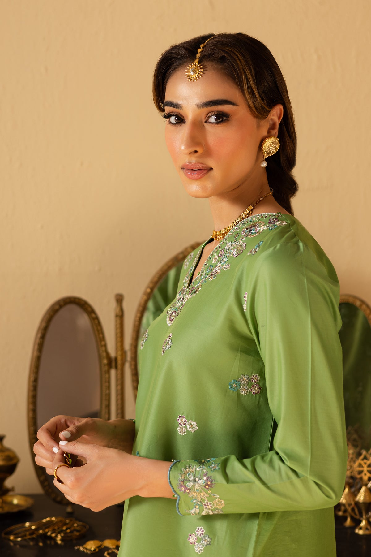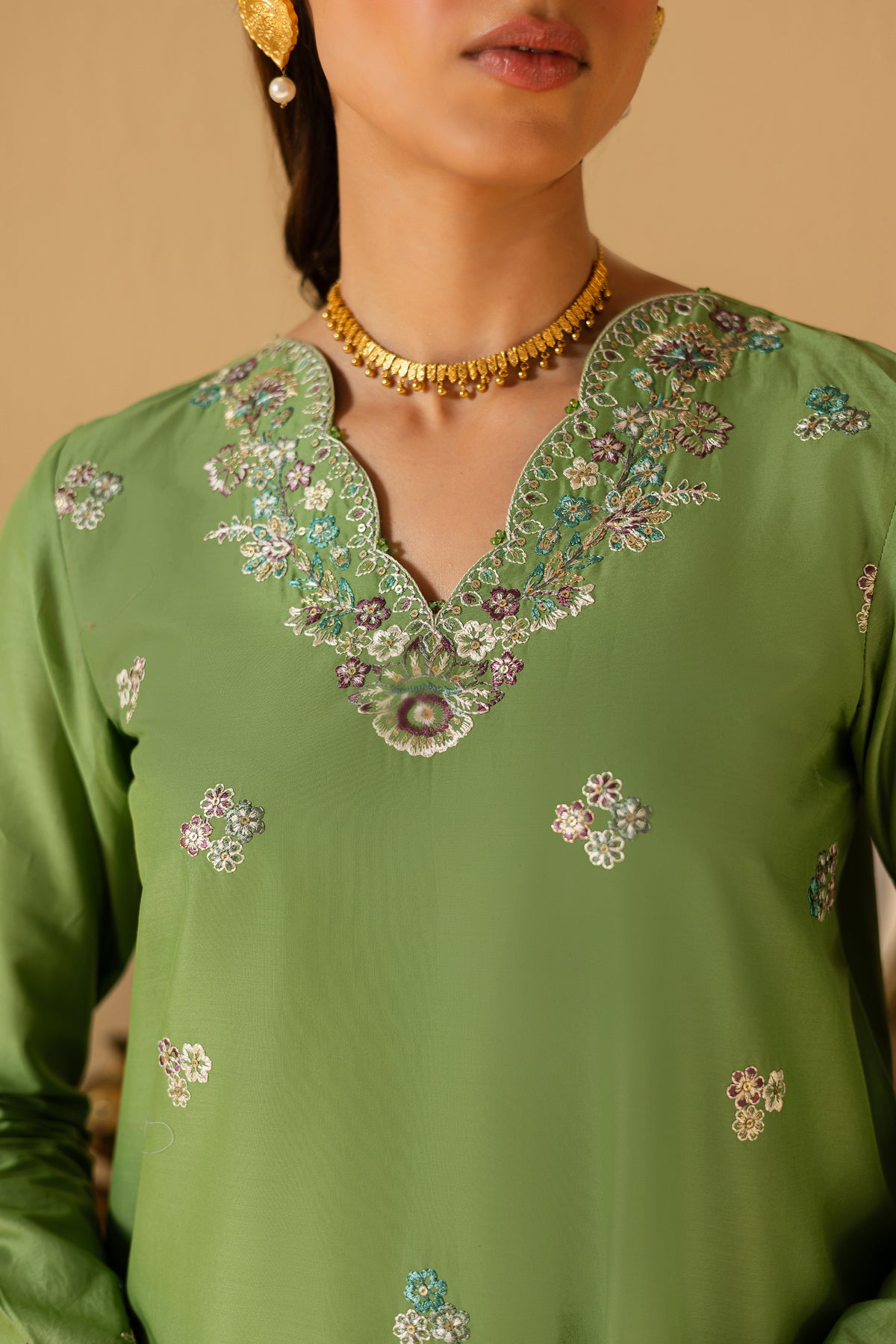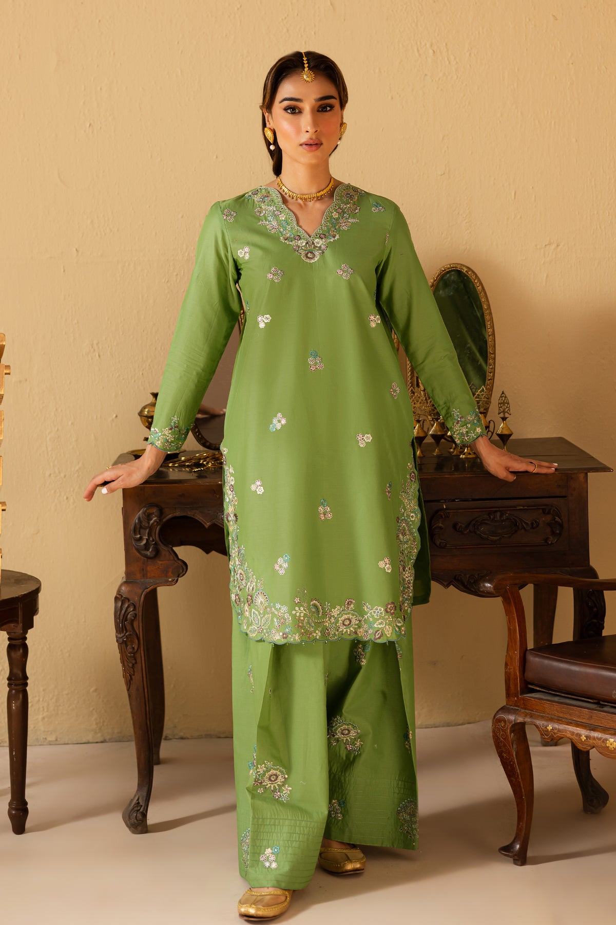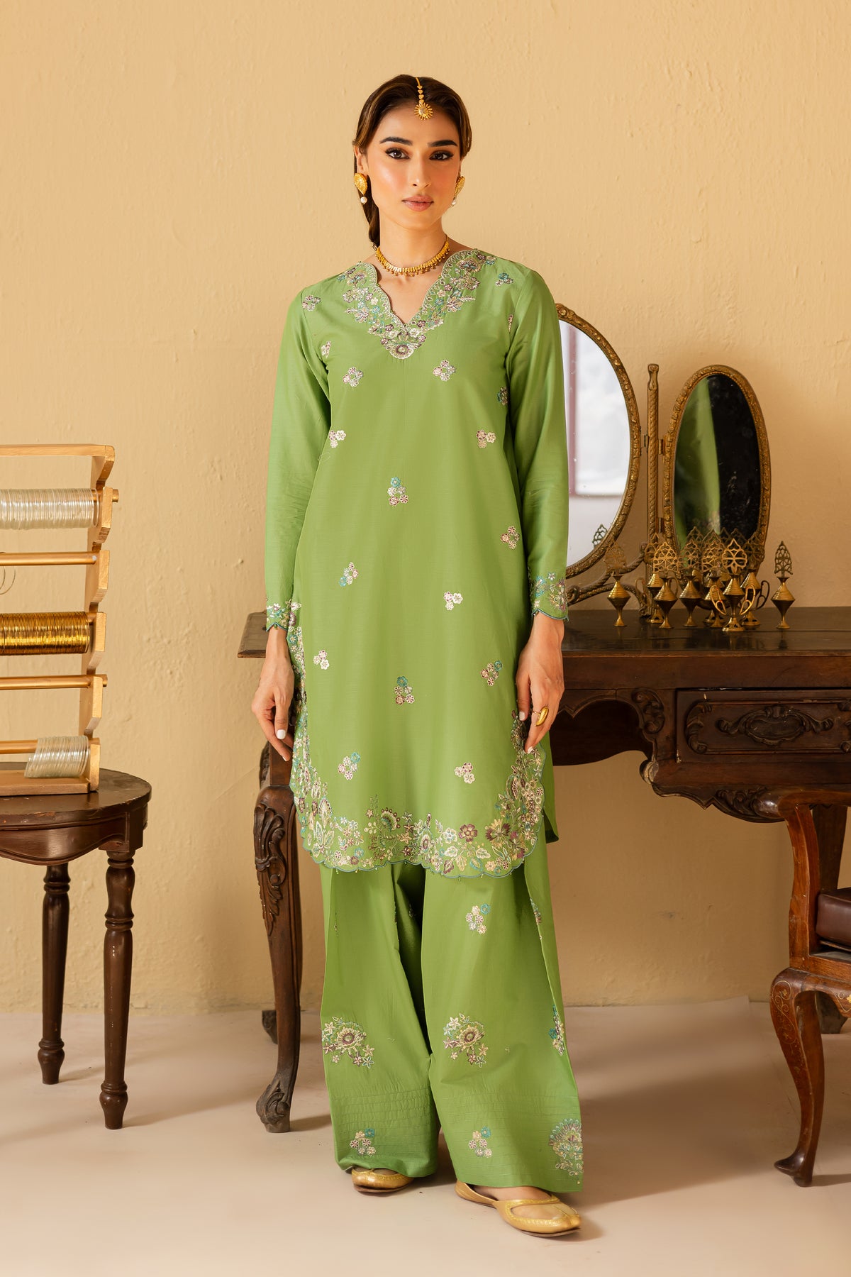Dilara is a sophisticated 2-piece outfit featuring truf green pima lawn embroidered shirt with a composed round hem, beautifully finished with intricate kaviya detailing on both the hem and sleeves. The fine craftsmanship adds texture and a hint of traditional artistry to the contemporary silhouette.