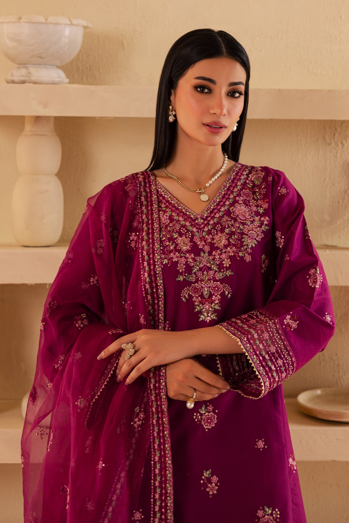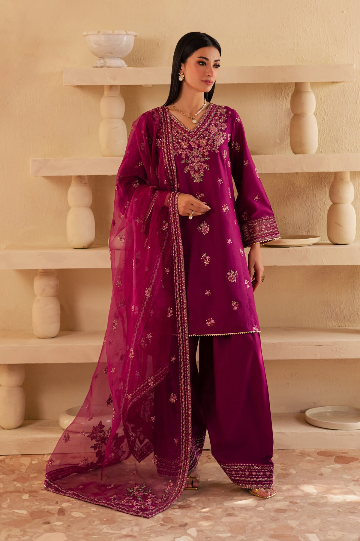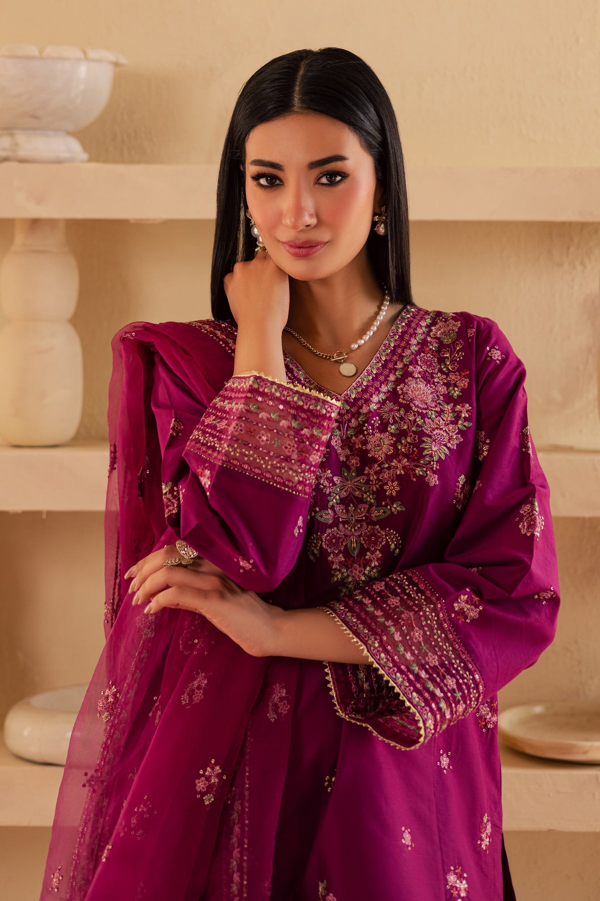 This short paneled magenta purple pima lawn shirt features a V-shaped embroidered neckline with a beautiful embroidery spread across the front. The sleeves are elegantly embroidered, finished with a delicate organza border, and the intricate embroidery extends throughout the entire shirt, adding depth and texture.