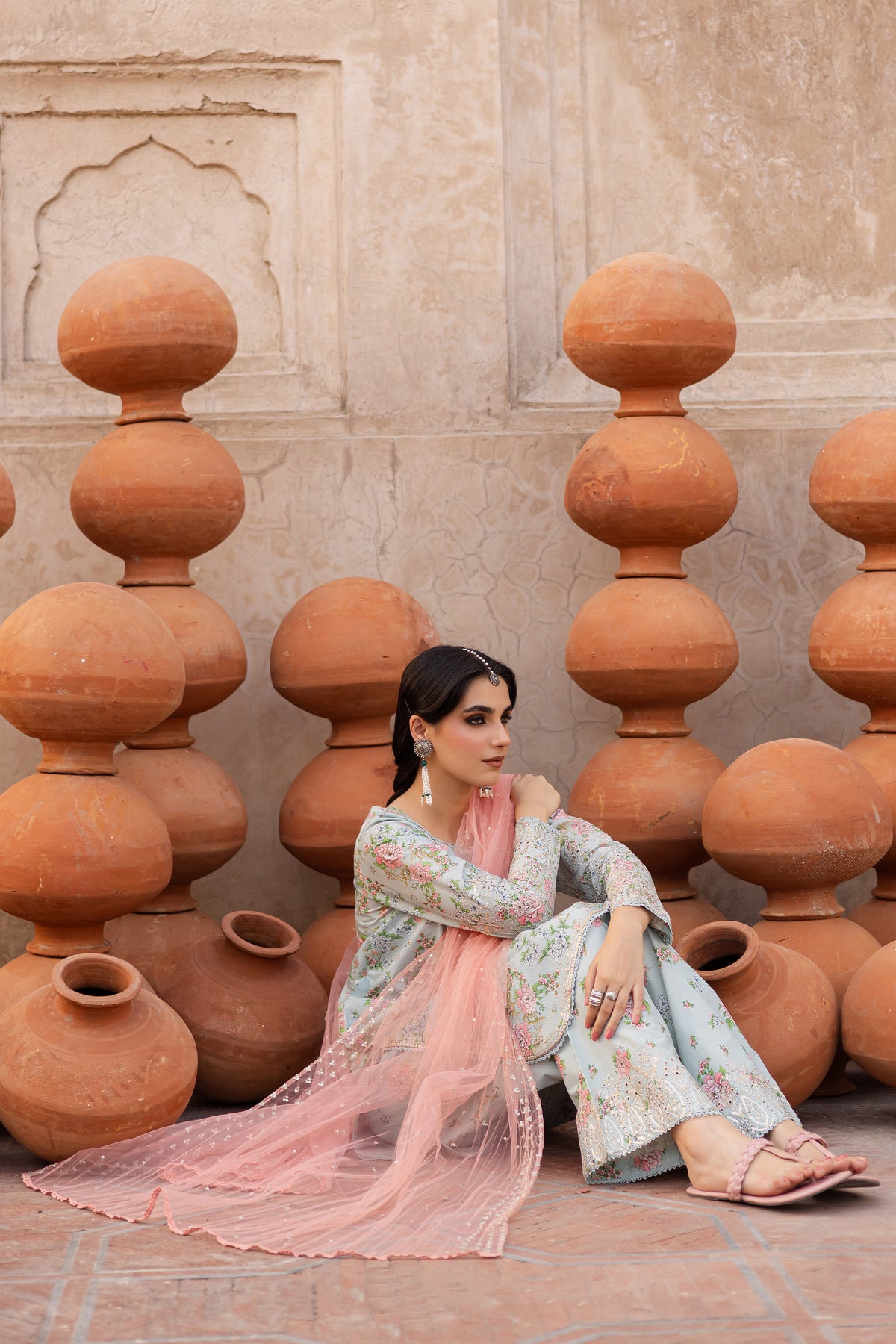 It is paired with a cambric farshi shalwar adorned with embroidered detailing at the hem, offering a perfect balance of tradition and style.