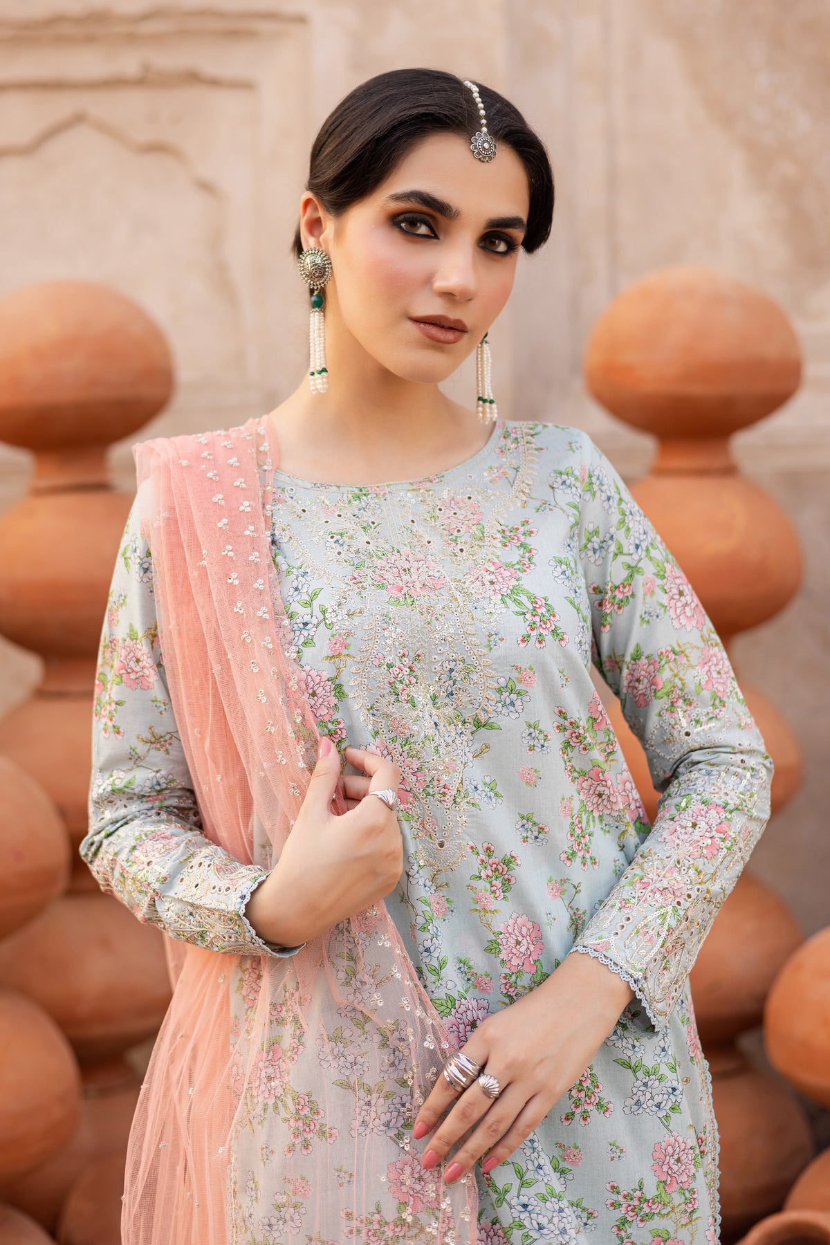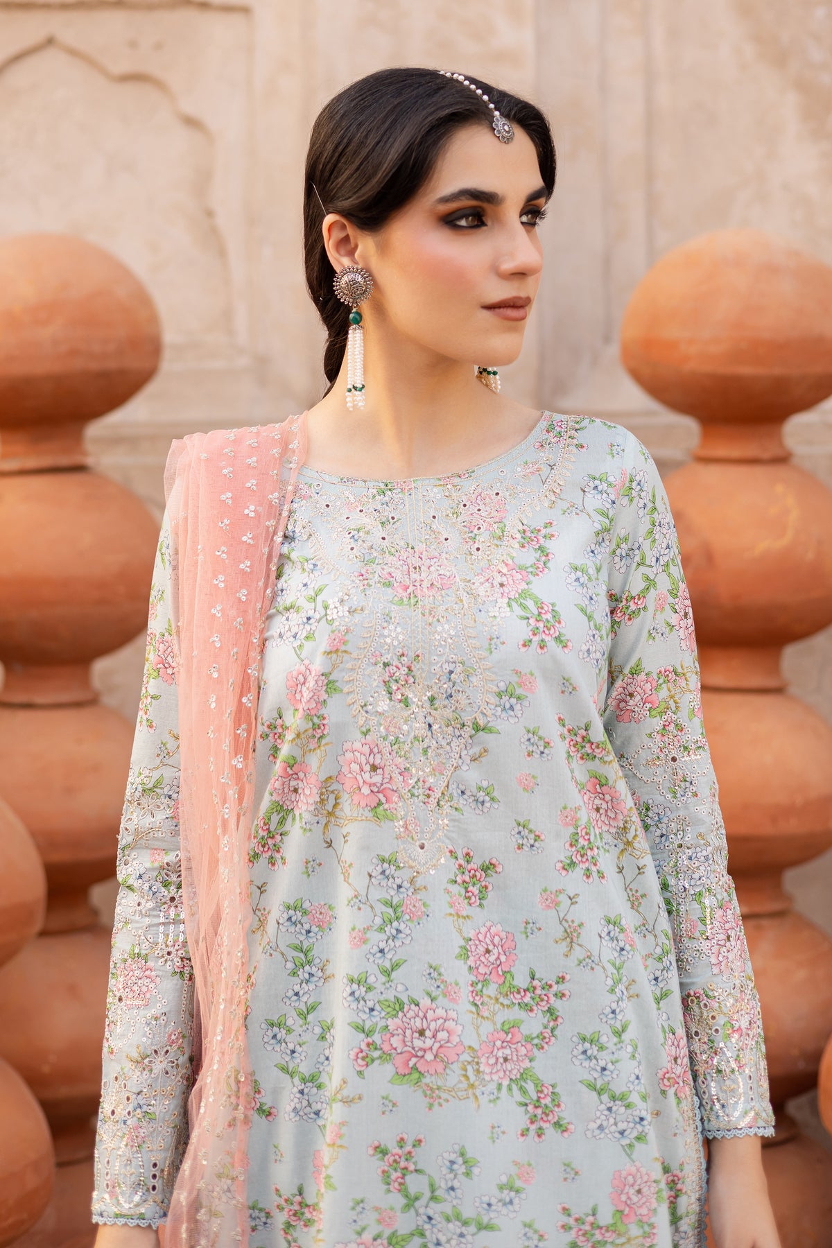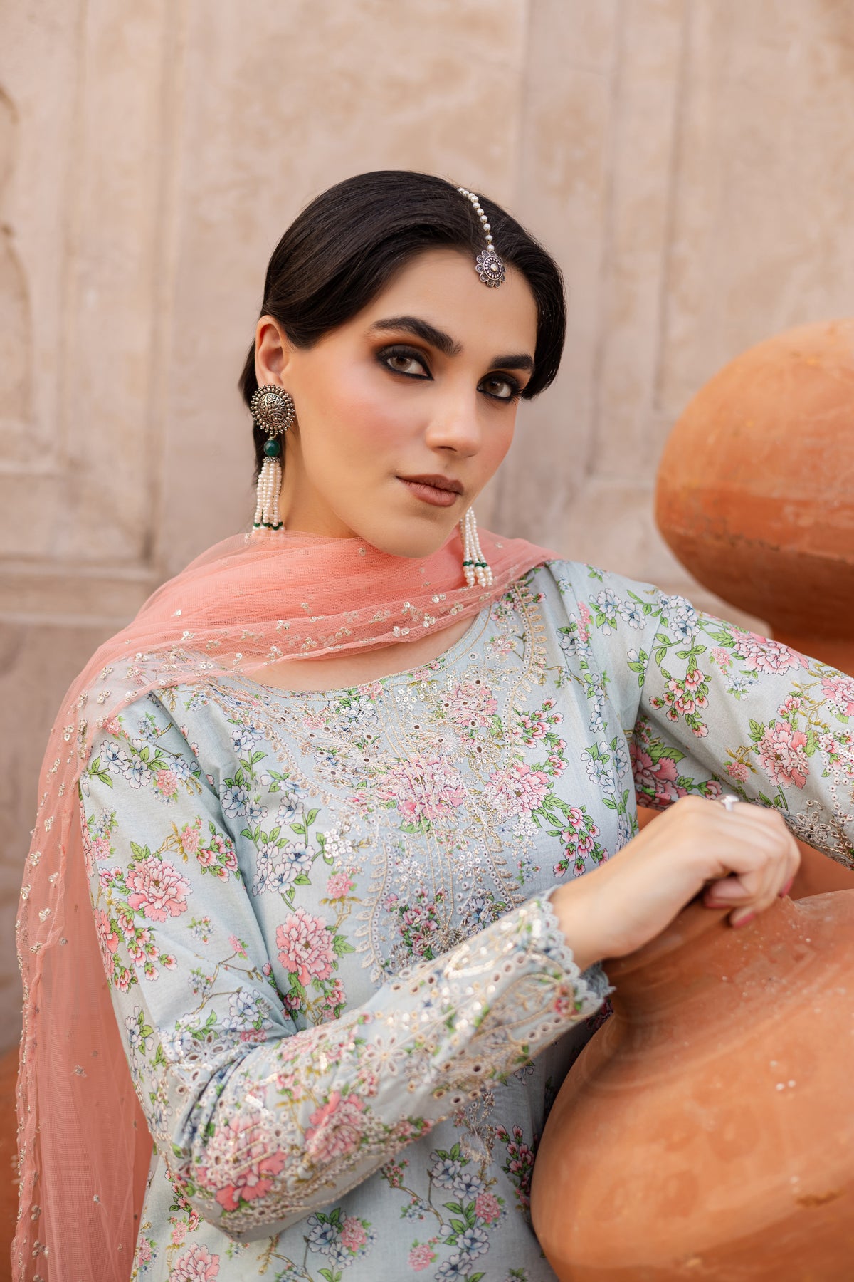 This beautifully printed lawn blue shirt features elegant embroidery on the neckline and a rounded hem finished with delicate embroidery, adding a graceful and refined touch to its classic silhouette.