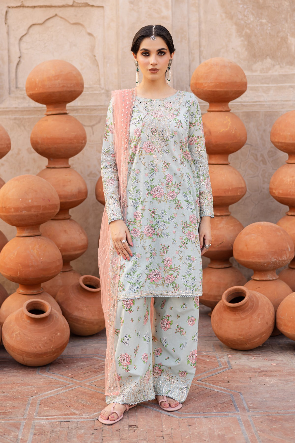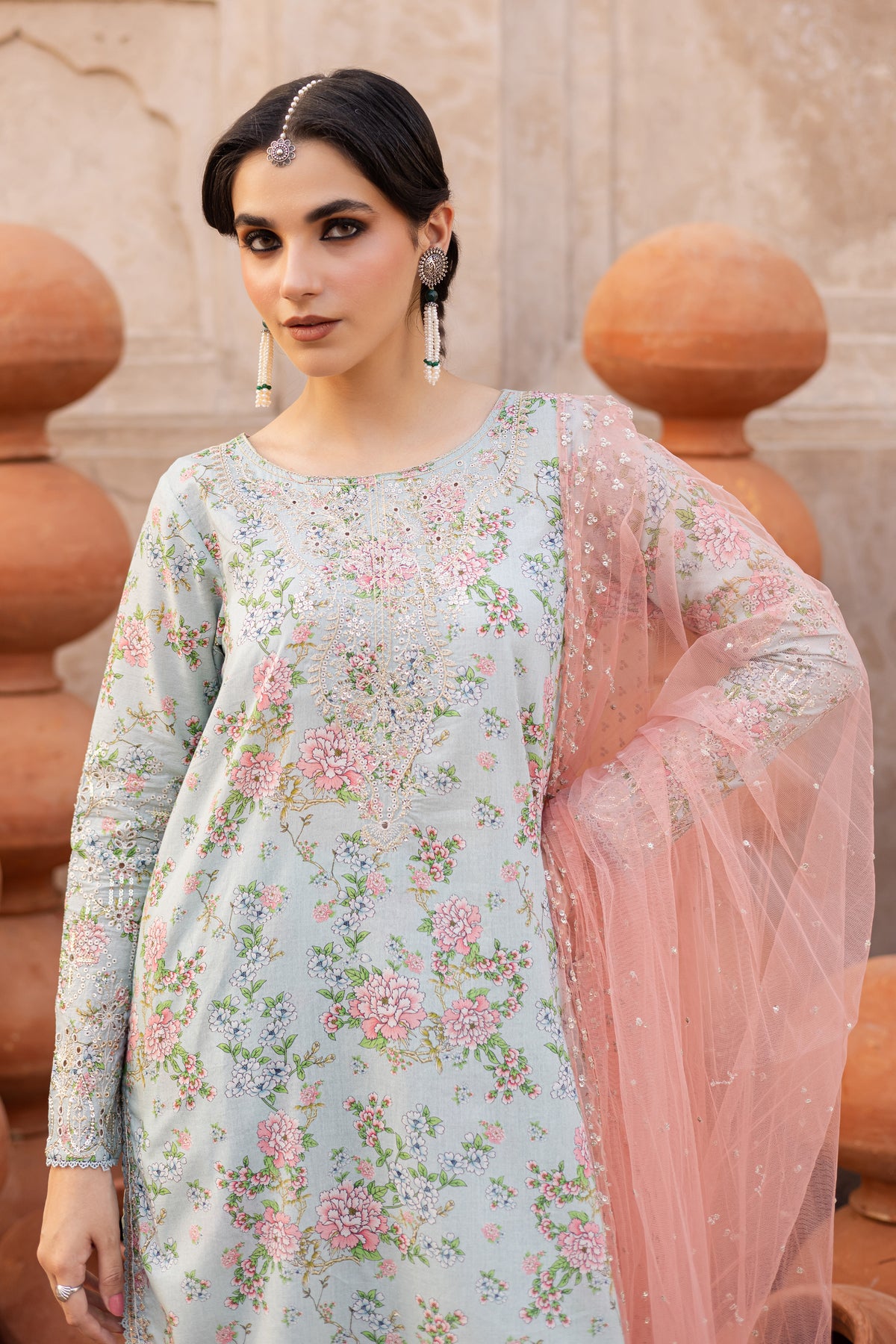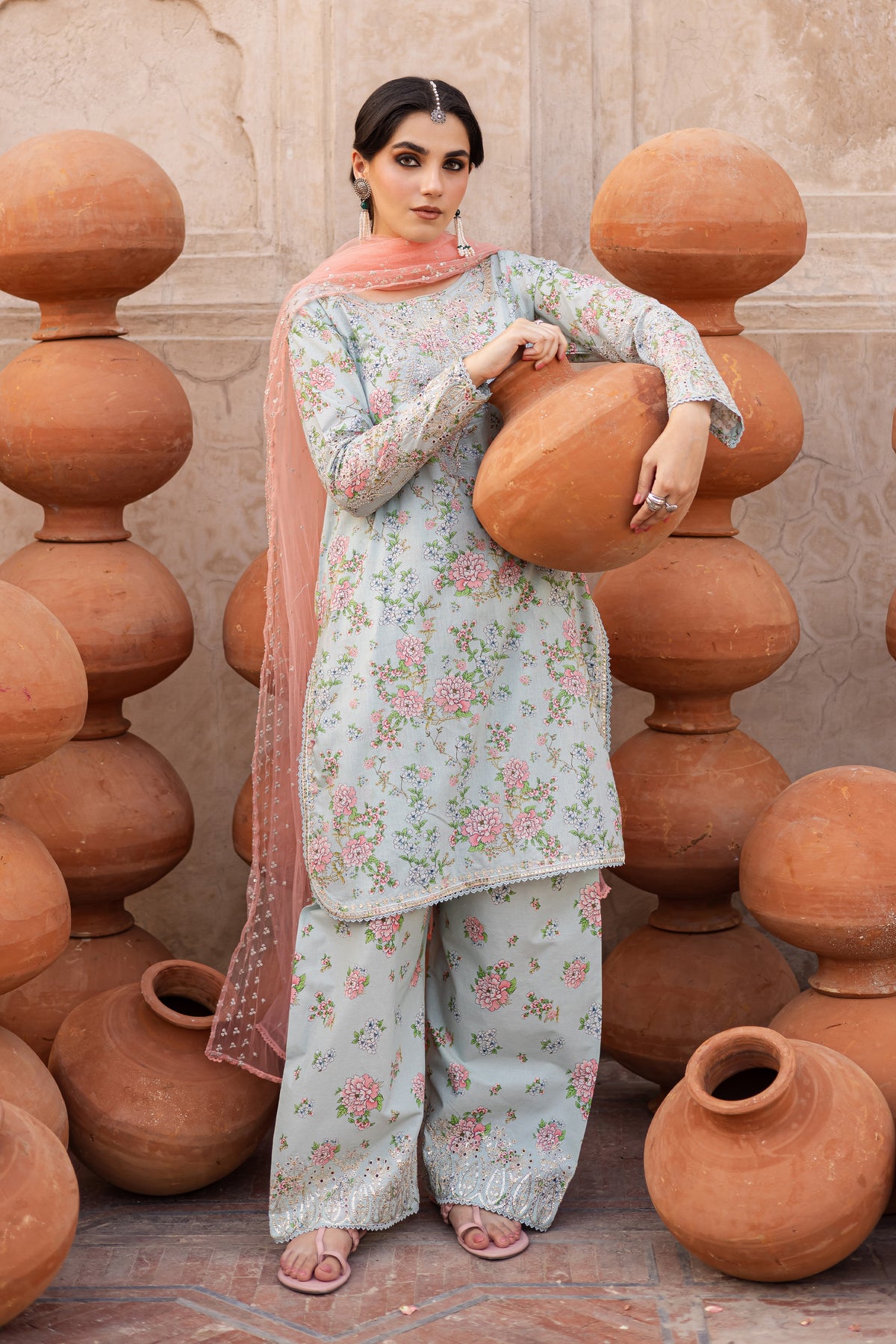 This beautifully printed lawn blue shirt features elegant embroidery on the neckline and a rounded hem finished with delicate embroidery, adding a graceful and refined touch to its classic silhouette.