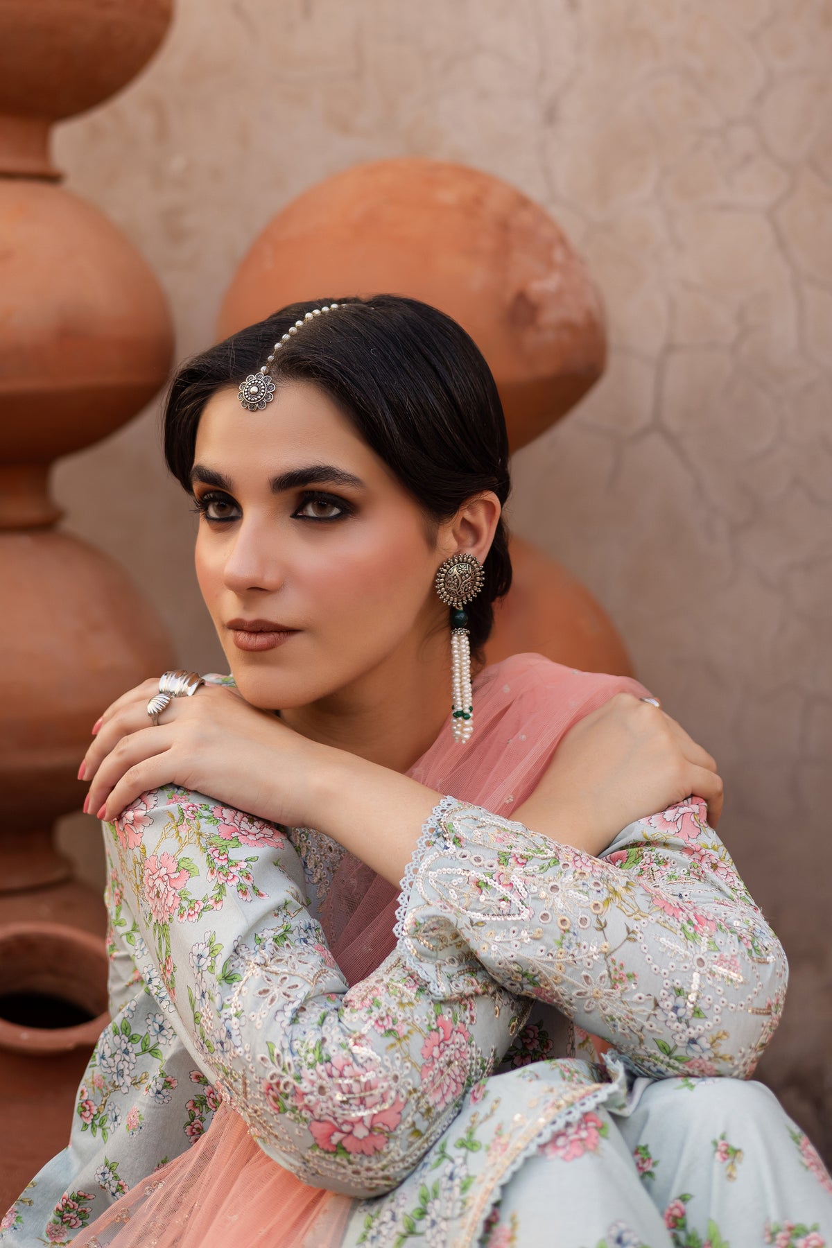 An embroidered net dupatta completes the ensemble, lending a light, ethereal finish with its intricate craftsmanship.