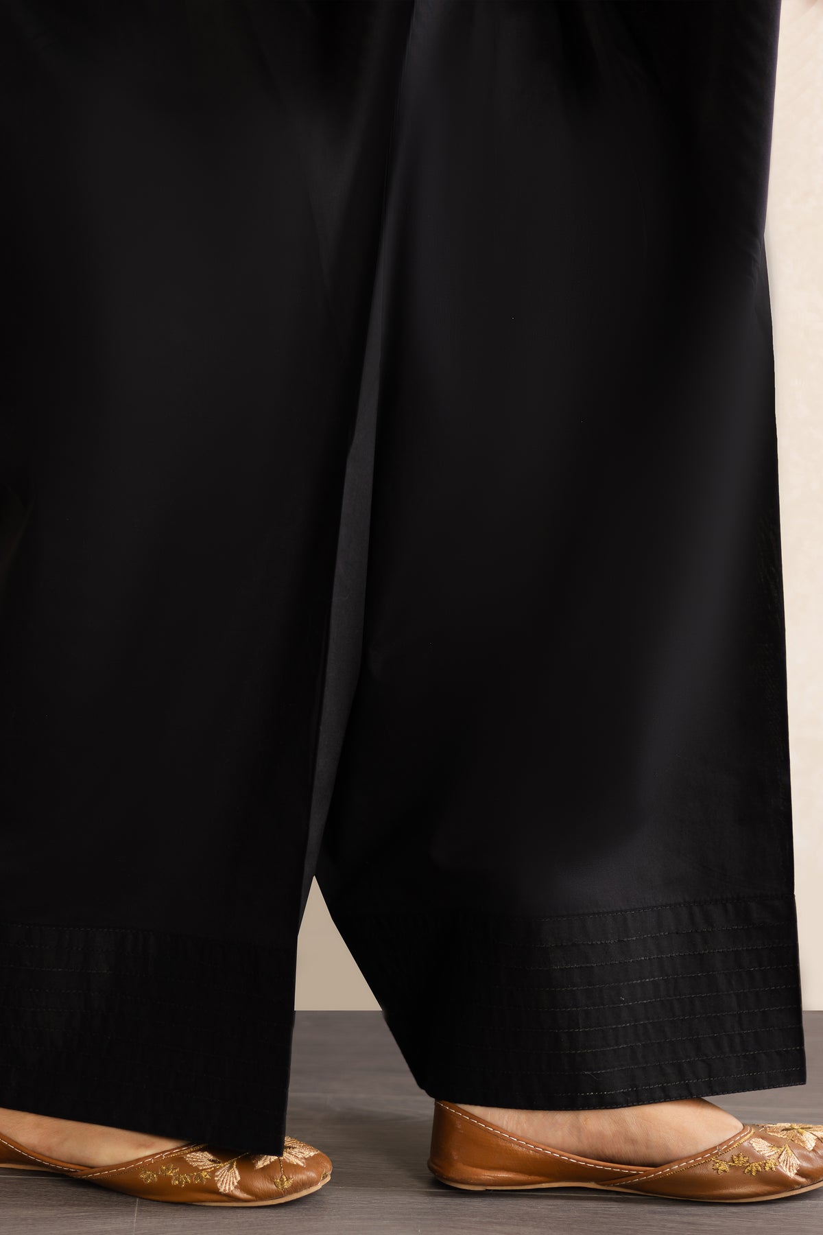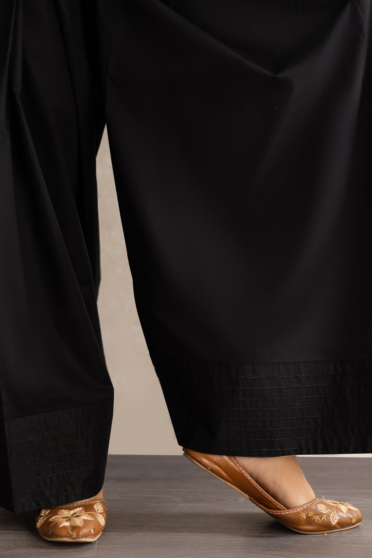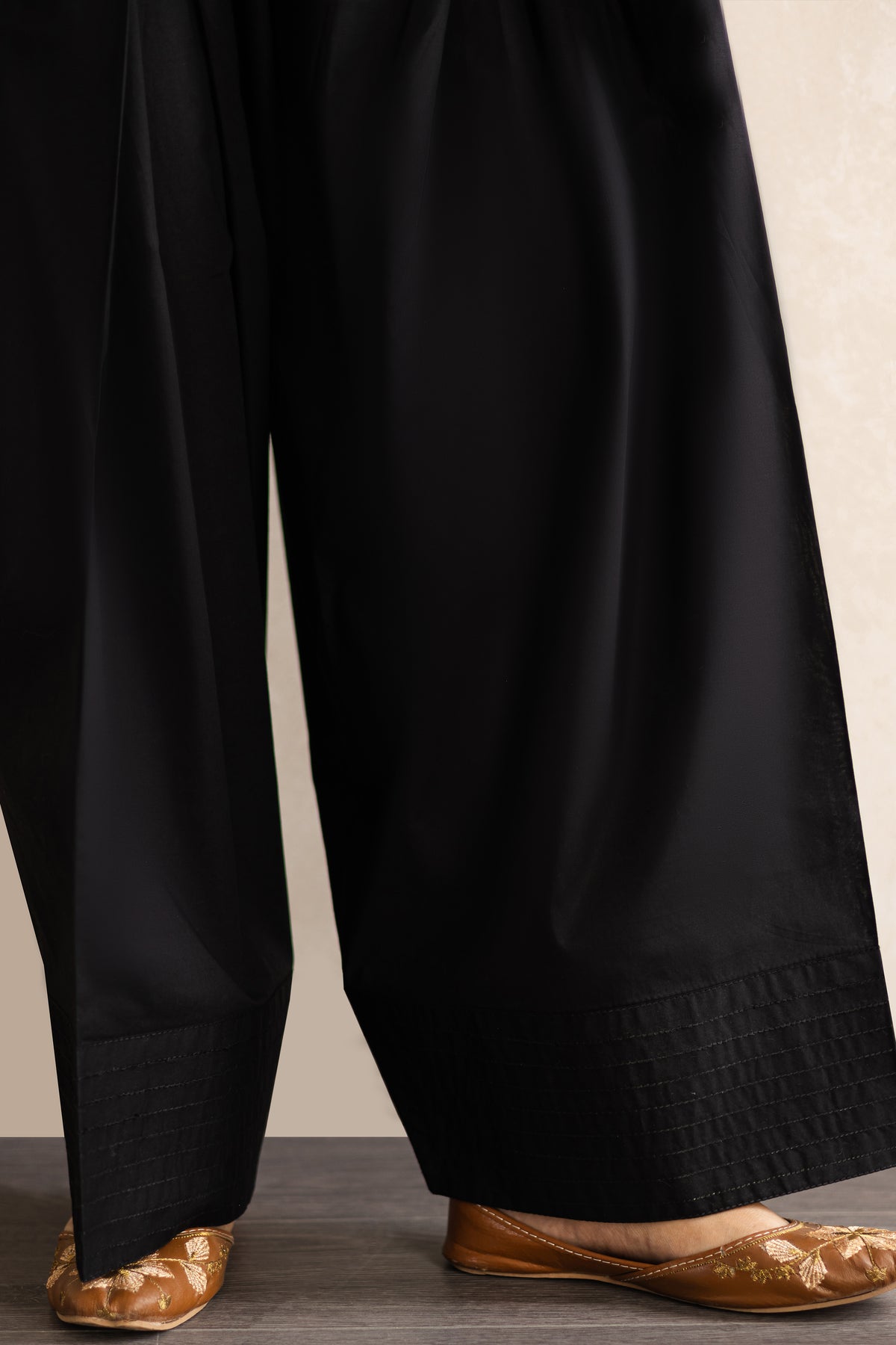 This Black cambric Farshi Shalwar features a flowing, relaxed fit with a soft flowy fabric, that ensures all-day wearability. The hem of the shalwar features an intricate stitch line. Perfect for both casual and festive occasions, they offer a timeless silhouette with a modern touch.