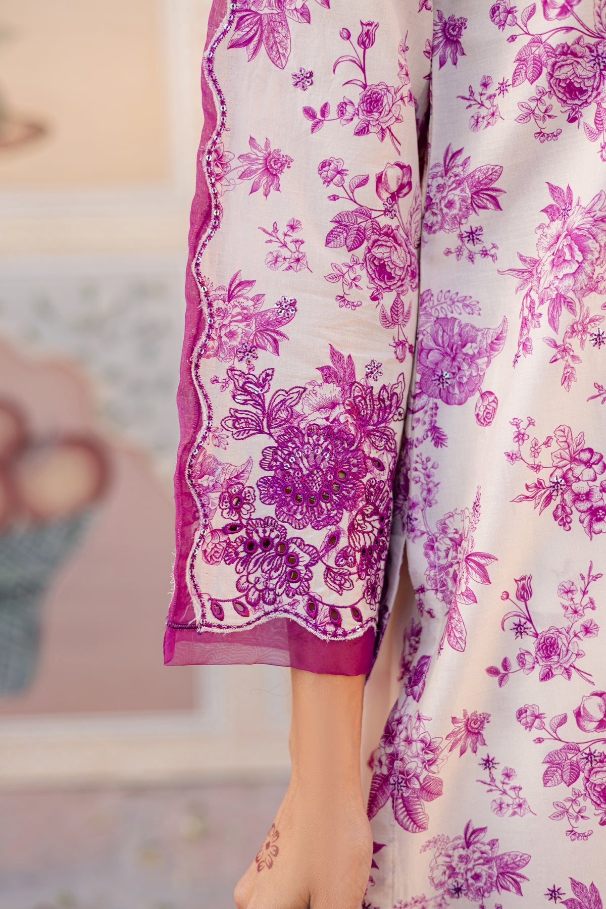 The shirt is paired with a cambric farshi shalwar, beautifully adorned with a sequin spread, which adds a touch of shimmer and luxury to the ensemble.