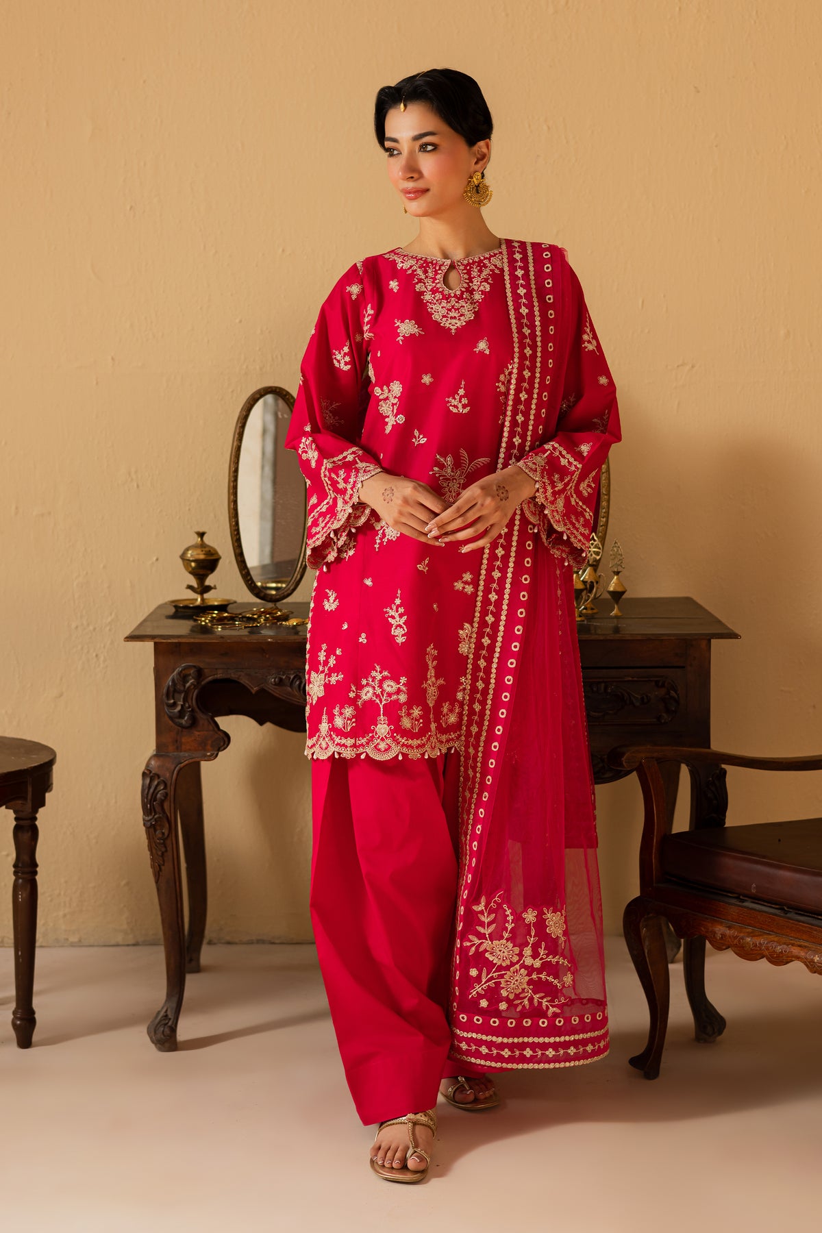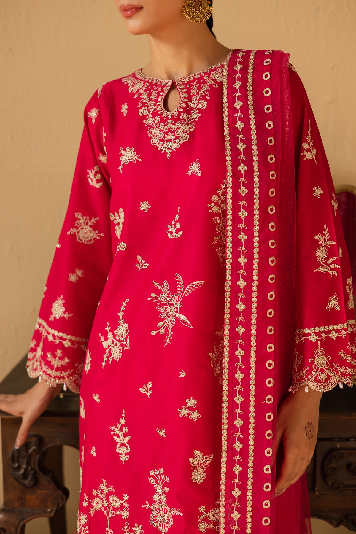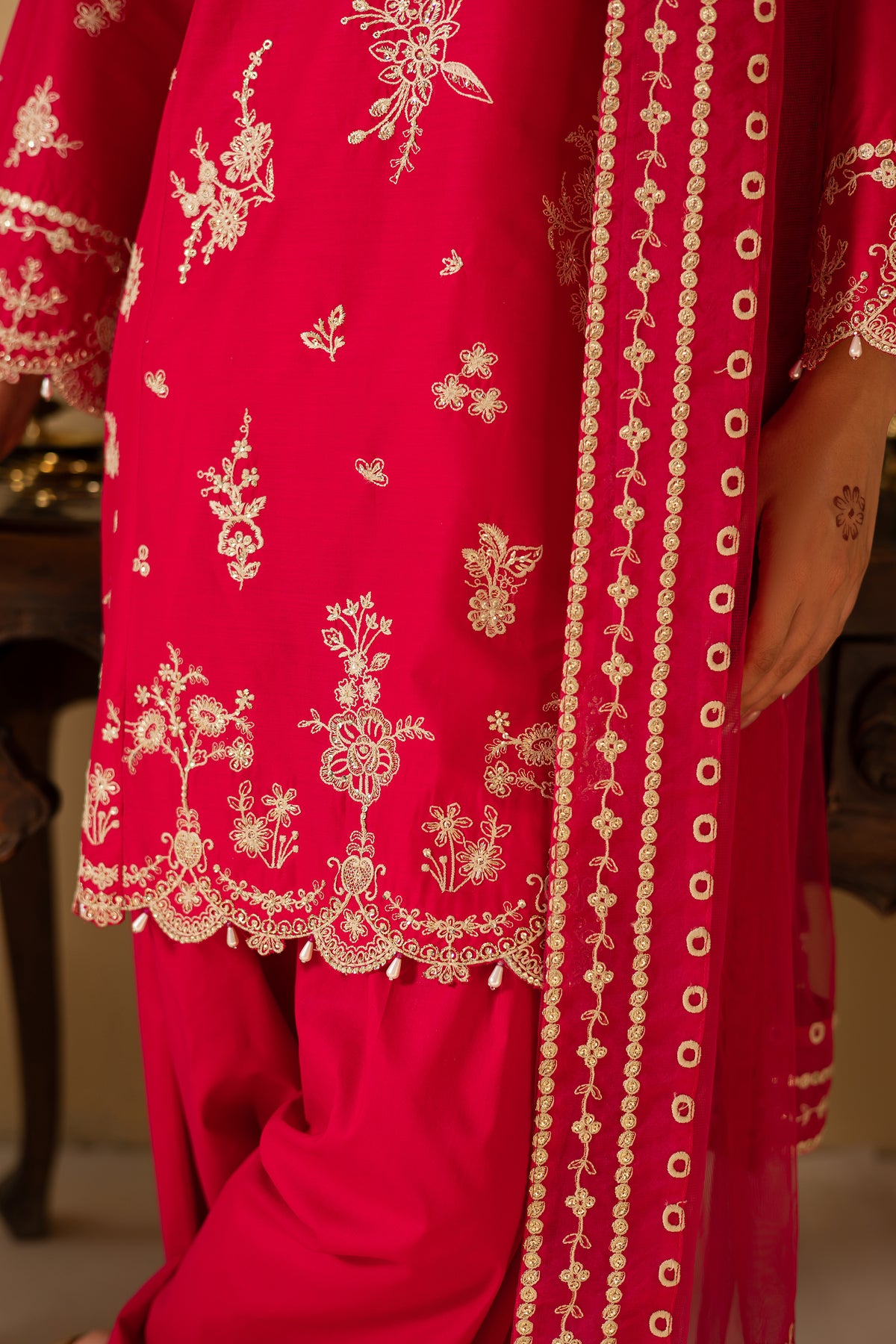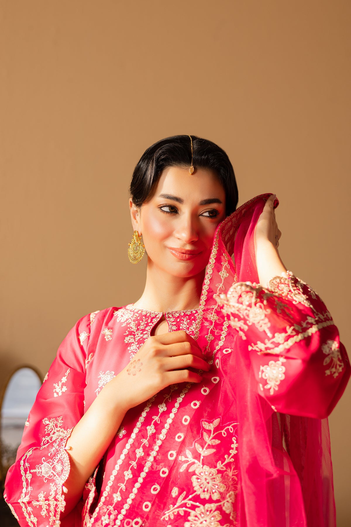 This graceful 3-piece outfit features a short bright pink pima lawn shirt intricately embellished with sequin and tilla embroidery. The all-over spread and composed hem are enhanced with matte threadwork, minimal boring, and a delicately scalloped finish, adding elegance and detail to the design. The shirt boasts flared sleeves with matching spread and border, adorned with subtle beadwork at the sleeve and hem for a refined touch.
