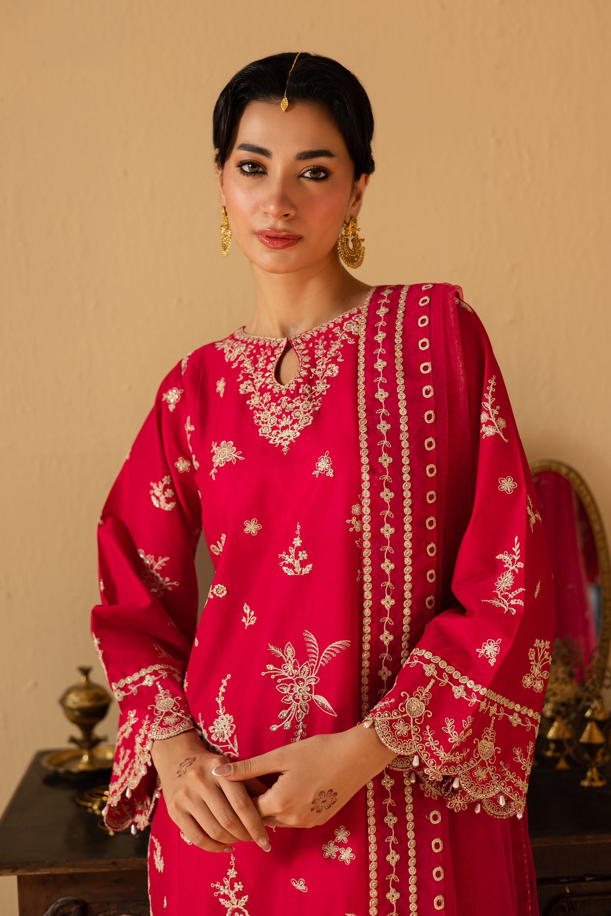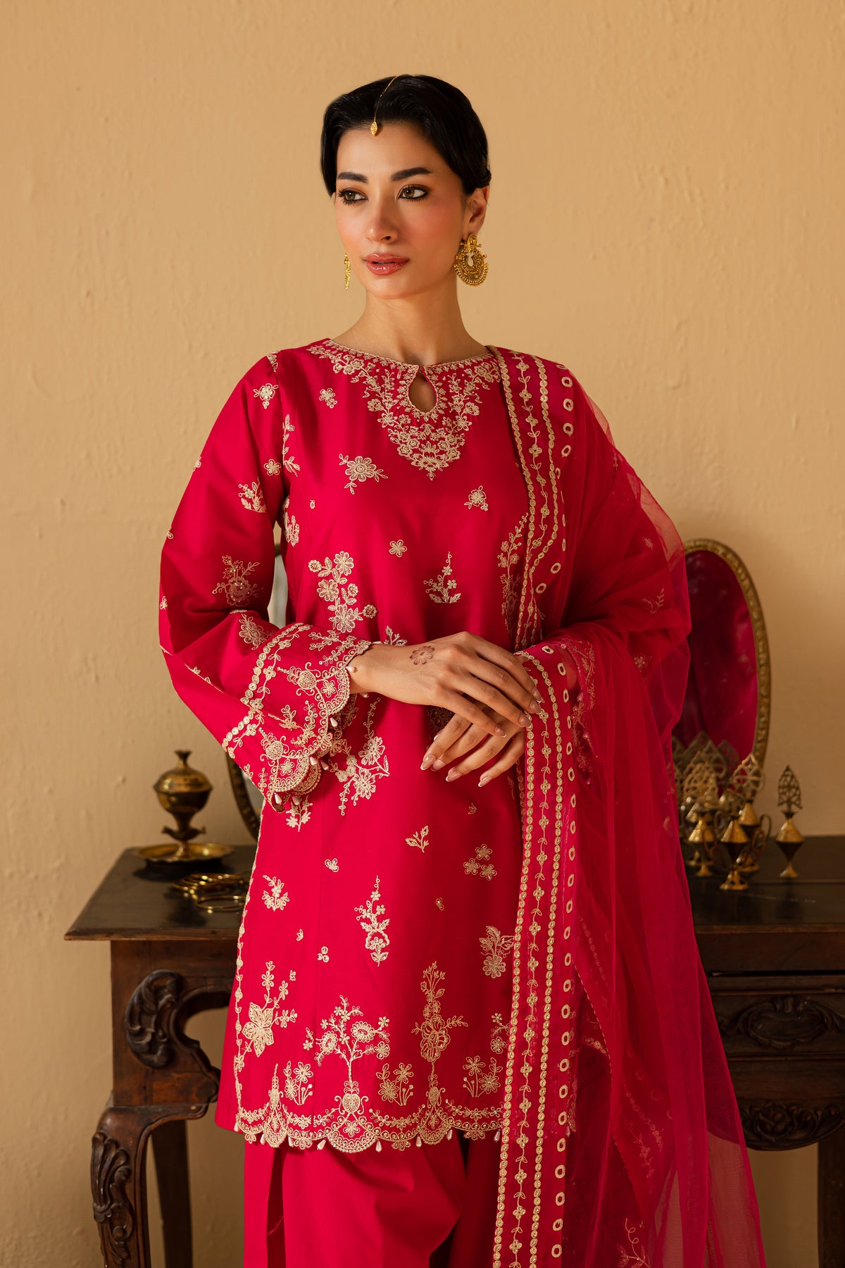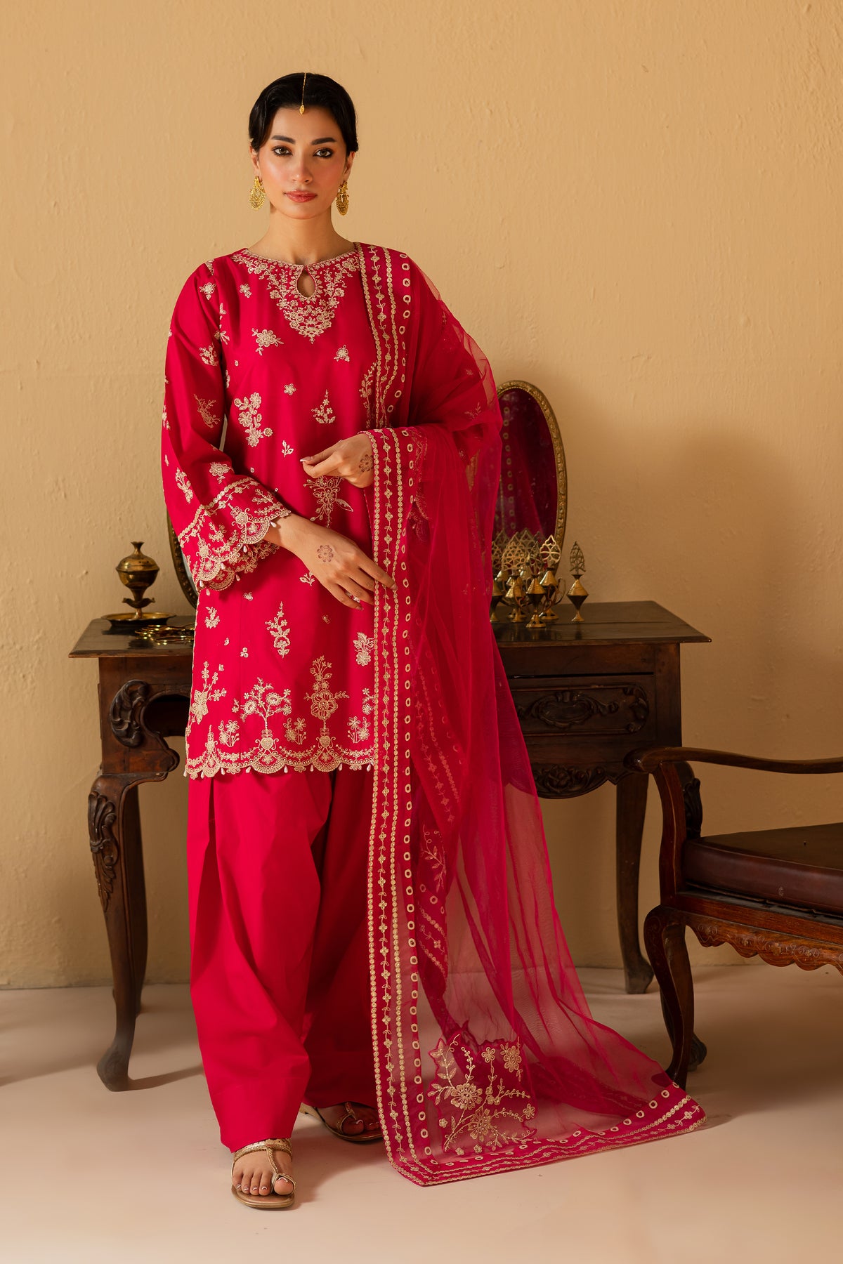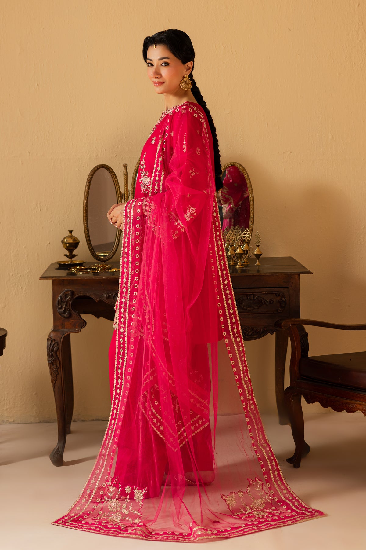 This graceful 3-piece outfit features a short bright pink pima lawn shirt intricately embellished with sequin and tilla embroidery. The all-over spread and composed hem are enhanced with matte threadwork, minimal boring, and a delicately scalloped finish, adding elegance and detail to the design. The shirt boasts flared sleeves with matching spread and border, adorned with subtle beadwork at the sleeve and hem for a refined touch.