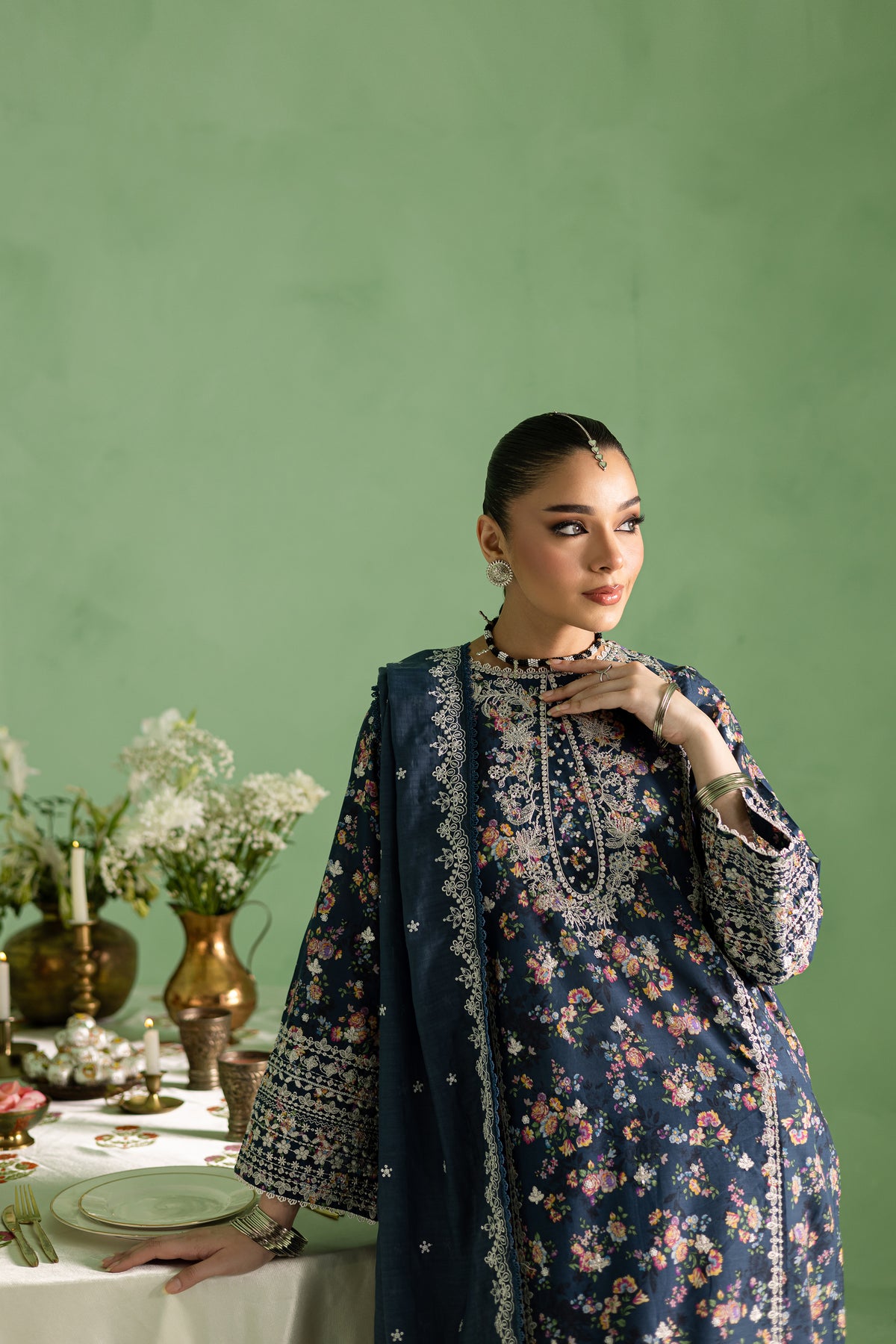The swiss voile dyed dupatta, with embroidery at the borders and spread, drapes effortlessly, bringing a delicate, airy finish to the ensemble while maintaining a refined and sophisticated aesthetic.