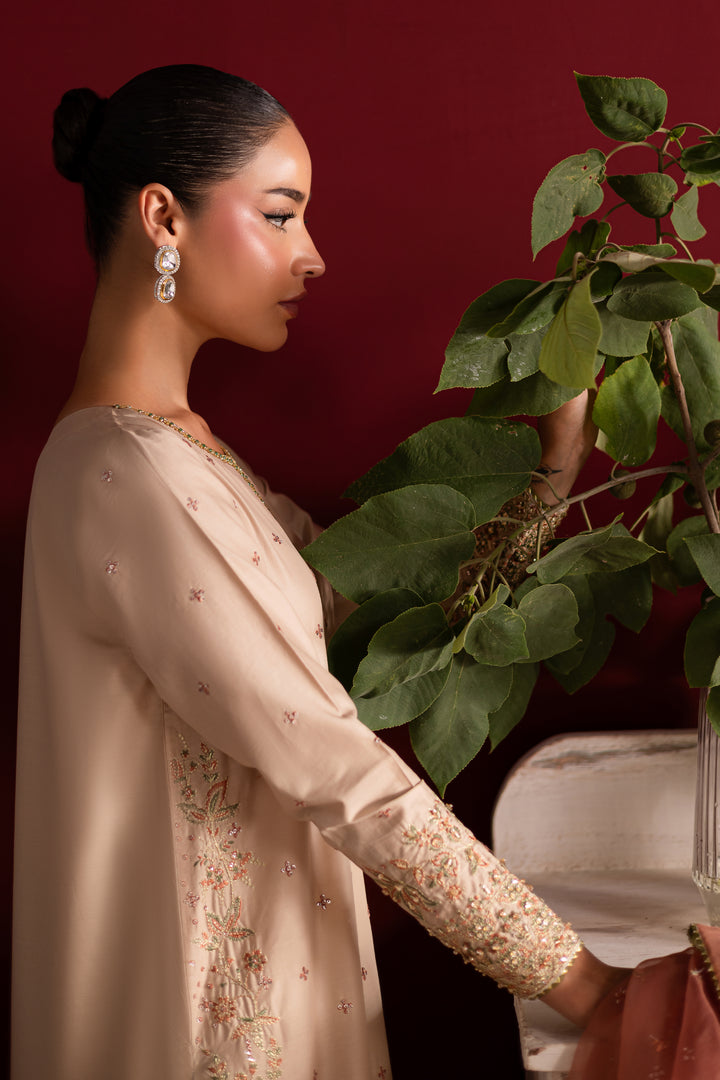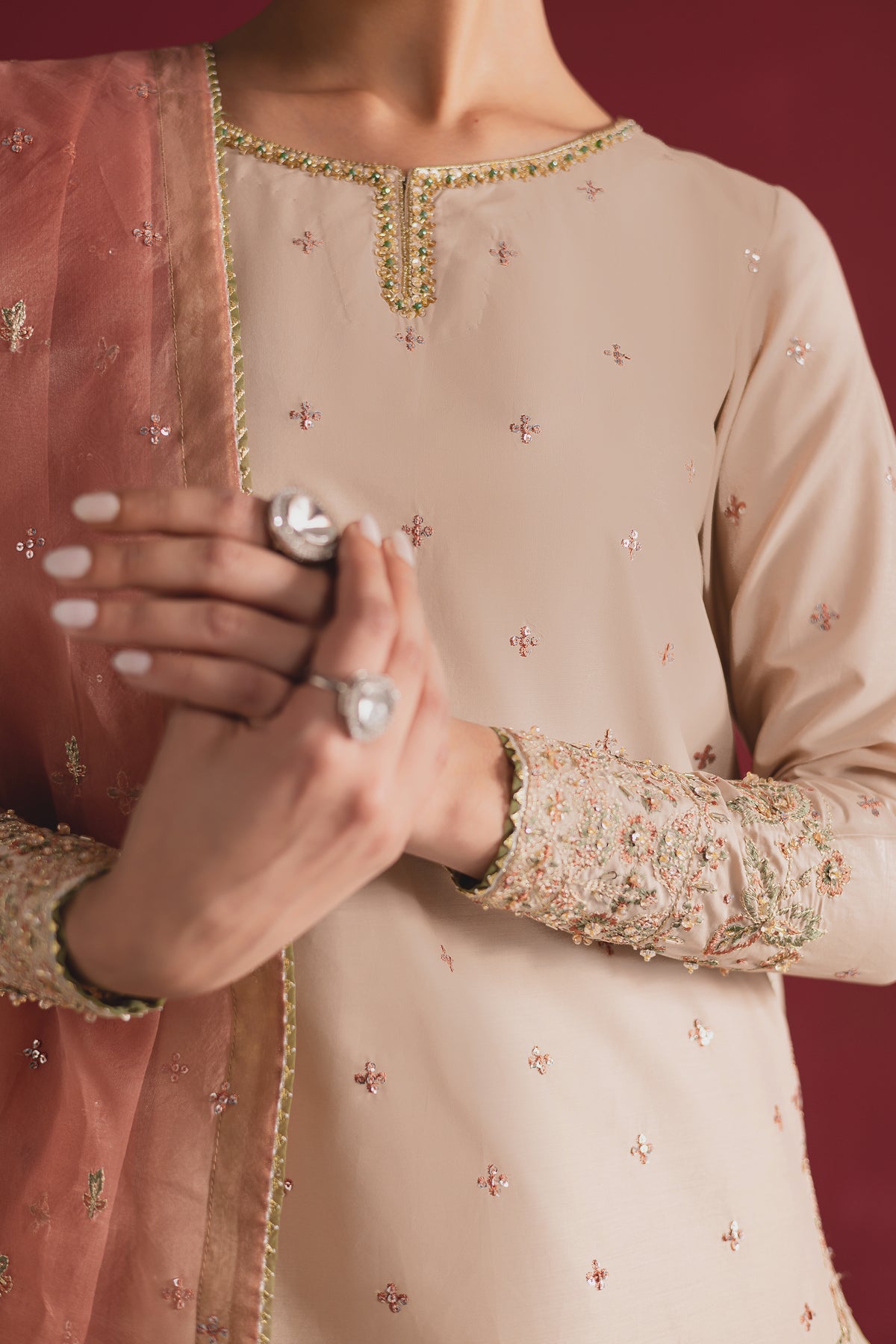 A composed long shirt in soft beige Egyptian cotton, beautifully adorned with intricate embroidery and elevated by direct adda work on the neckline and sleeves for a refined, handcrafted touch.