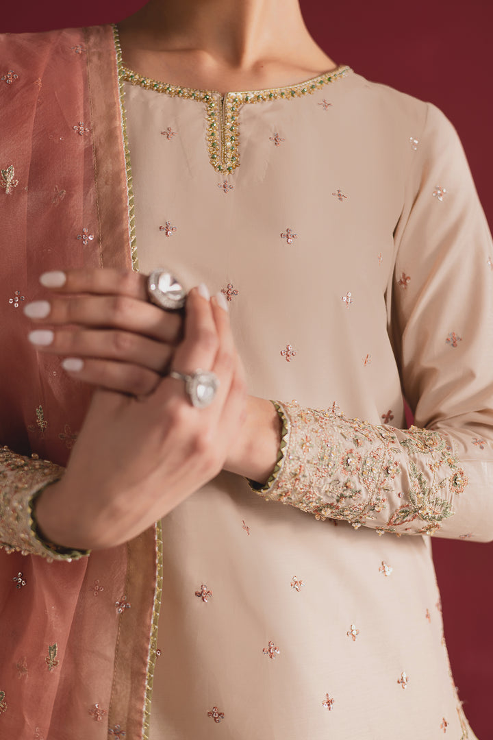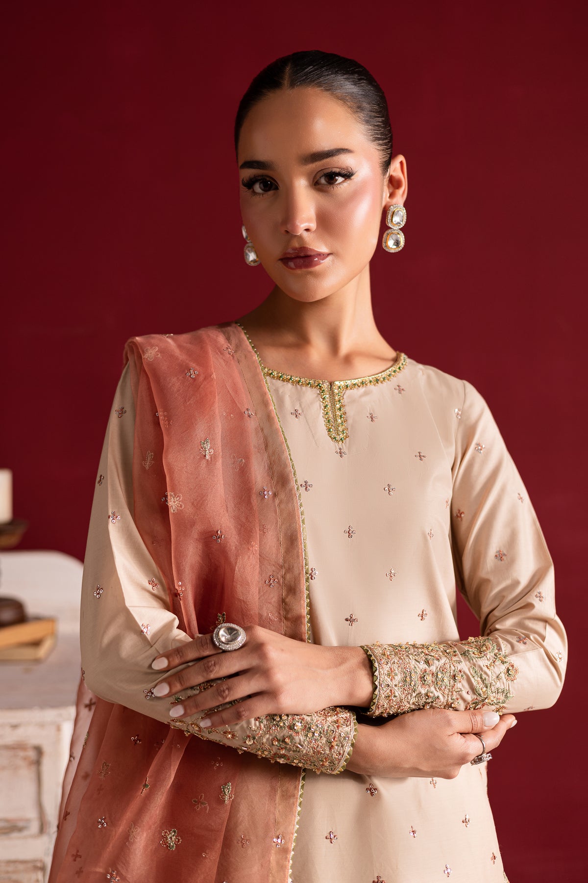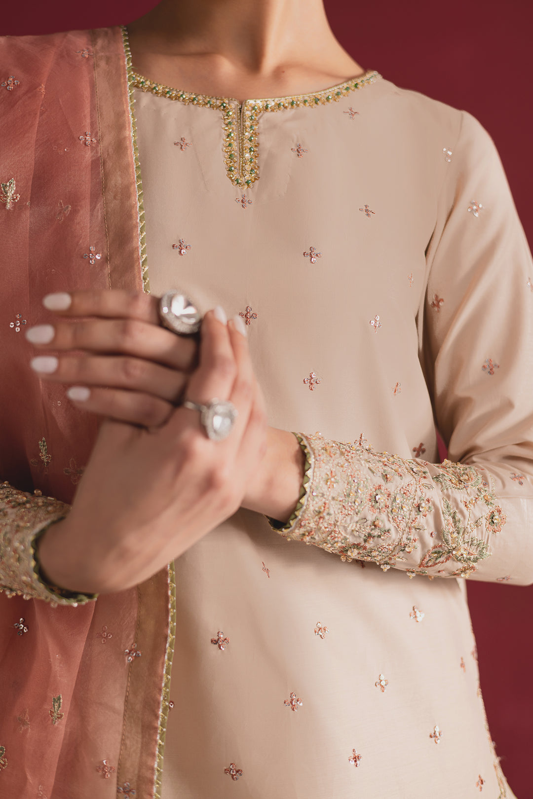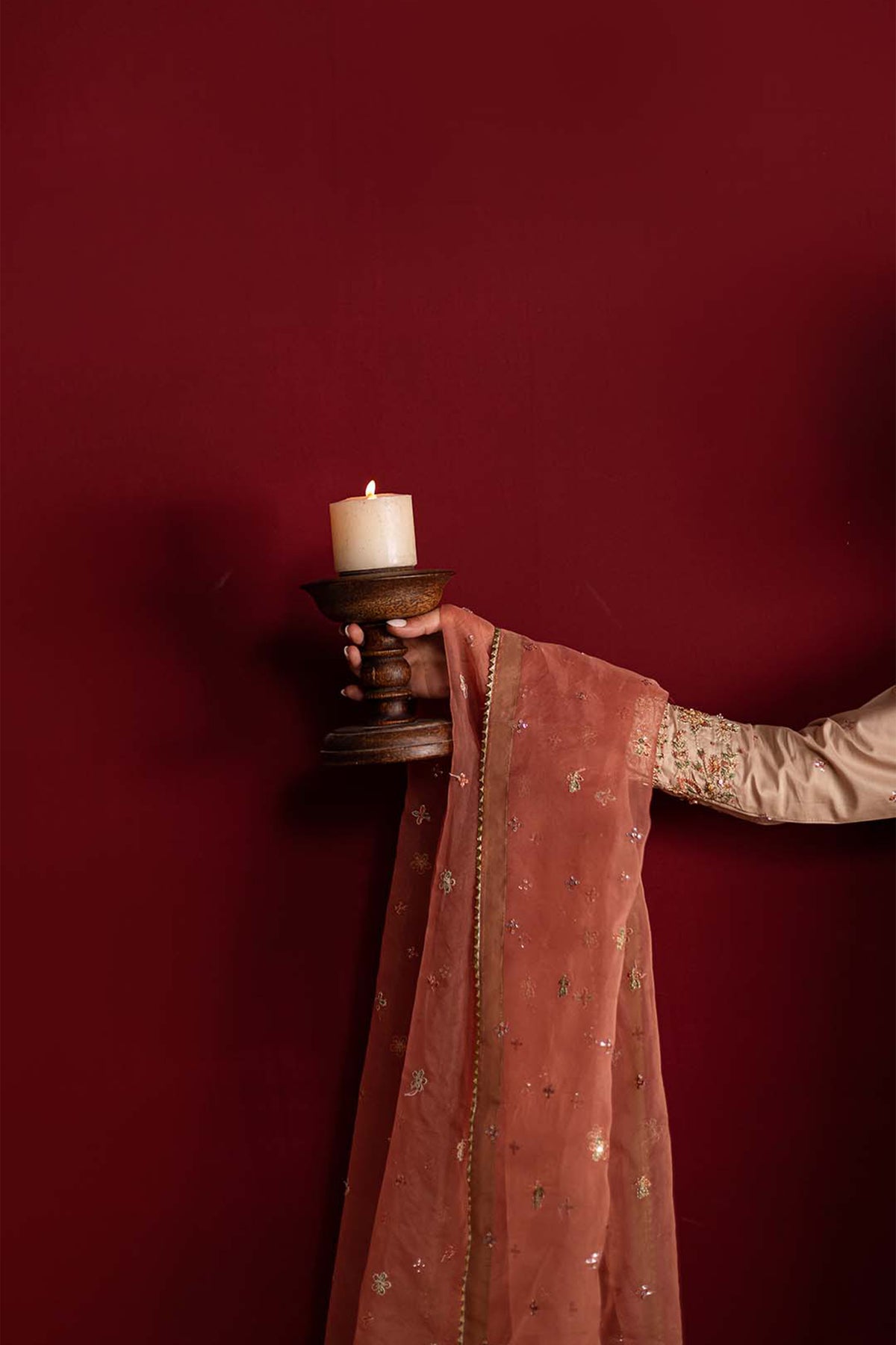 Finished with a contrasting orange organza dupatta, featuring a delicate sequin spread and a minimal border trimmed with organza piping and samosa lace for a subtle statement.