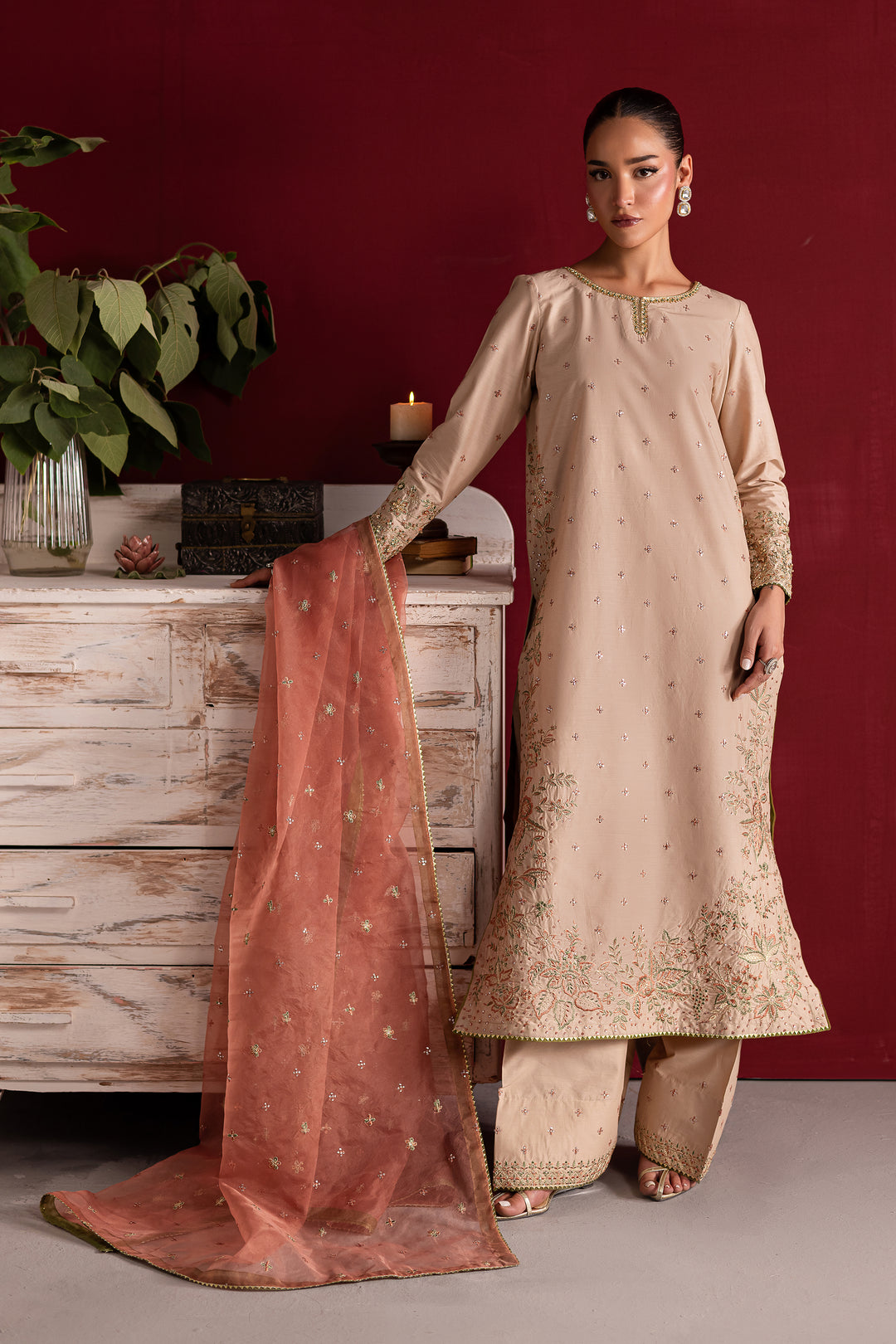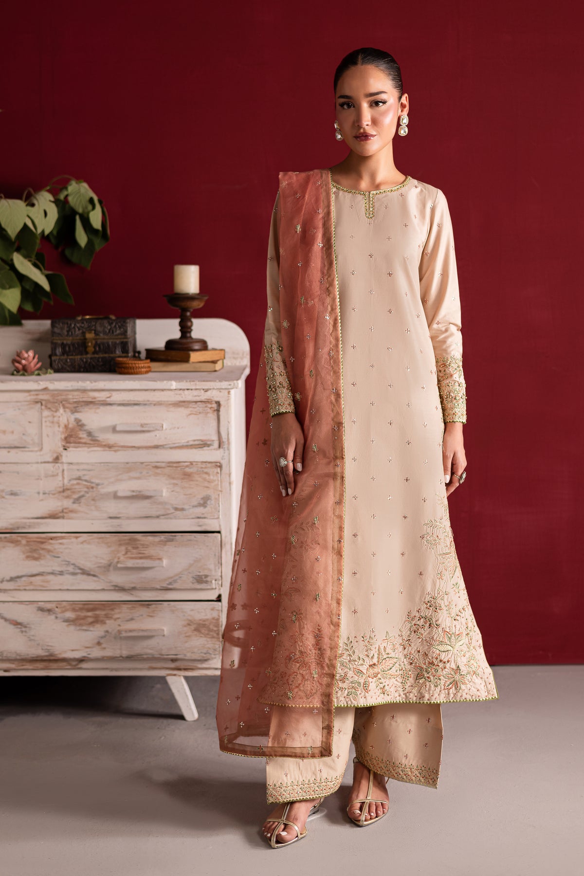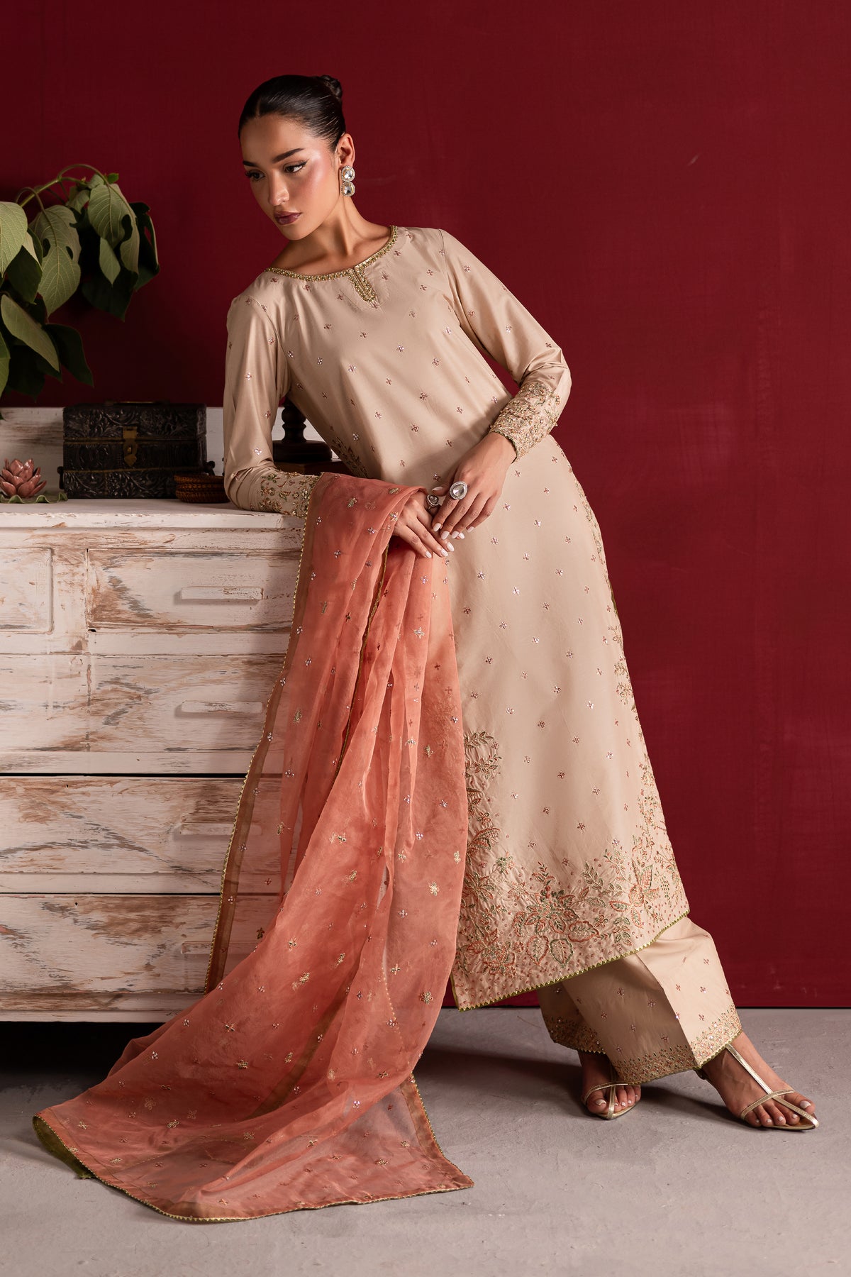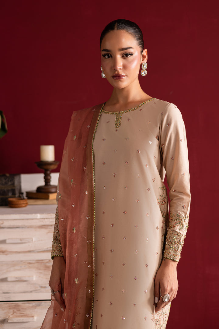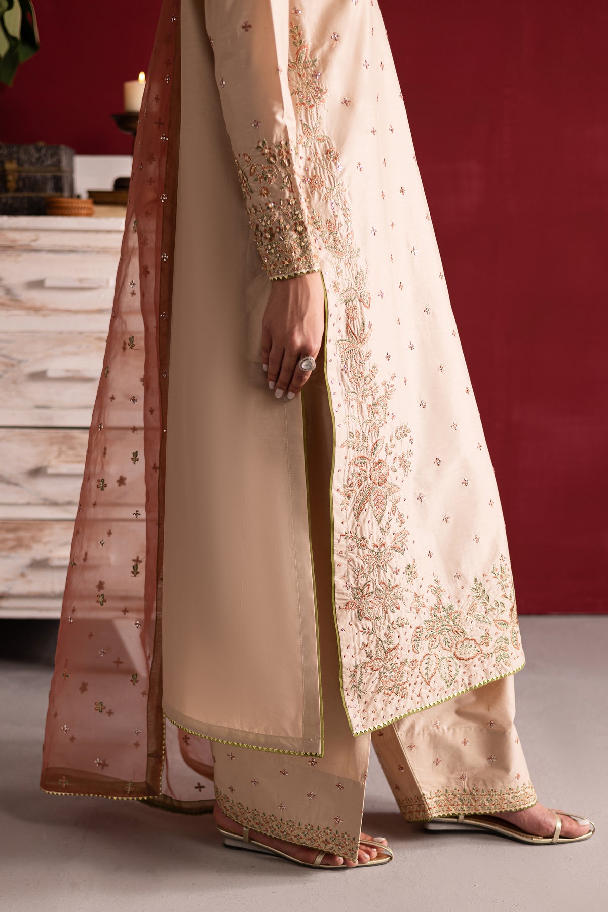 Finished with a contrasting orange organza dupatta, featuring a delicate sequin spread and a minimal border trimmed with organza piping and samosa lace for a subtle statement.