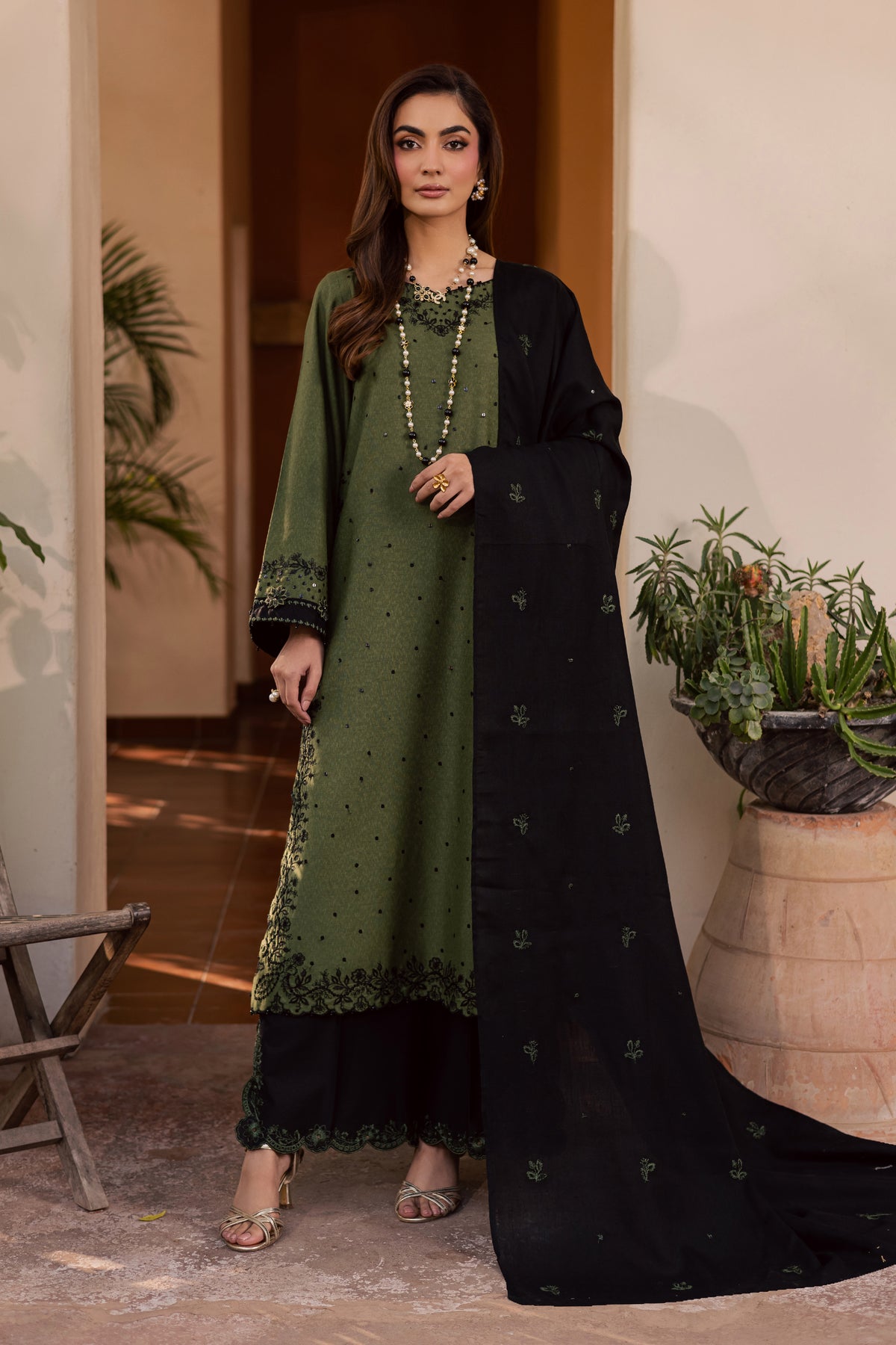 A black embroidered wool shawl completes the set, adding a strong finishing layer.