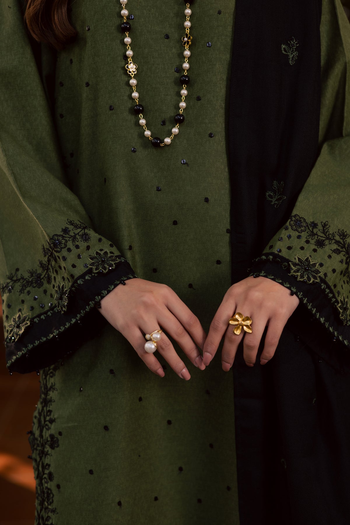 This 3-piece green moss textured cotton ensemble features a composed embroidered shirt detailed with contrast embroidery and patchwork elements. The design balances structure with intricate surface detailing.