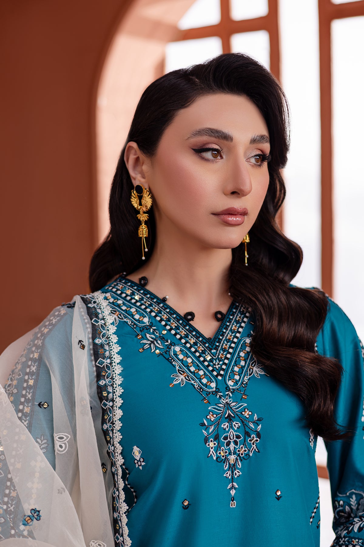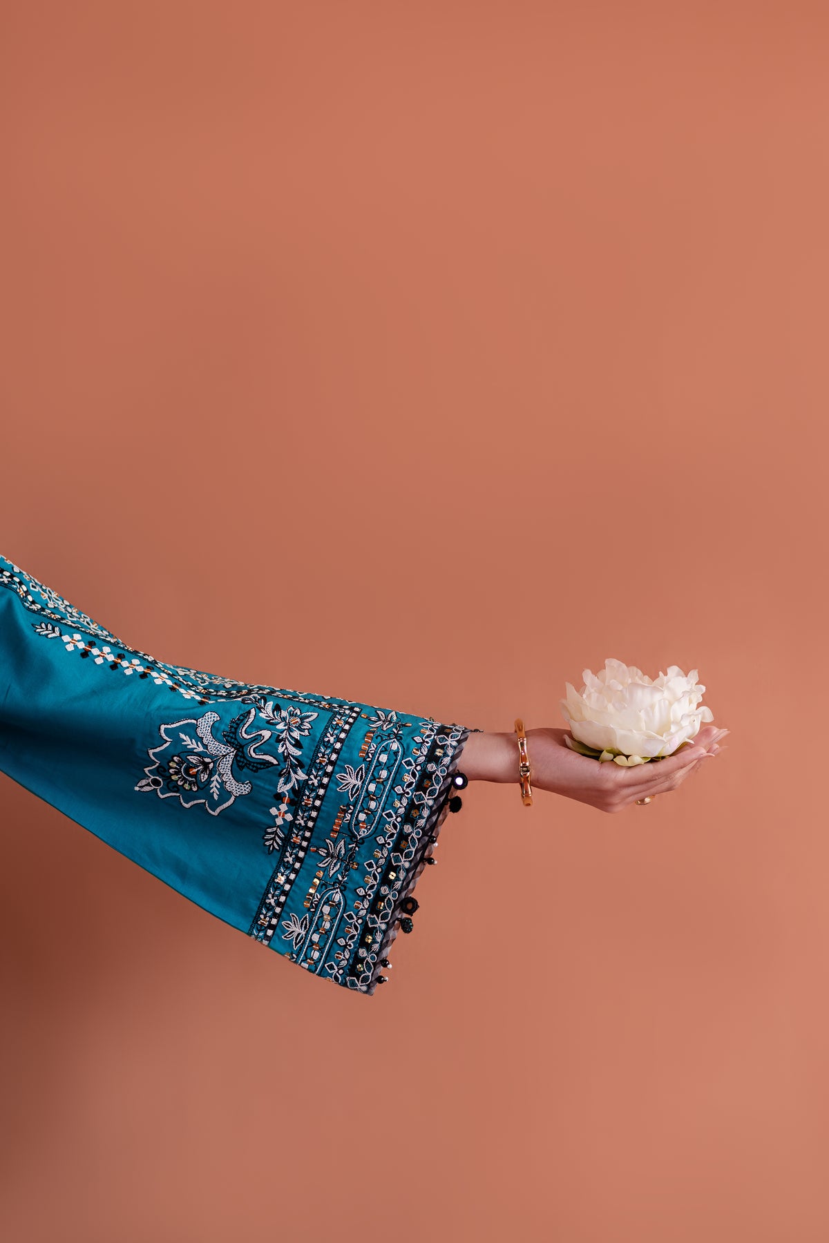 This chic blue pima lawn short shirt features heavily composed embroidery at the front, creating a bold and intricate design that captures attention. The sleeves are also heavily embroidered, adding an elegant and striking touch to the look.