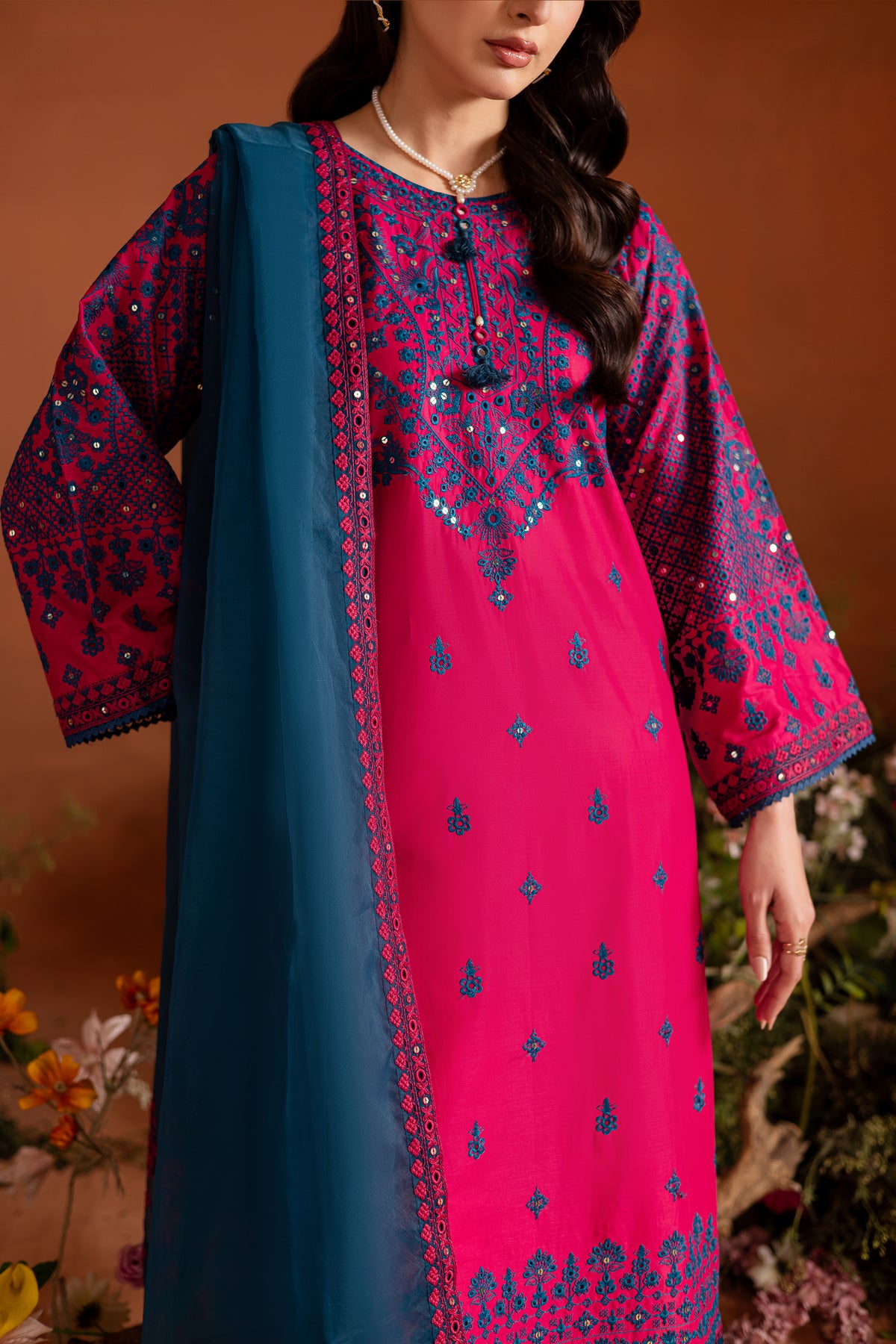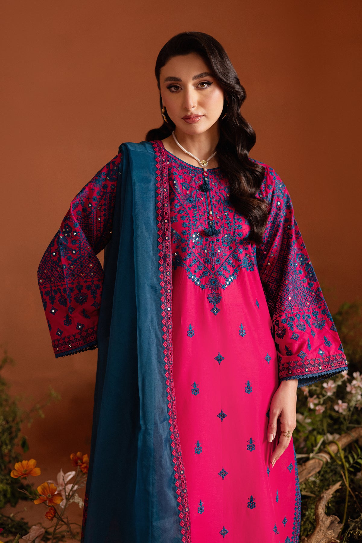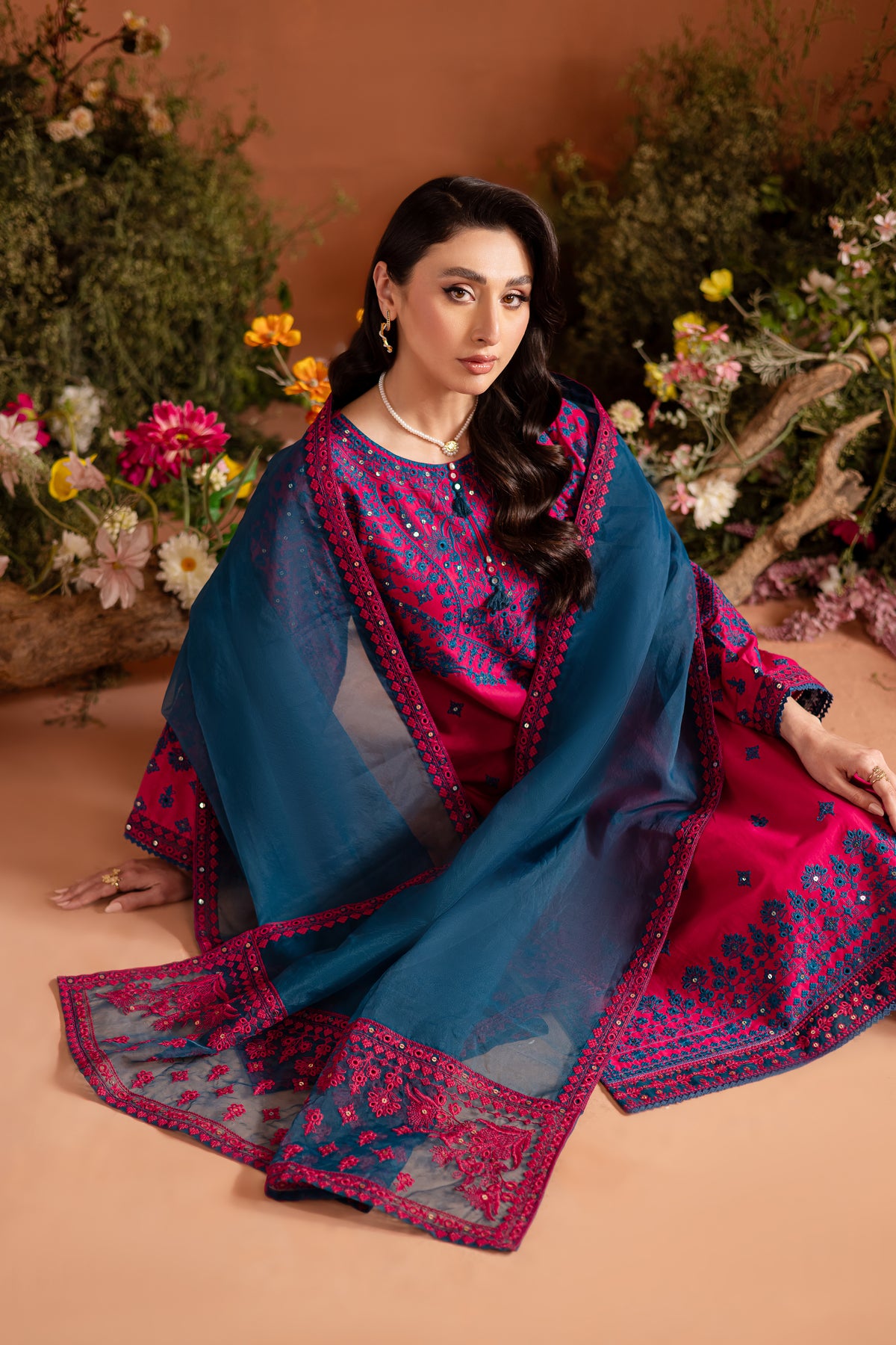 The look is completed with a contrasting embroidered organza dupatta, offering a refined and graceful addition to the ensemble with its delicate yet bold embroidery, perfectly complementing the rest of the outfit.