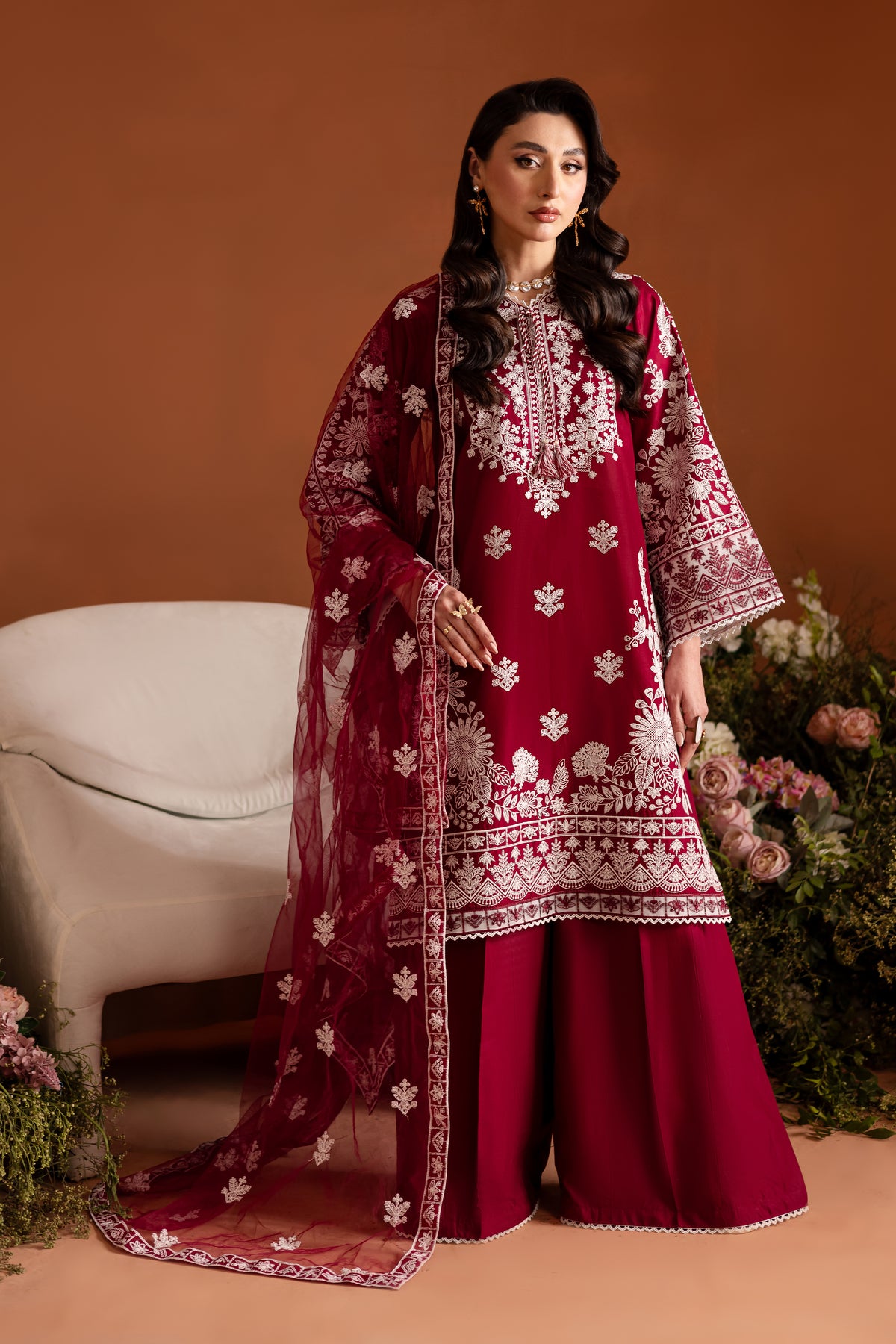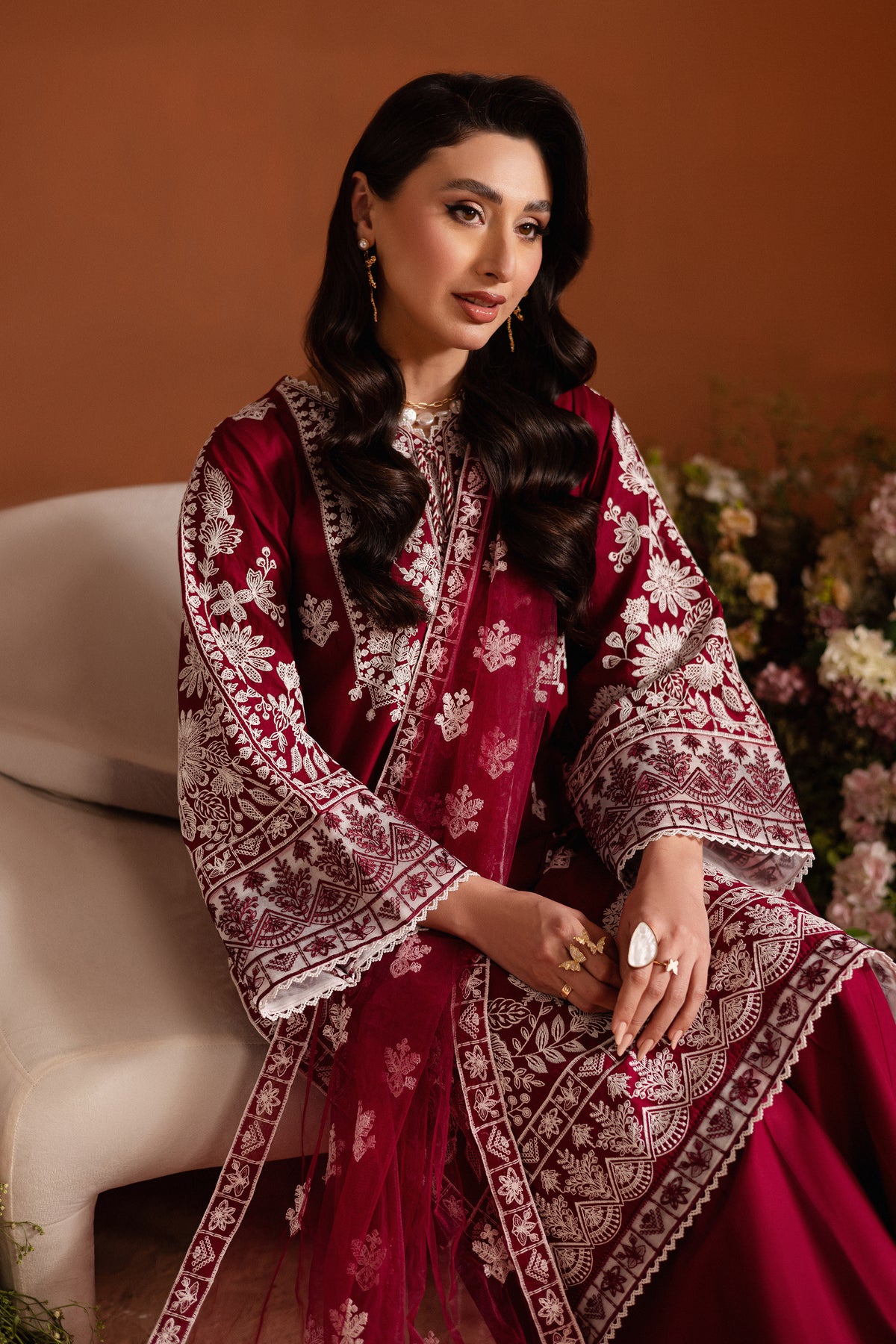 The burgundy pima lawn fully embroidered shirt features a meticulously composed neckline and hem, creating a refined and elegant structure. The embroidery is done with matte thread in a contrasting color, adding depth and highlighting the intricate patterns. The shirt and sleeve borders are crafted with organza, lending a delicate and airy feel to the design. All the edges are finished with beautiful crochet lace, enhancing the shirt’s overall sophistication and charm.