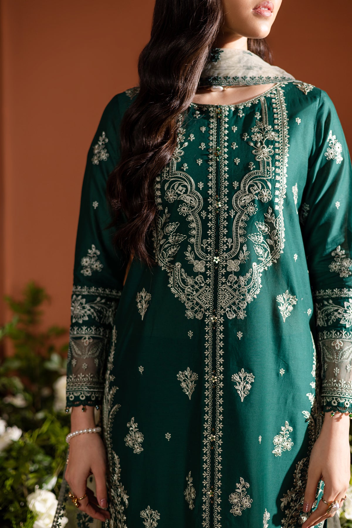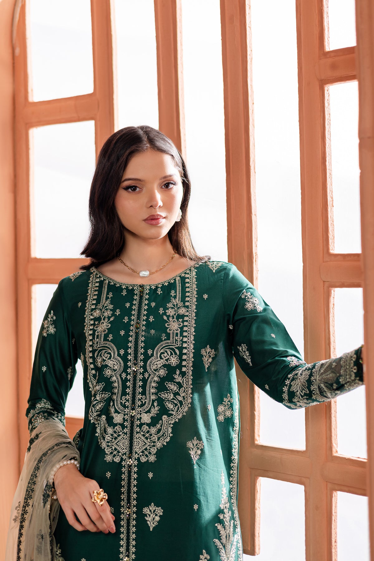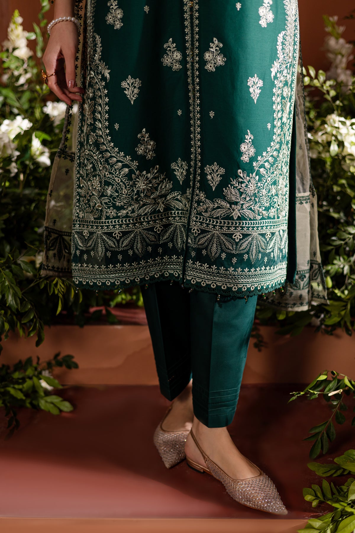 This elegant emerald green pima lawn front-open shirt features heavy embroidery all over, creating a beautifully intricate and eye-catching design. The fitted sleeves are embroidered with delicate organza borders, finished with crochet lace, adding a touch of sophistication and refinement to the look.