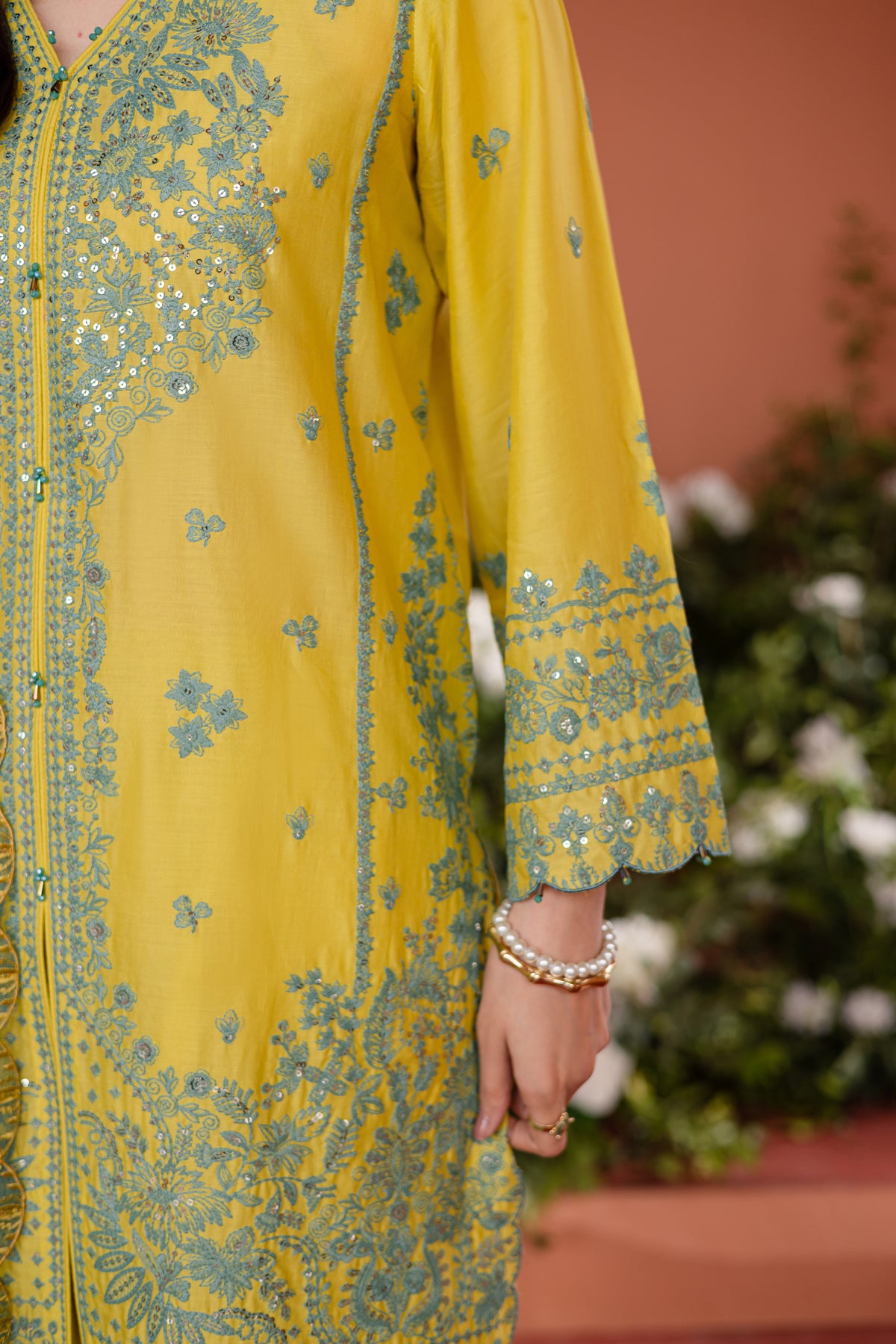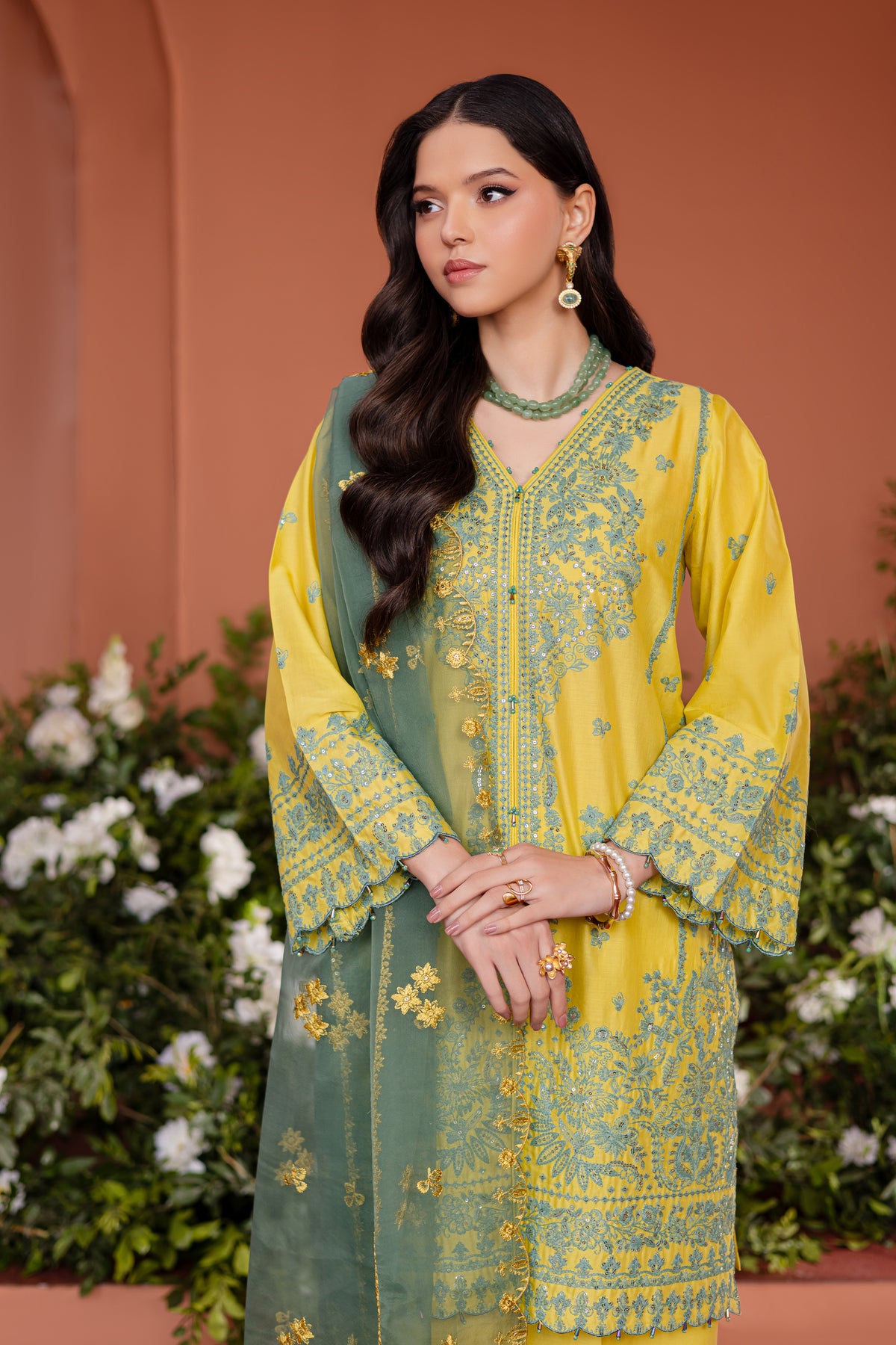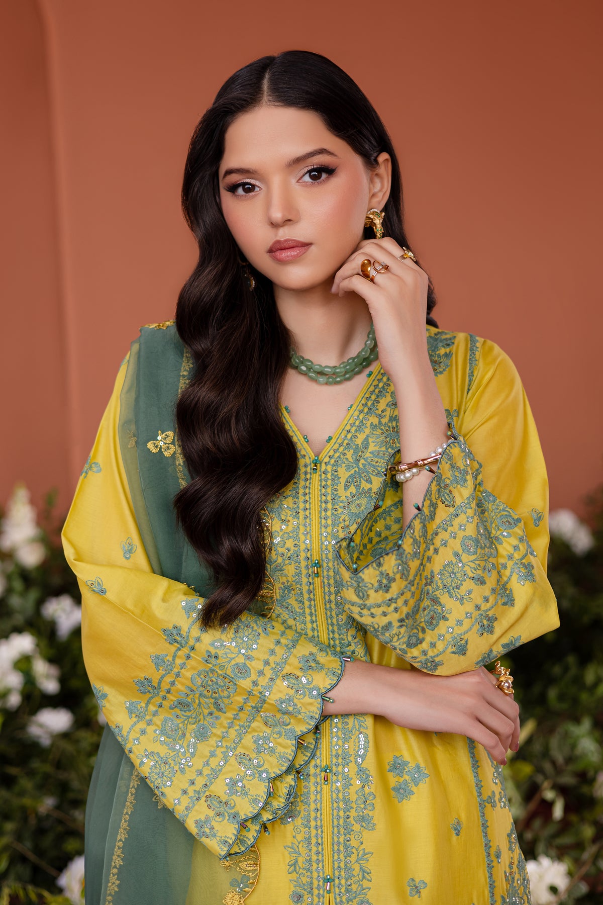 This elegant fully embroidered golden green pima lawn front-open shirt features intricate contrasting embroidery all over, creating a visually stunning design. The shirt is finished with exquisite kawiya finishing, adding a unique and refined touch to the overall look.