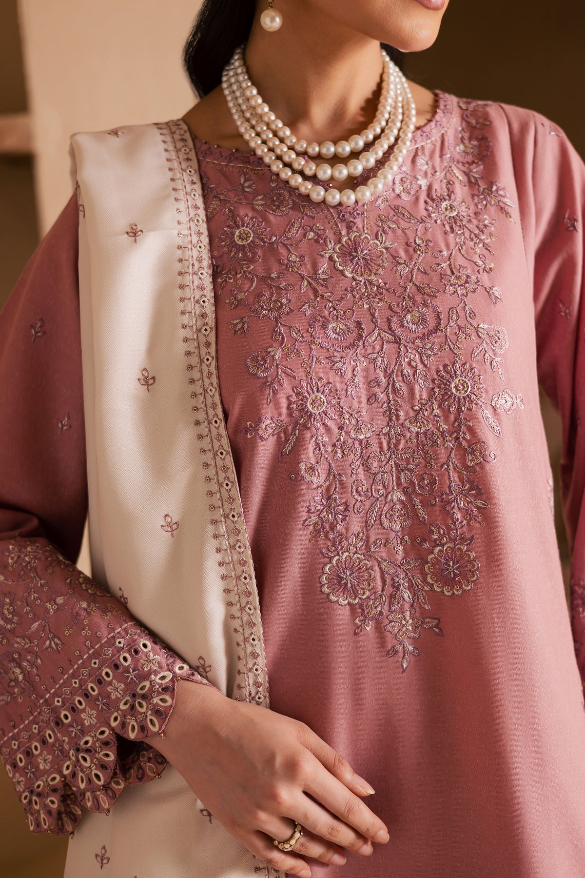 This 3 piece tea pink ensemble reflects refined elegance with its paneled shirt featuring an intricately embroidered neckline and composed side panels. The sleeves are adorned with borders showcasing delicate schiffli embroidery, adding texture and sophistication to the overall design.