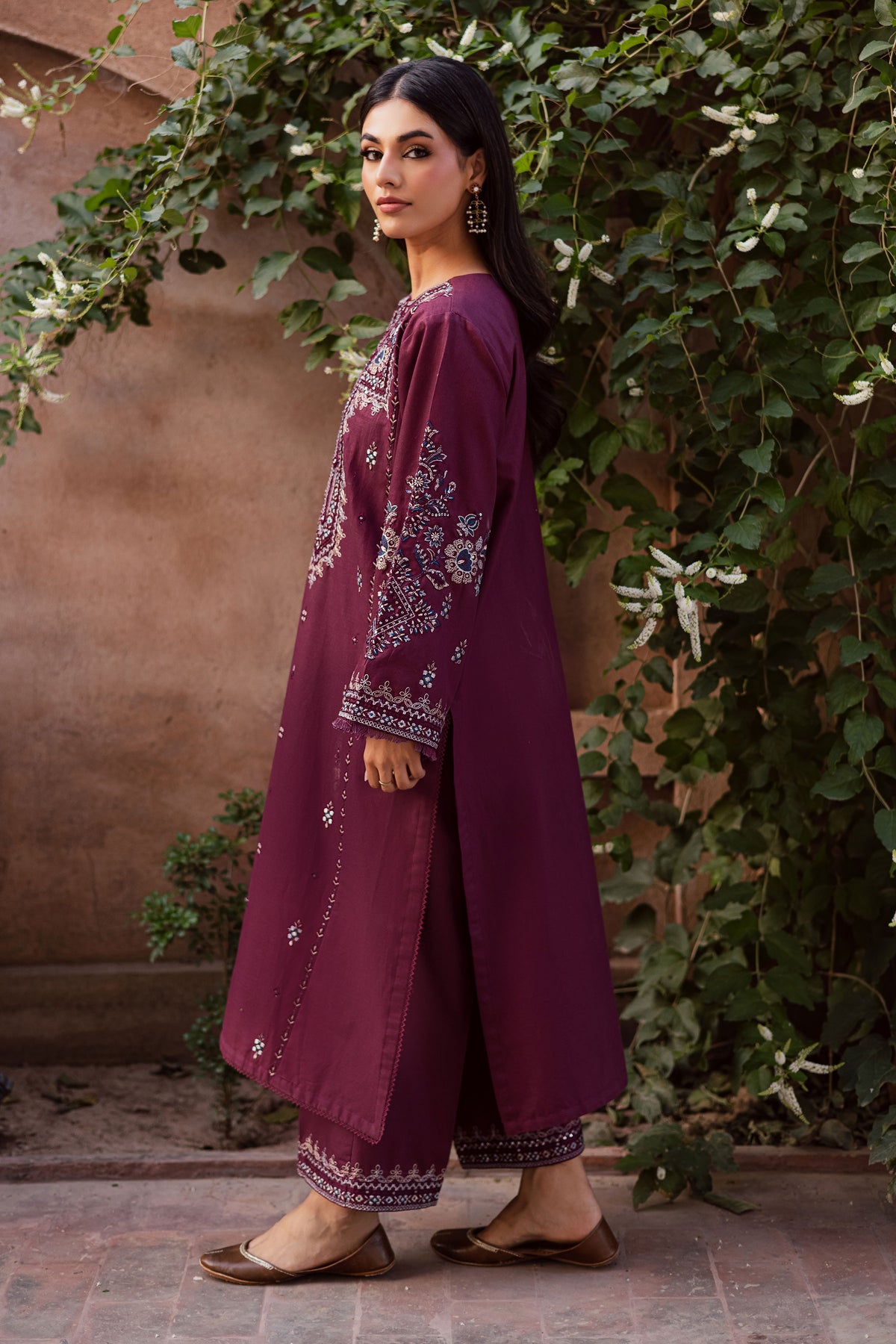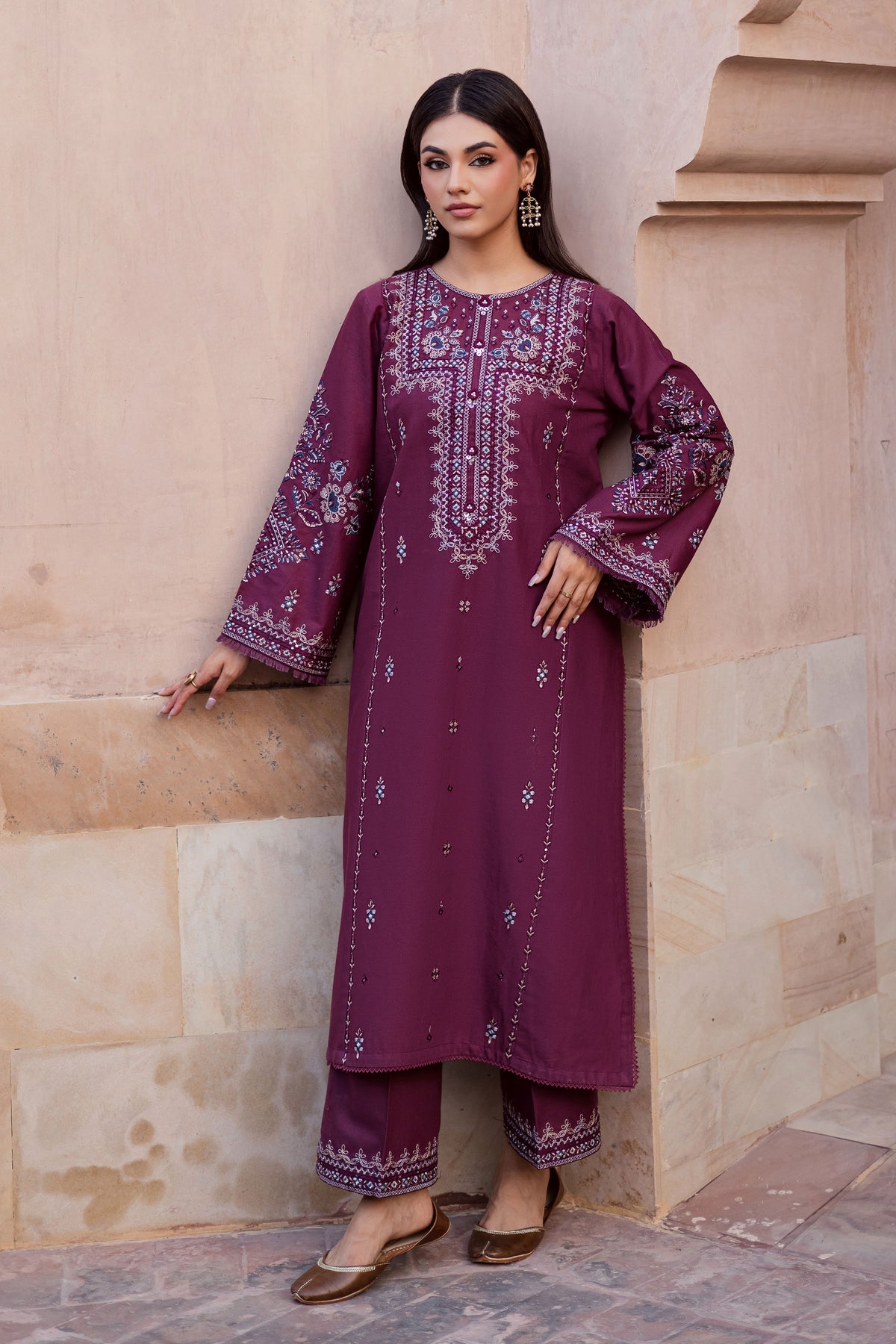 This refined mauve two piece khaddar ensemble features a three-paneled shirt beautifully detailed with an embroidered neckline and a delicate spread across the front. The neckline is enhanced with a material collage, adding texture and depth to the design. The embroidered sleeves are finished with soft fringes at the hem, lending a touch of movement and modern charm to the traditional silhouette.
