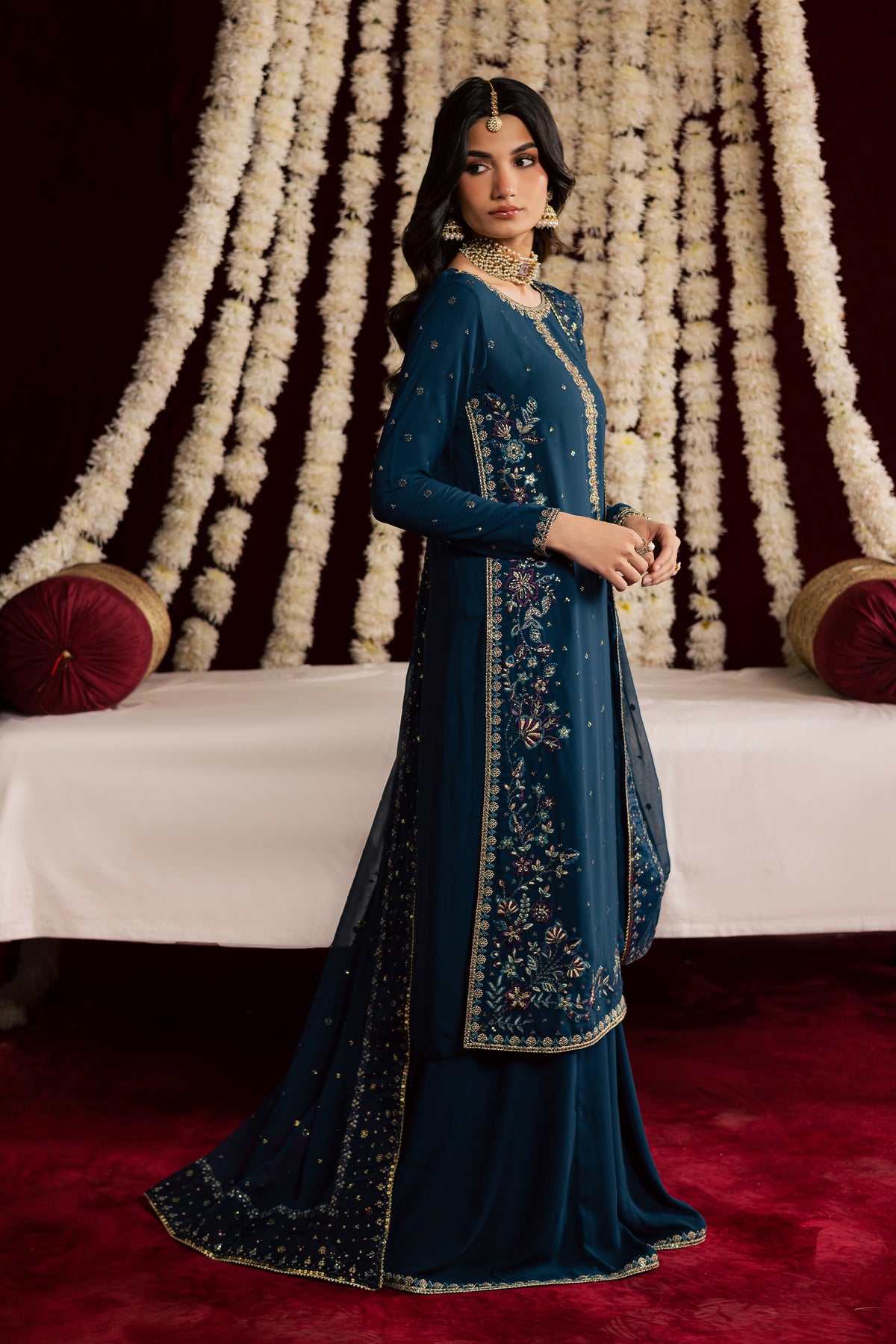 A crinkle chiffon dupatta completes the look, adorned with embroidered borders on all four sides and a subtle all-over spread at the center, finished with samosa lace for a refined, luxurious touch.