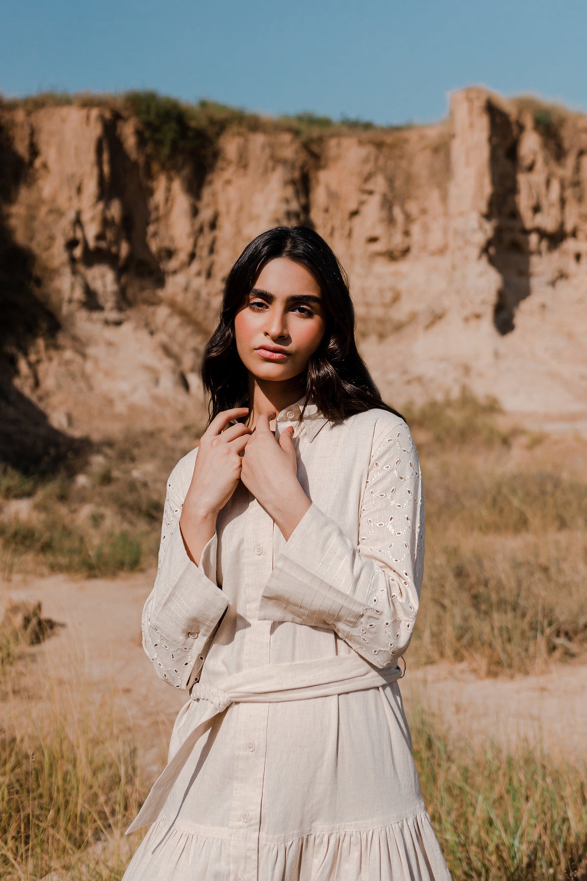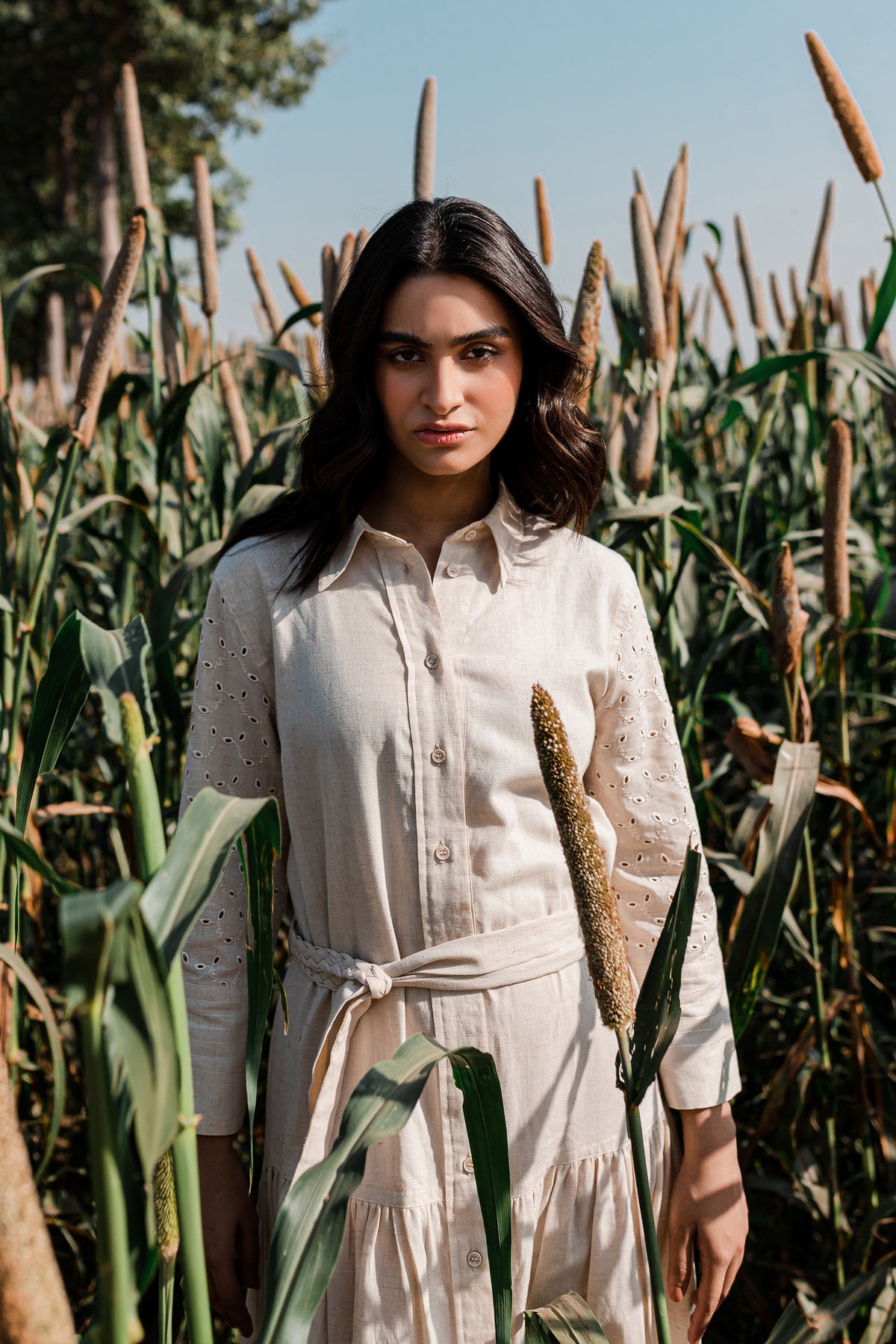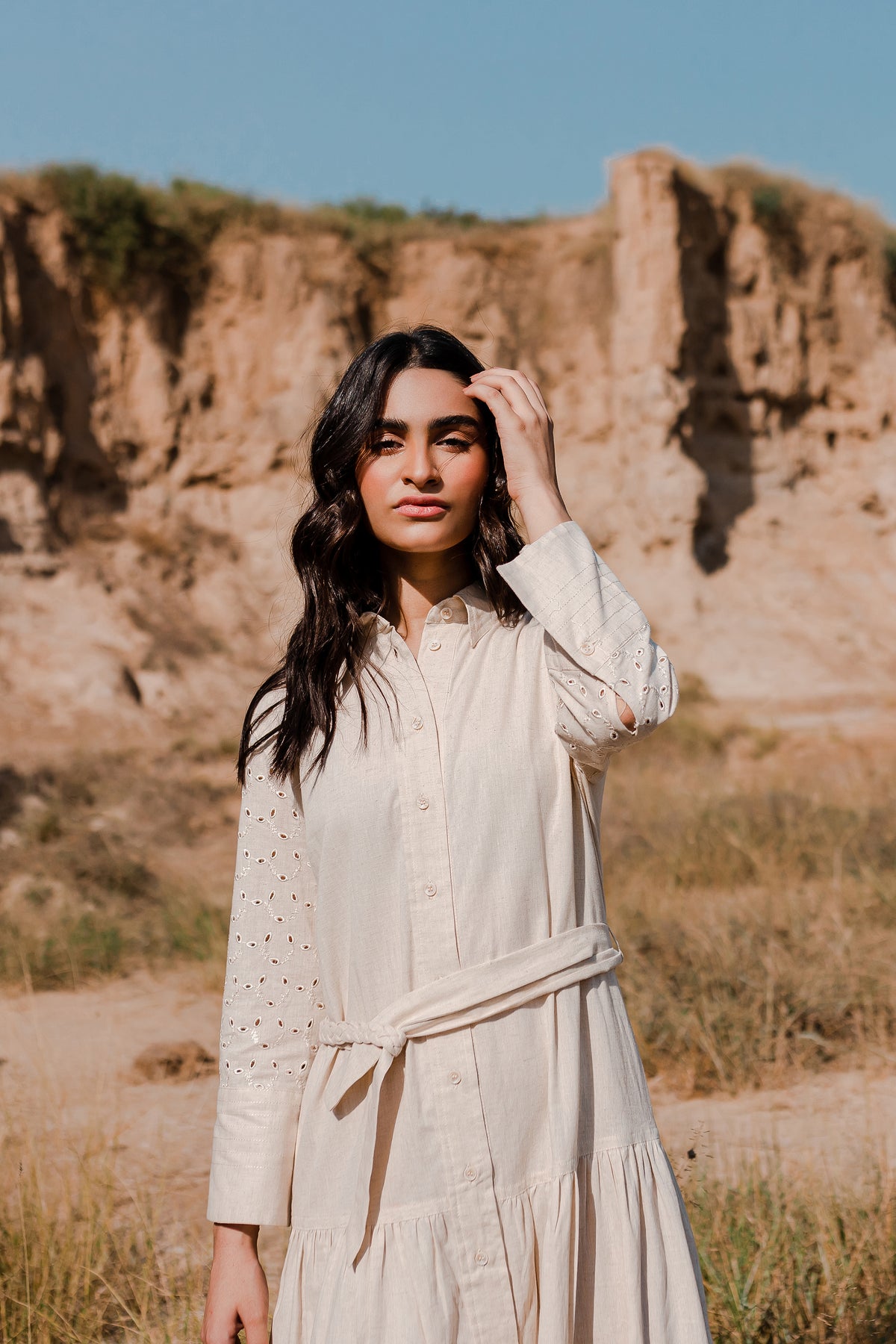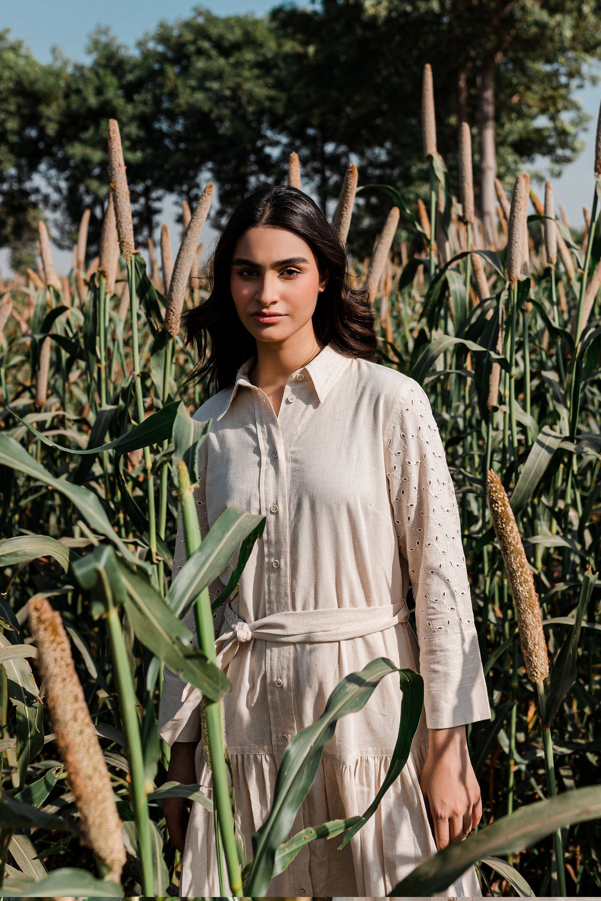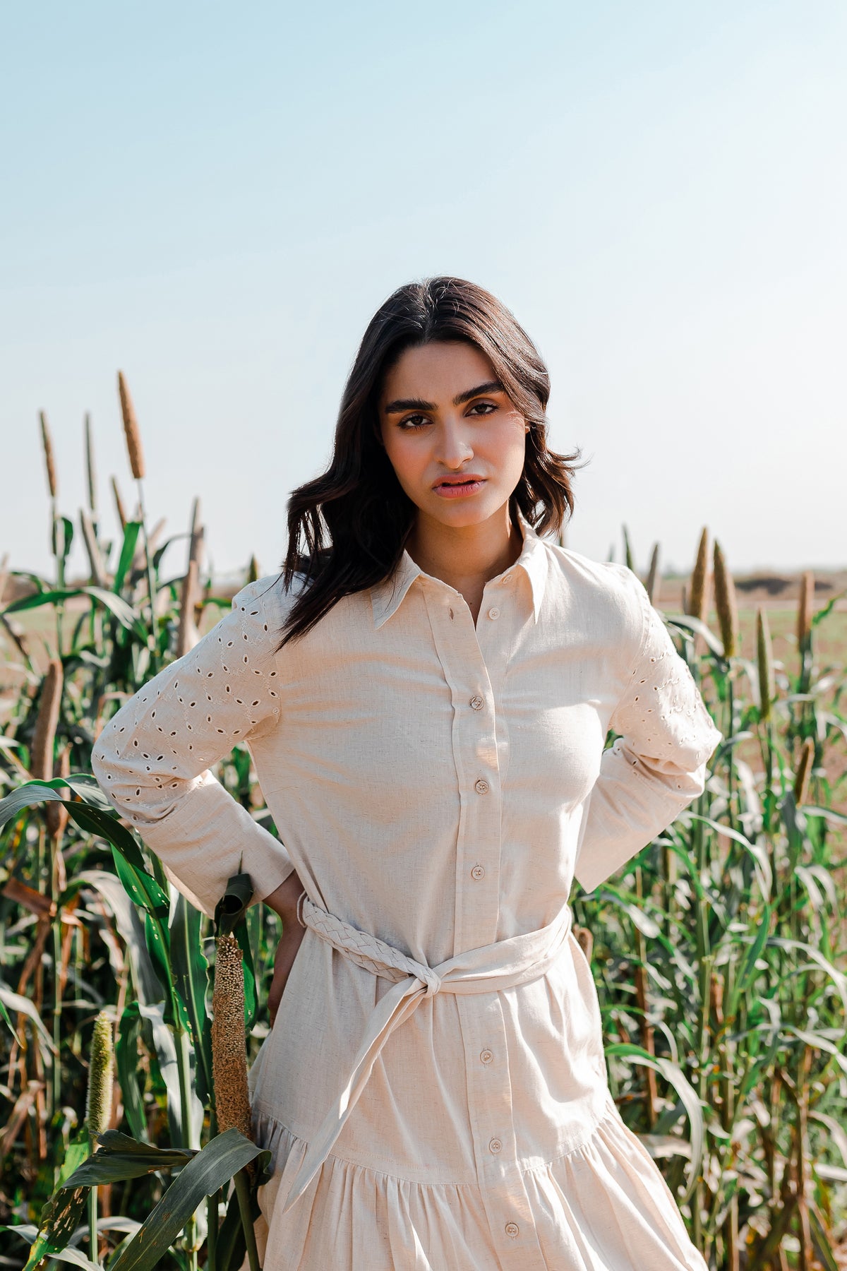Greige Button Down Dress with Gathers, made from 100% Cotton Linen in a comfortable 55:45 blend. This collared midi dress features a long yoke with elegant gathers, giving it a touch of sophistication. The dress is adorned with matching cutwork embroidery details on long sleeves with cuffs, adding a unique and stylish flair. It comes complete with a tie braided belt in the same fabric.