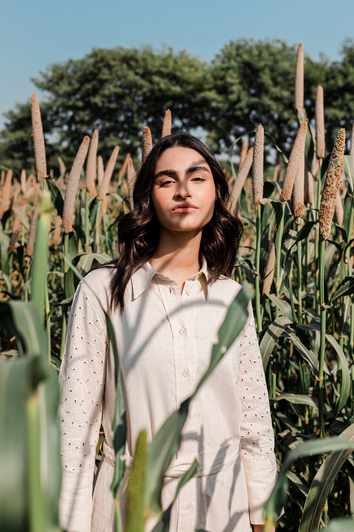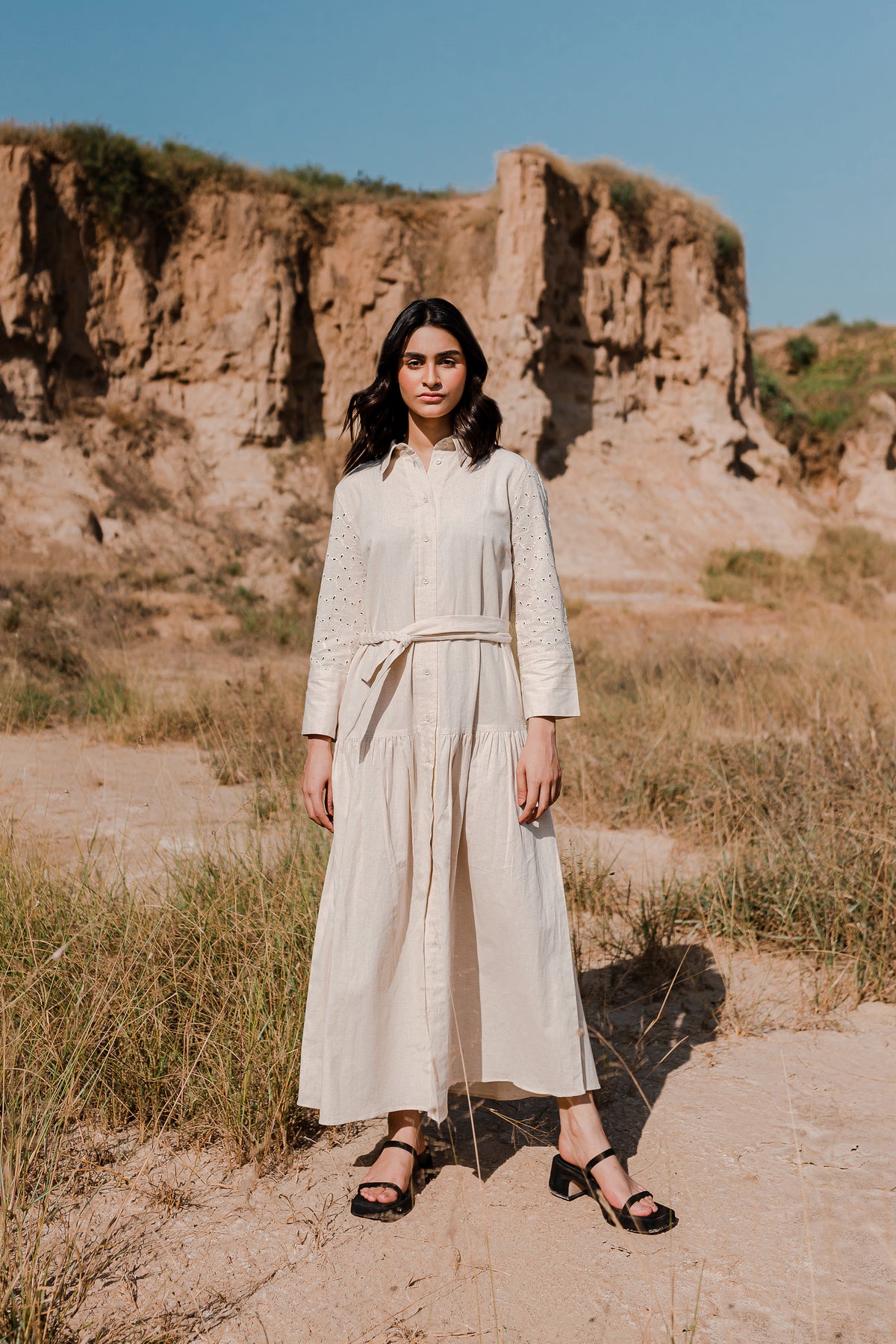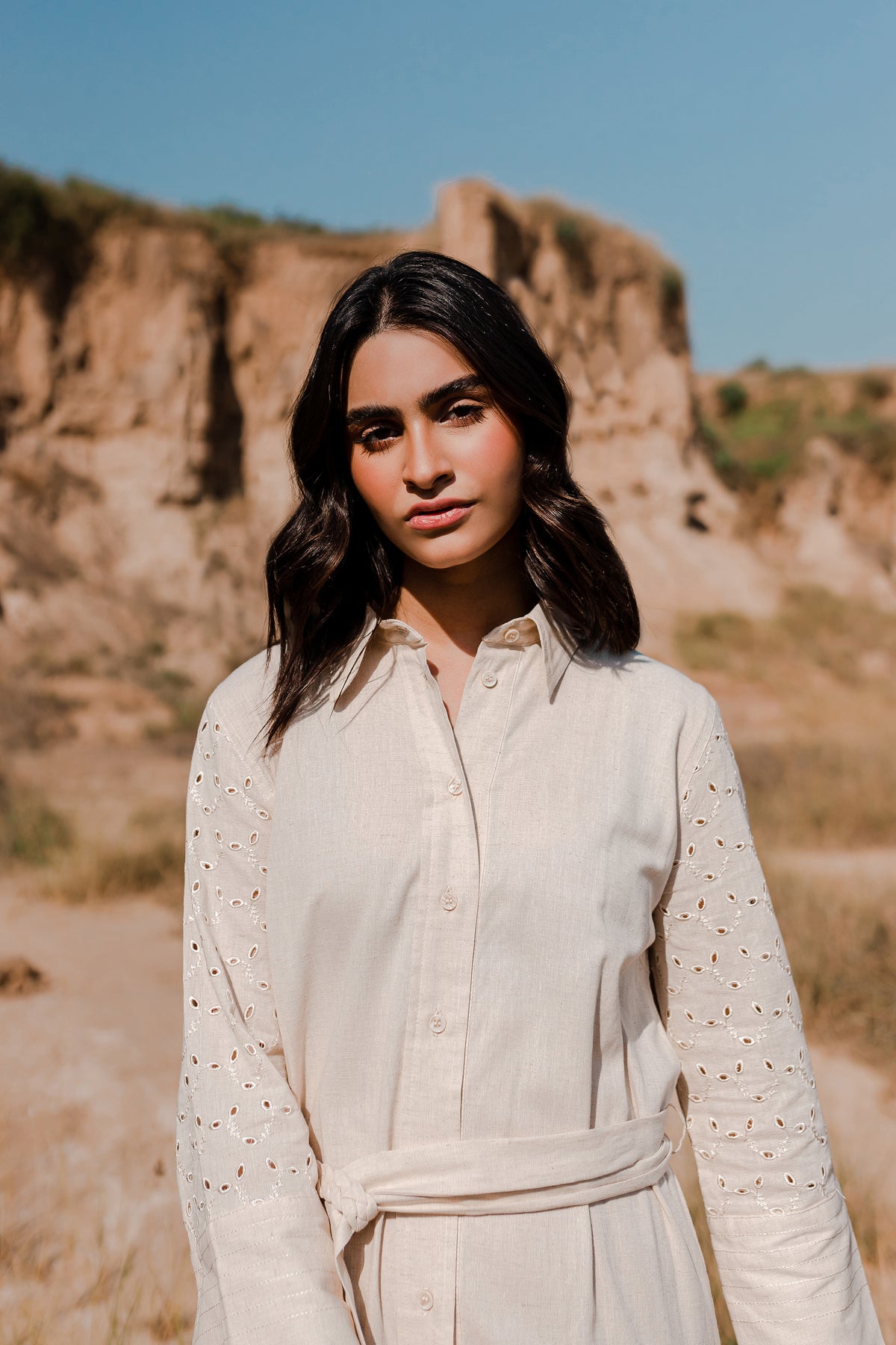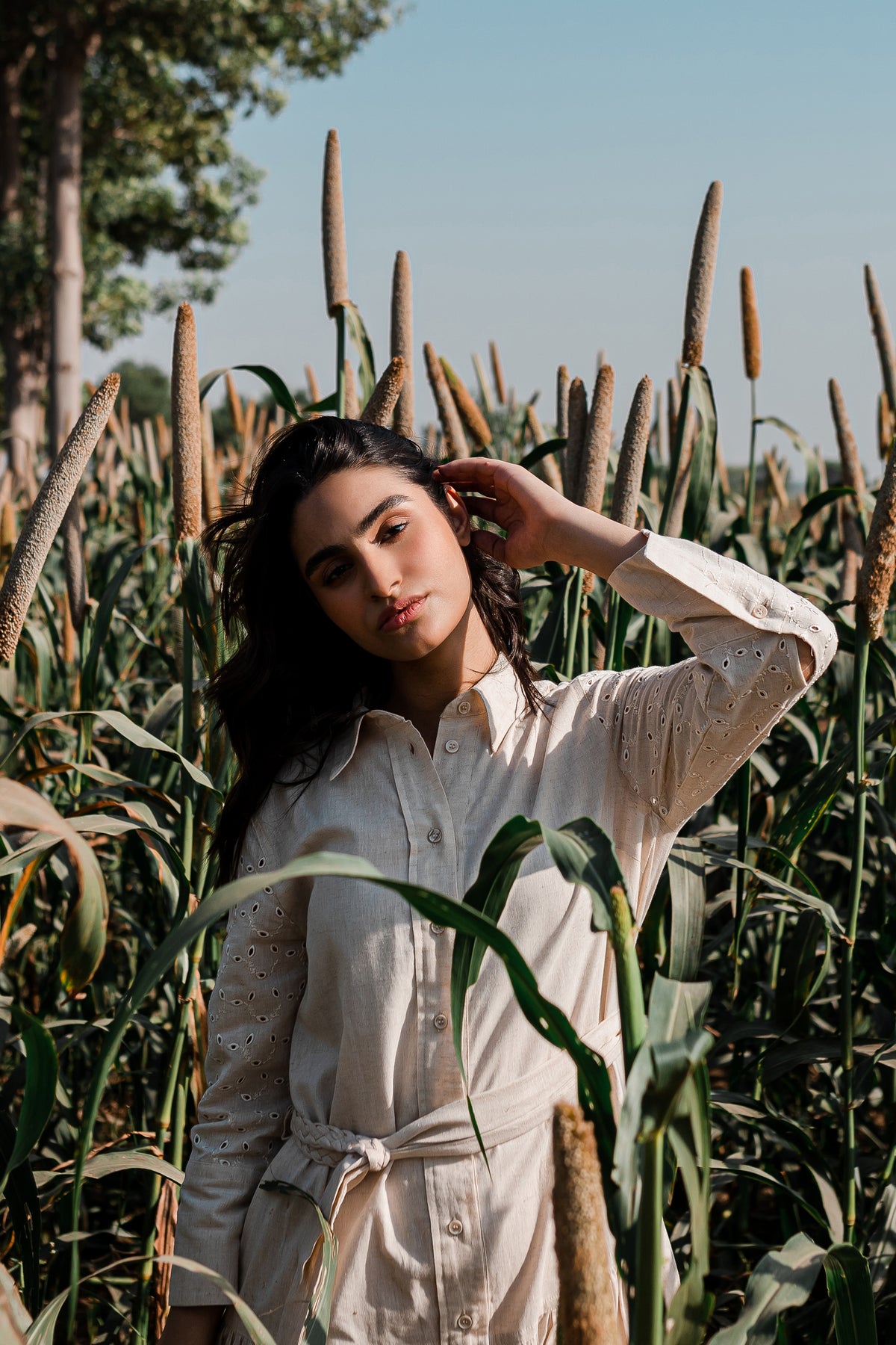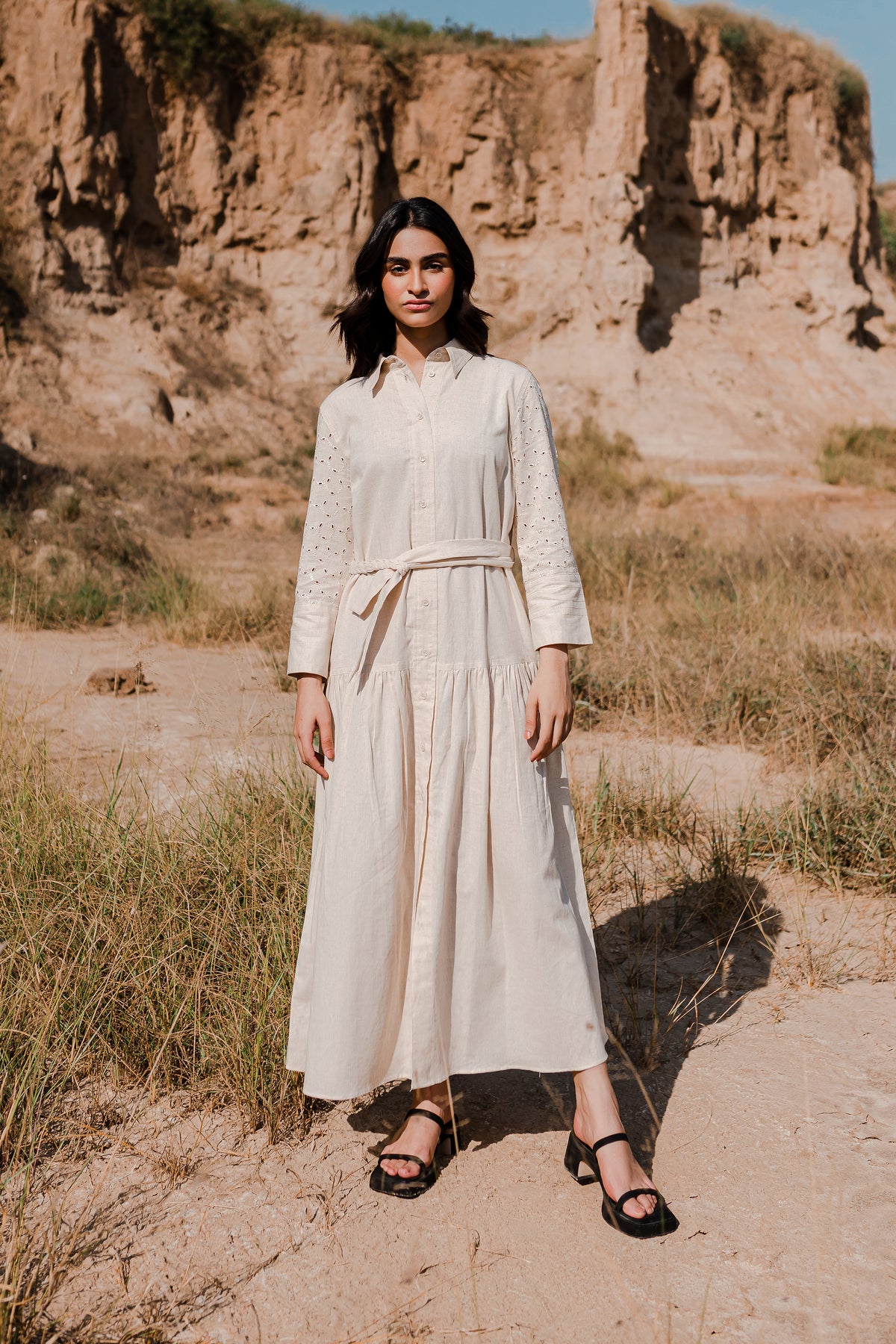 Greige Button Down Dress with Gathers, made from 100% Cotton Linen in a comfortable 55:45 blend. This collared midi dress features a long yoke with elegant gathers, giving it a touch of sophistication. The dress is adorned with matching cutwork embroidery details on long sleeves with cuffs, adding a unique and stylish flair. It comes complete with a tie braided belt in the same fabric.