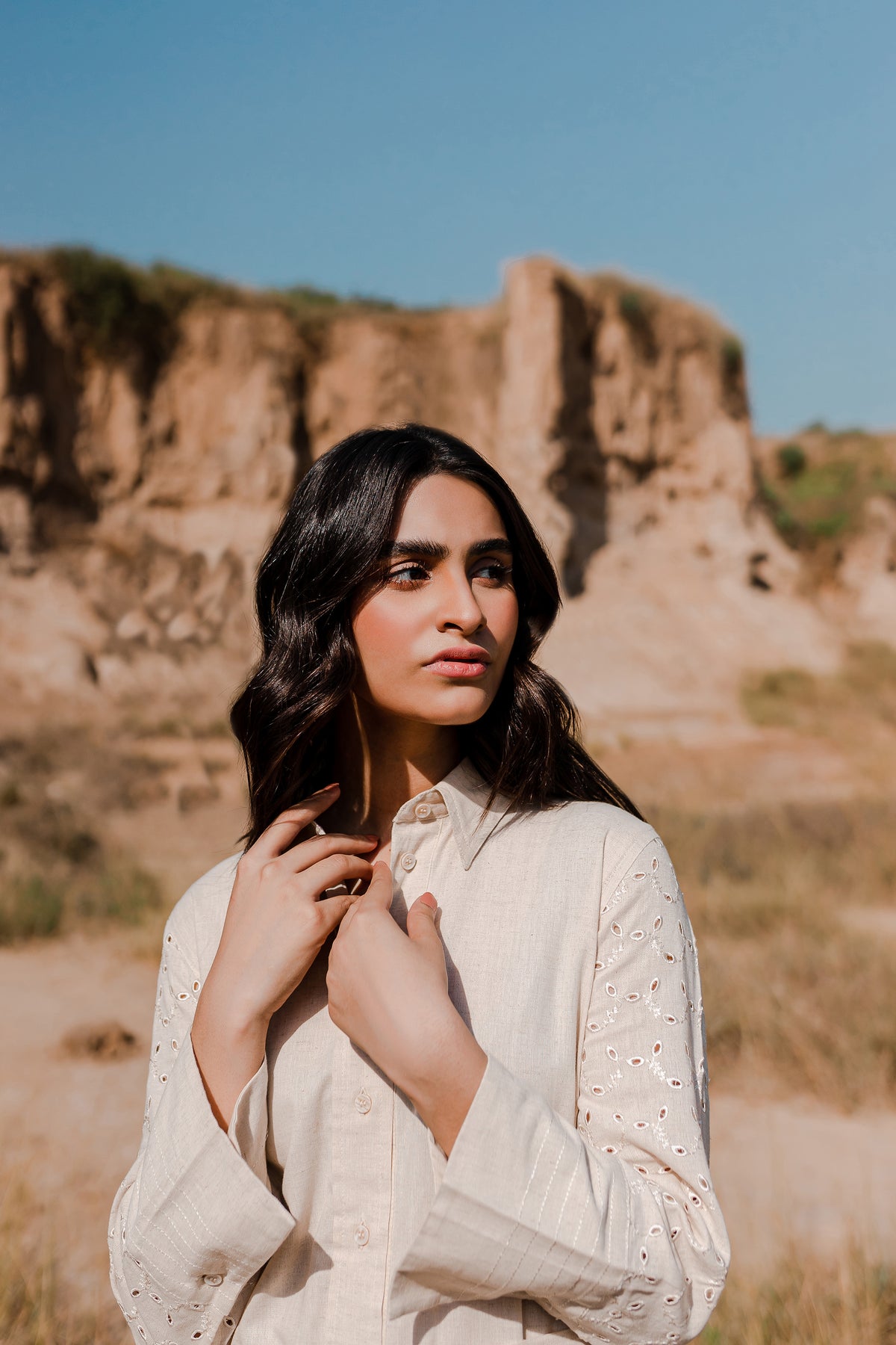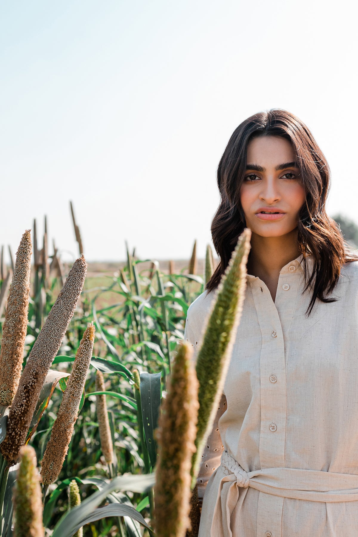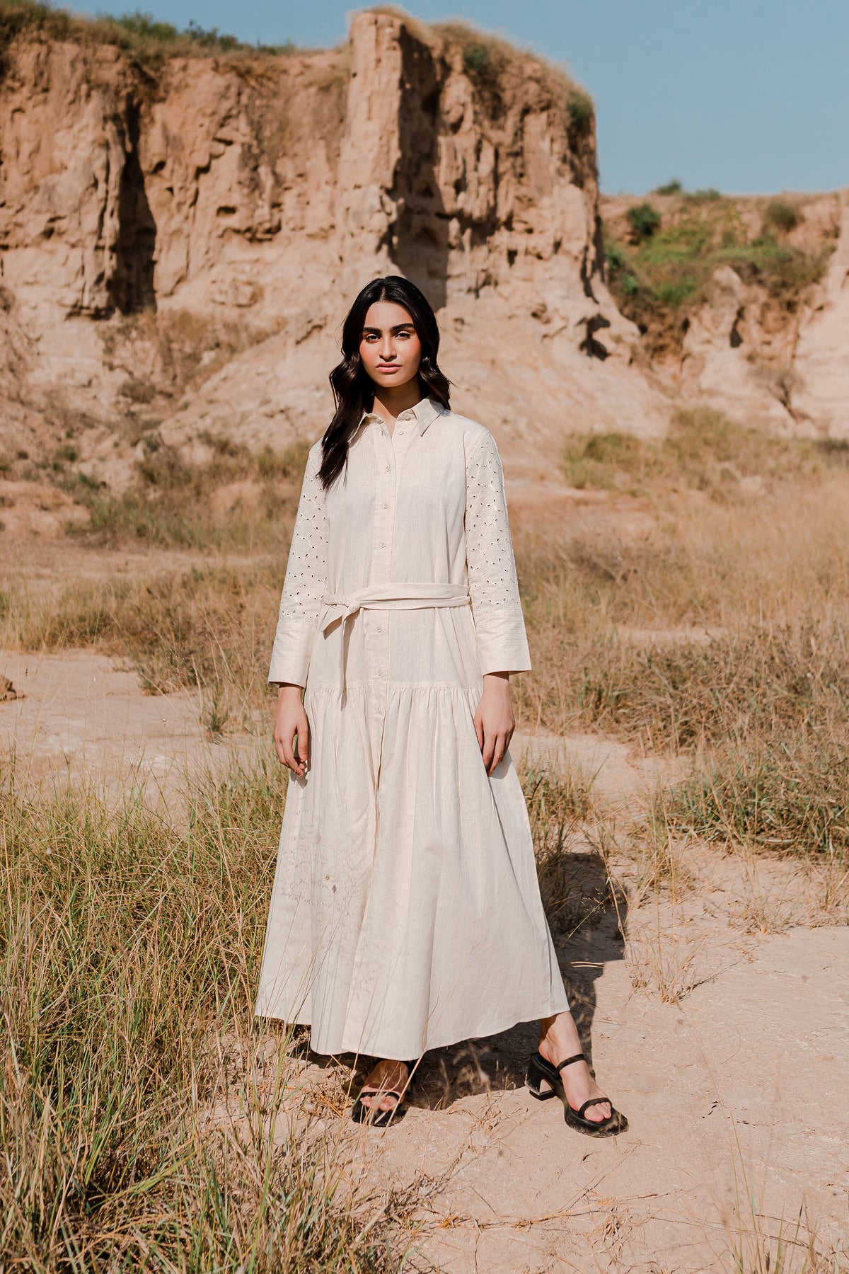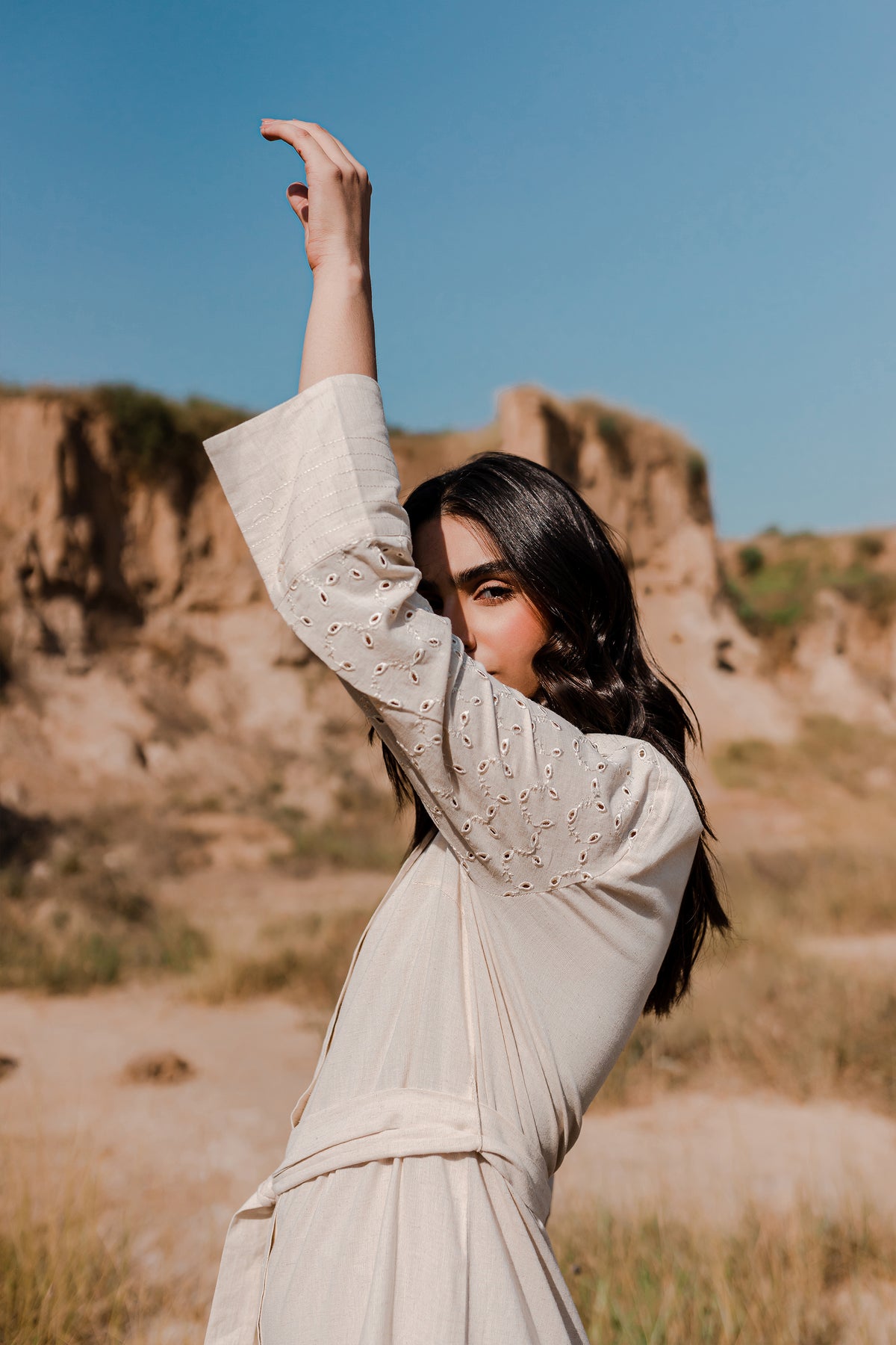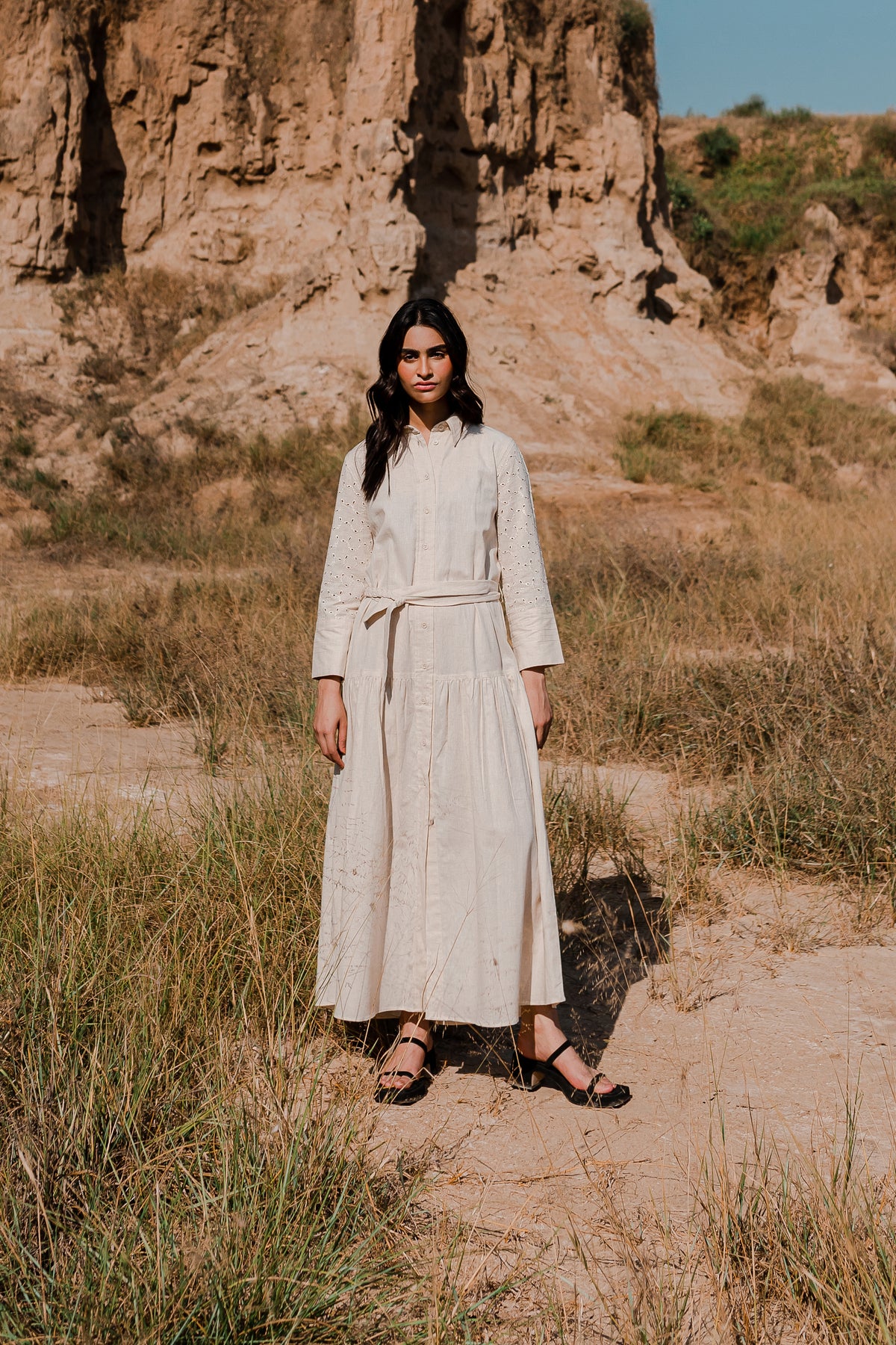 Greige Button Down Dress with Gathers, made from 100% Cotton Linen in a comfortable 55:45 blend. This collared midi dress features a long yoke with elegant gathers, giving it a touch of sophistication. The dress is adorned with matching cutwork embroidery details on long sleeves with cuffs, adding a unique and stylish flair. It comes complete with a tie braided belt in the same fabric.