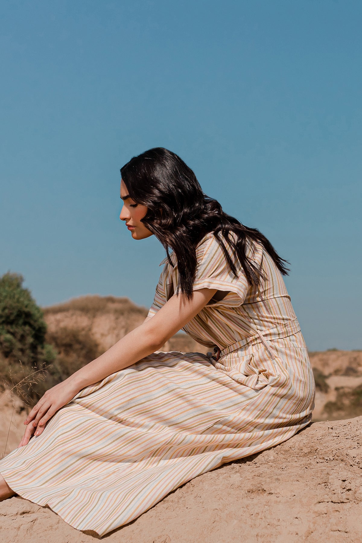 Discover a new dimension of style with our Multi Color Drop Shoulder Dress. This midi dress is a perfect blend of classic and modern elements. It features a Johnny collar for an elegant touch, and the drop shoulder design with short turn-up sleeves adds a contemporary twist.