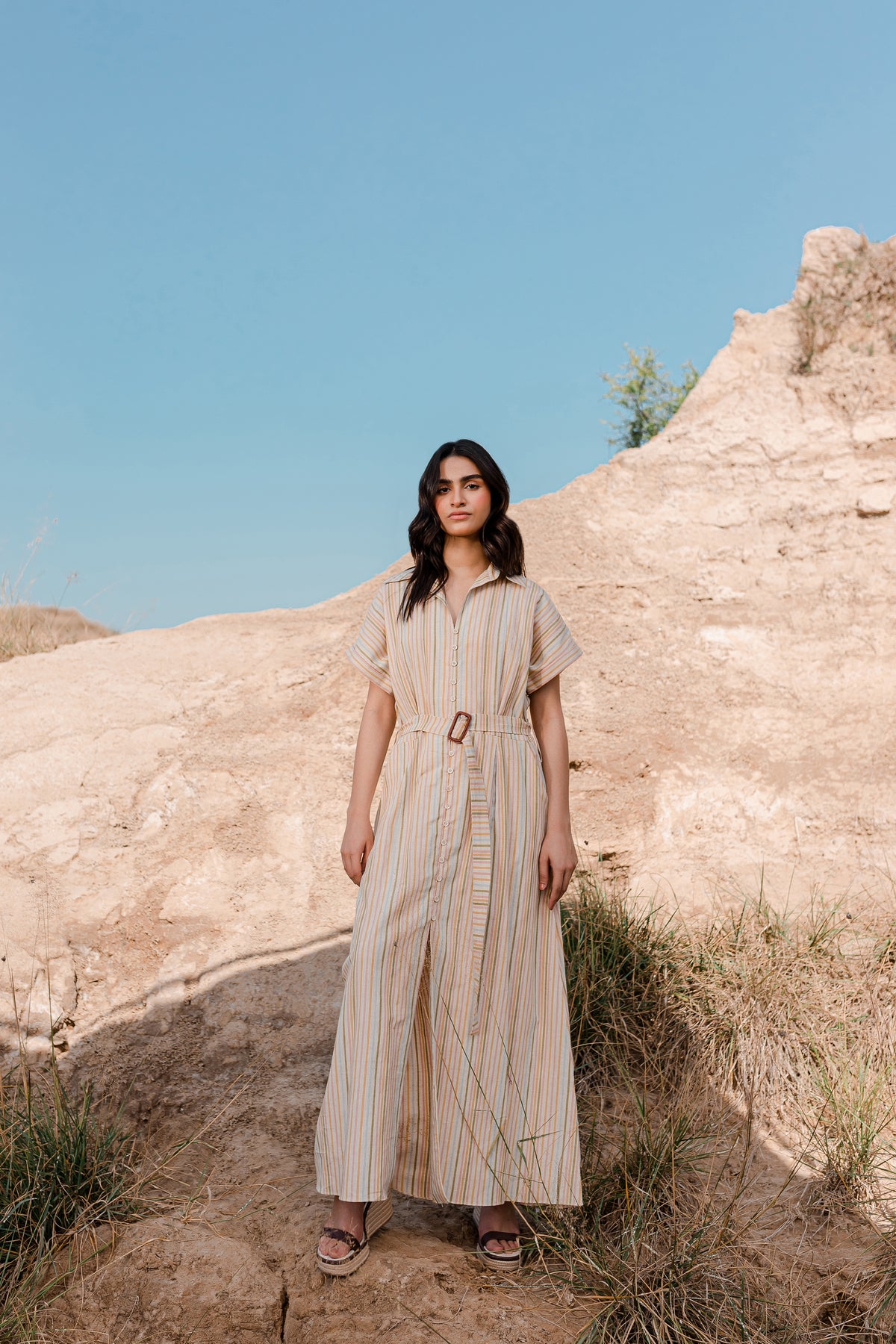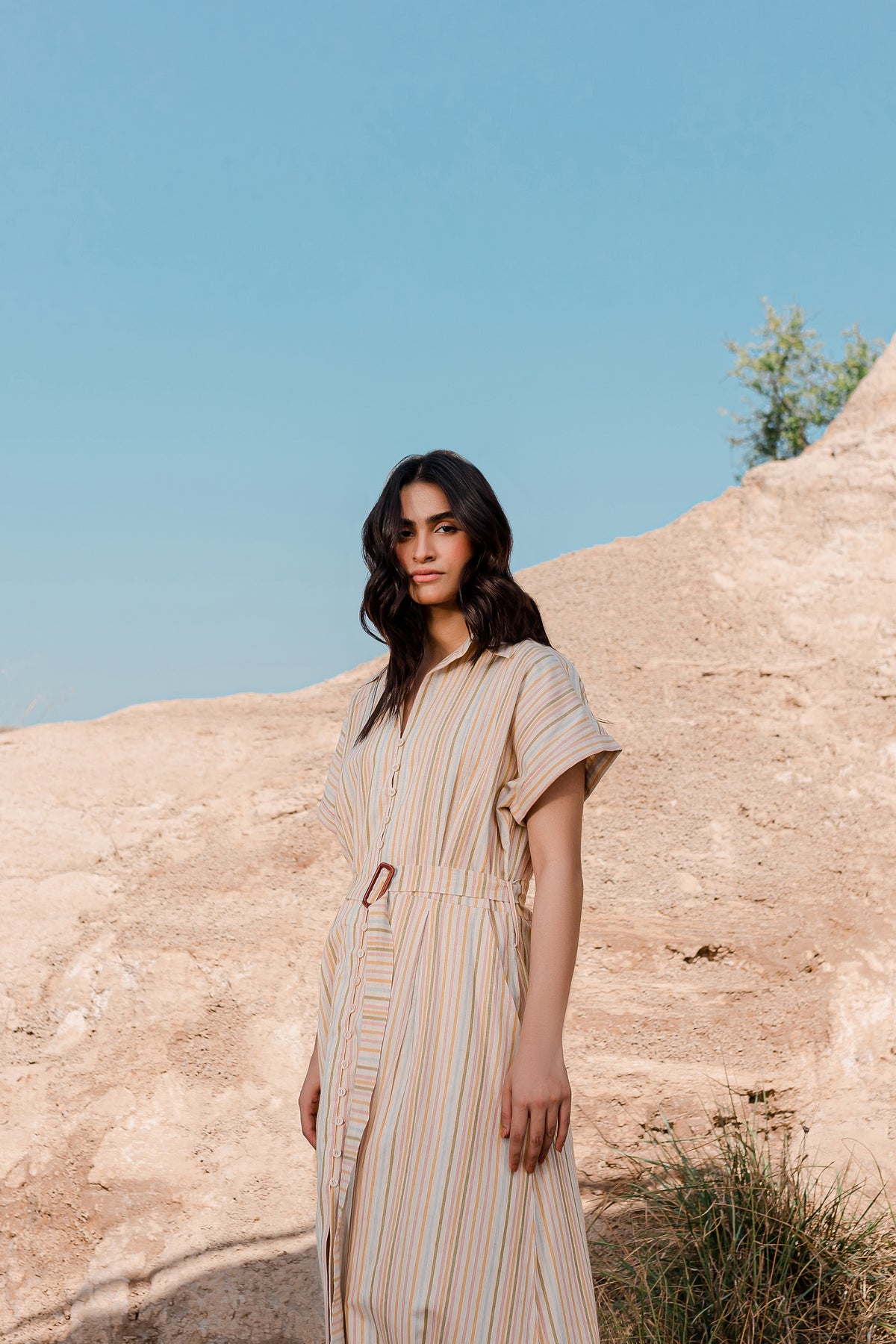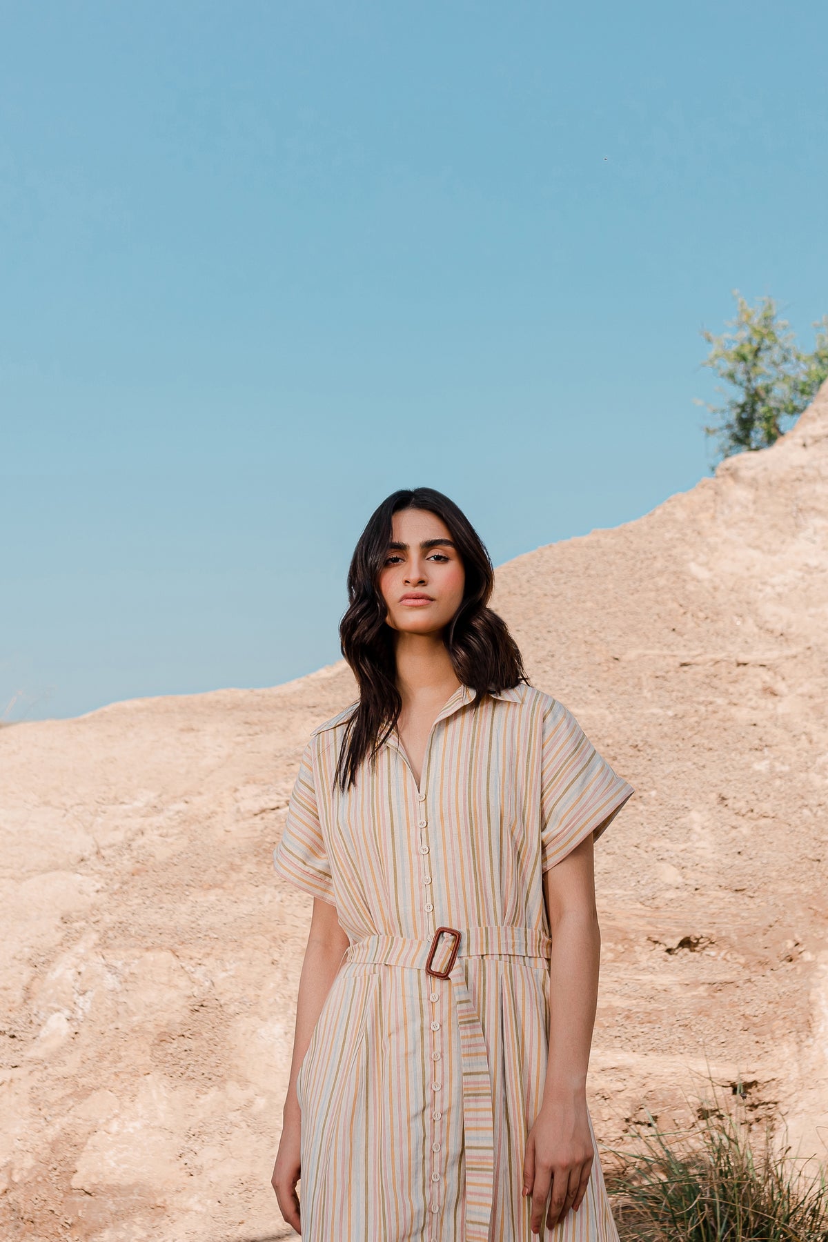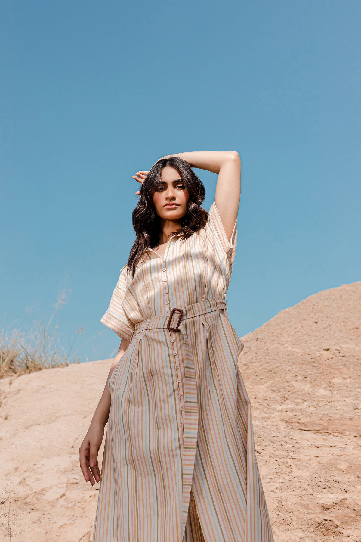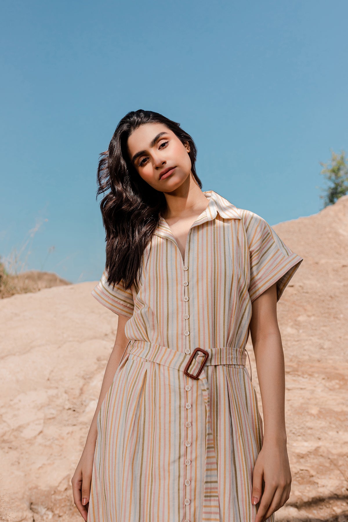 The front of the dress is adorned with a box-pleated yoke and button fastening, giving it a unique and eye-catching appeal. You'll find a coordinating buckle belt crafted from the same fabric, allowing you to define your waist and create a chic silhouette. This dress is perfect for a range of occasions, offering both fashion and comfort in one elegant package.