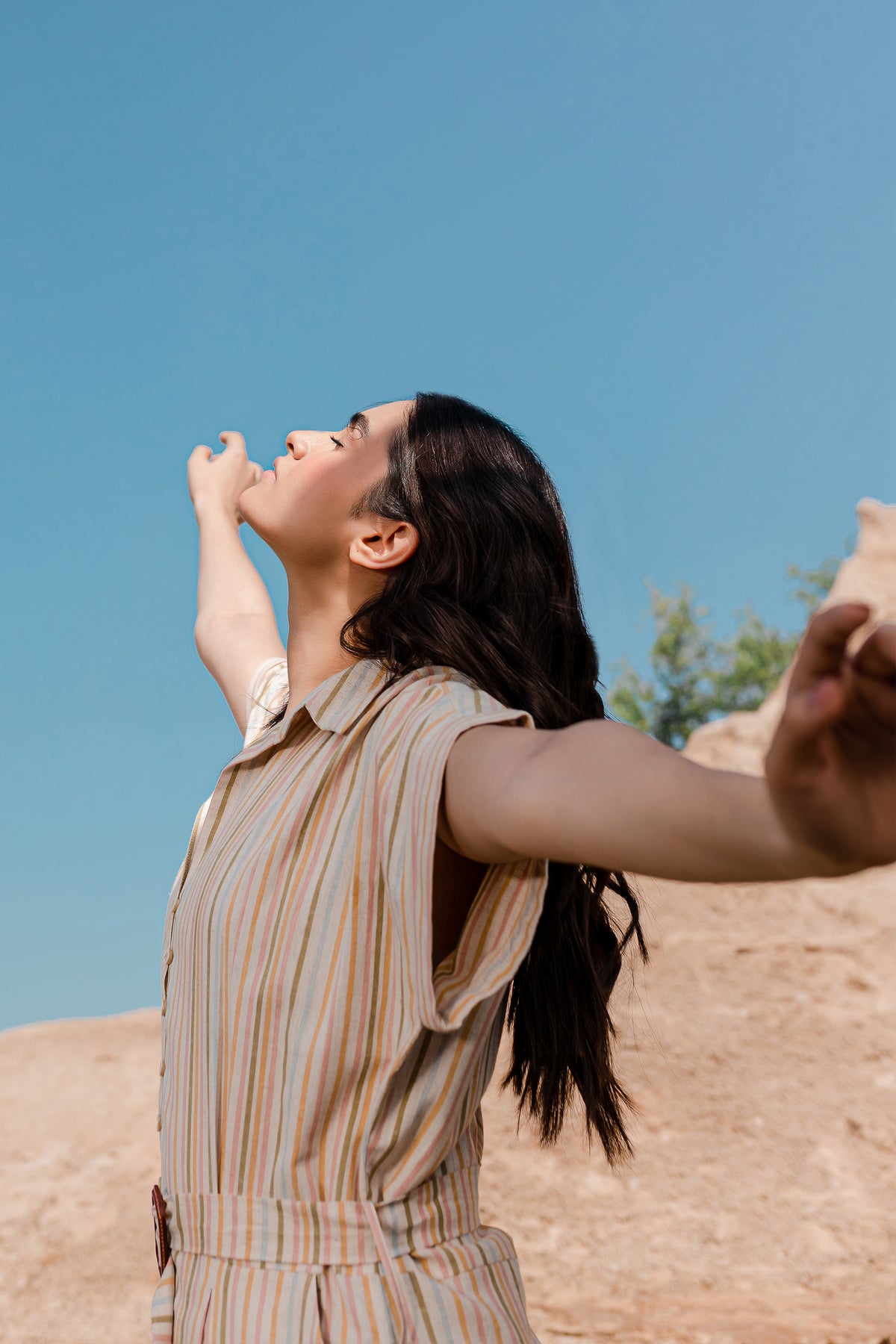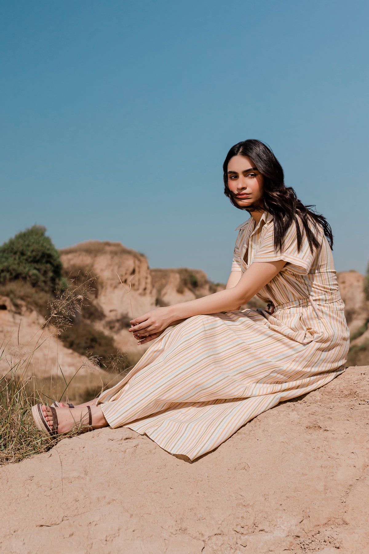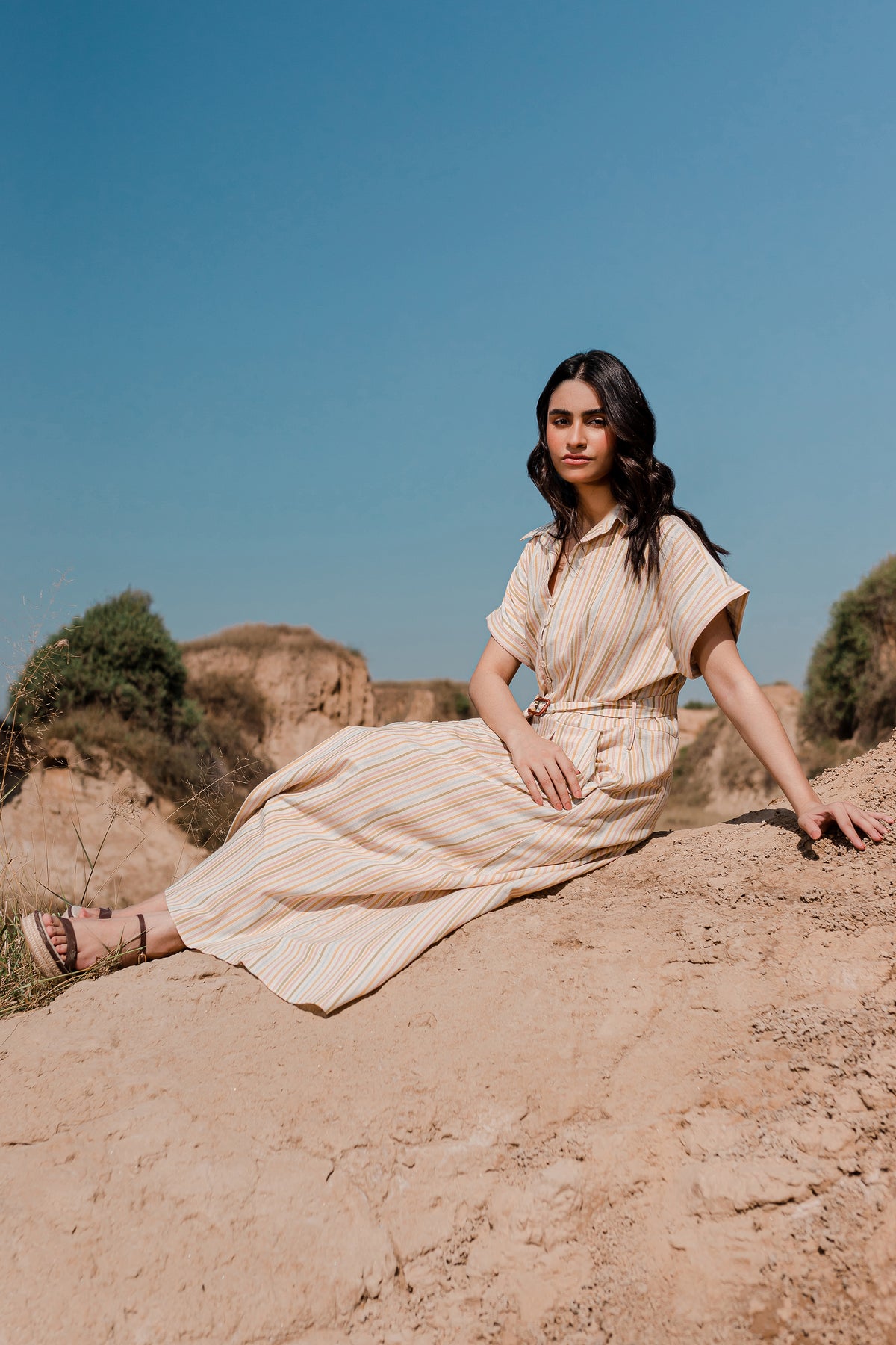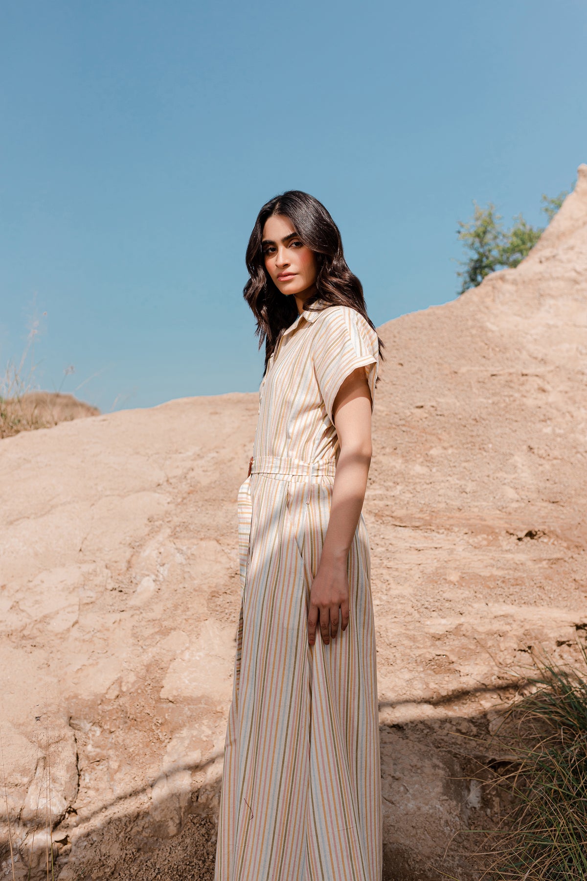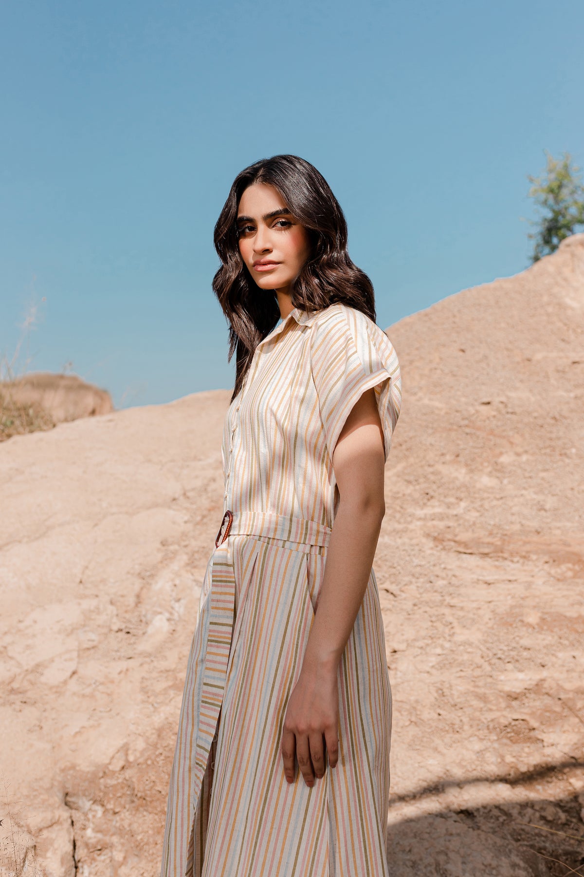 The front of the dress is adorned with a box-pleated yoke and button fastening, giving it a unique and eye-catching appeal. You'll find a coordinating buckle belt crafted from the same fabric, allowing you to define your waist and create a chic silhouette. This dress is perfect for a range of occasions, offering both fashion and comfort in one elegant package.