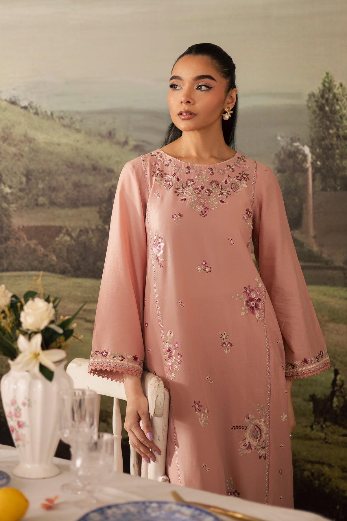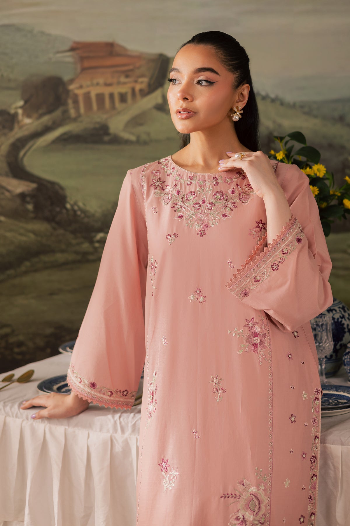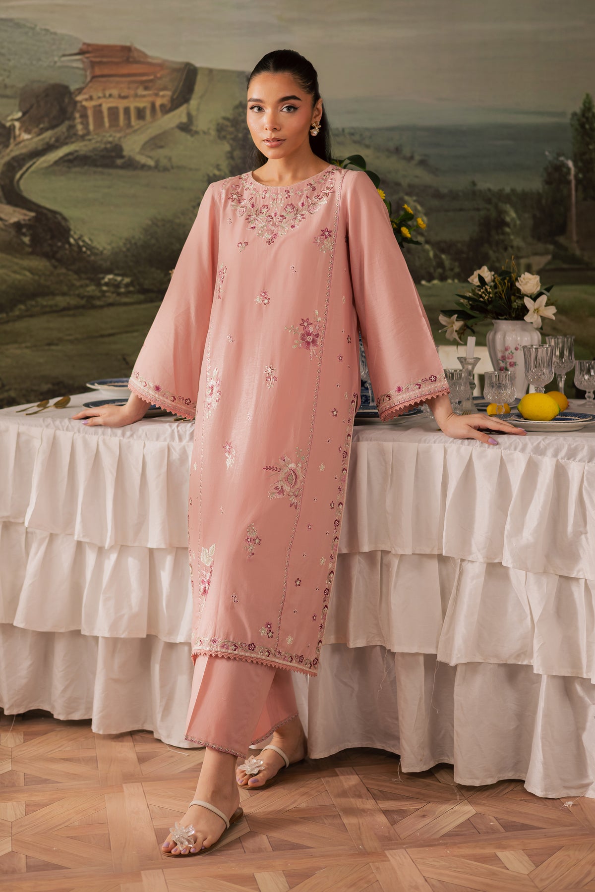 A straight, long paneled taffy pink pima lawn shirt featuring filled embroidered motifs on the front, creating a rich and textured look. The boat neckline is delicately embroidered, while the side panels and borders extending till the chak are adorned with intricate detailing, adding depth and structure to the silhouette. The flared sleeves are kept simple with a touch of embroidery, finished with soft crochet lace at the hem for an added artisanal finish.