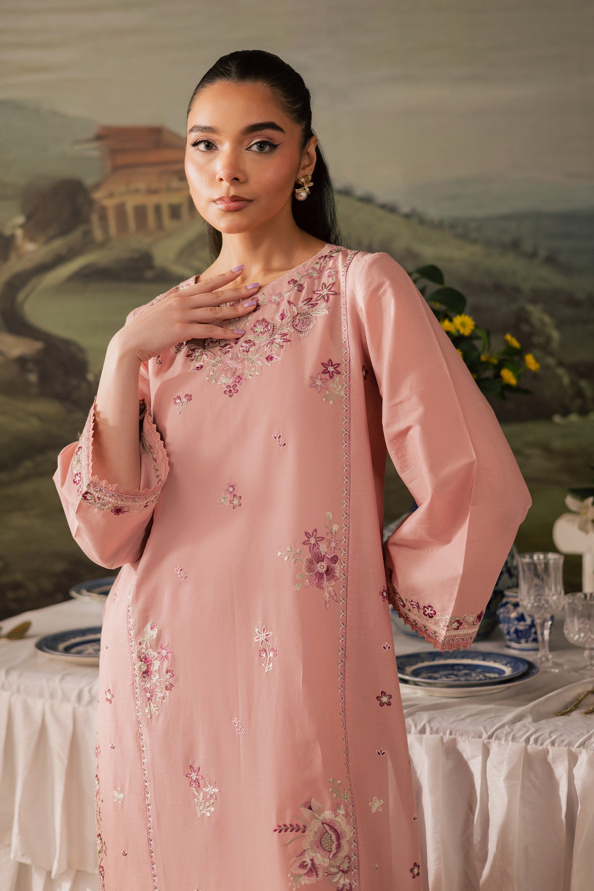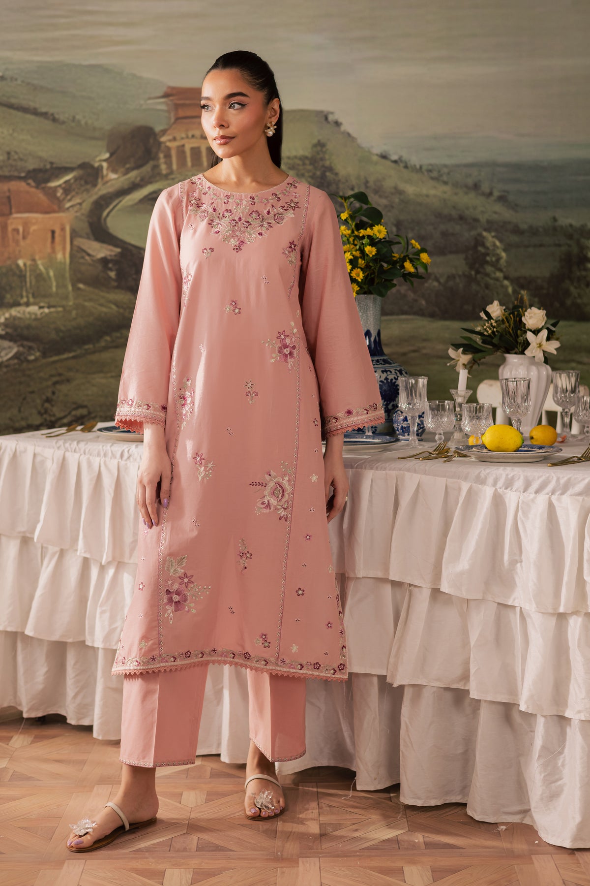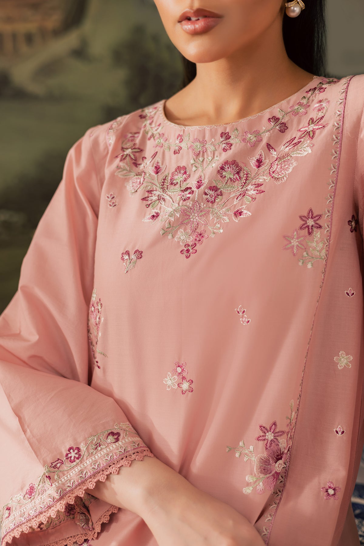 A straight, long paneled taffy pink pima lawn shirt featuring filled embroidered motifs on the front, creating a rich and textured look. The boat neckline is delicately embroidered, while the side panels and borders extending till the chak are adorned with intricate detailing, adding depth and structure to the silhouette. The flared sleeves are kept simple with a touch of embroidery, finished with soft crochet lace at the hem for an added artisanal finish.